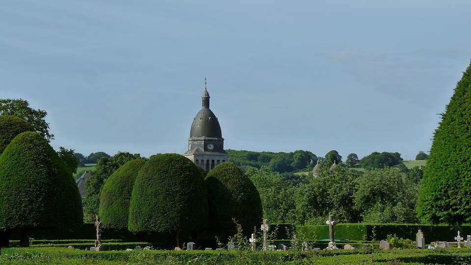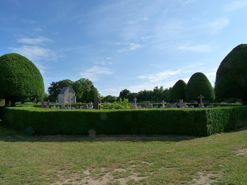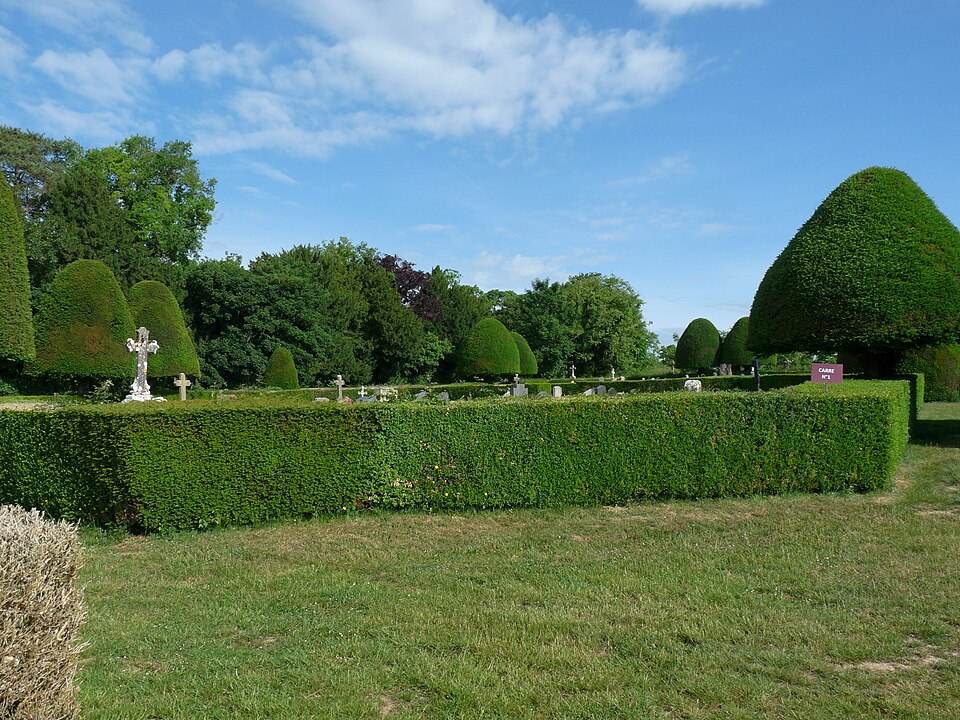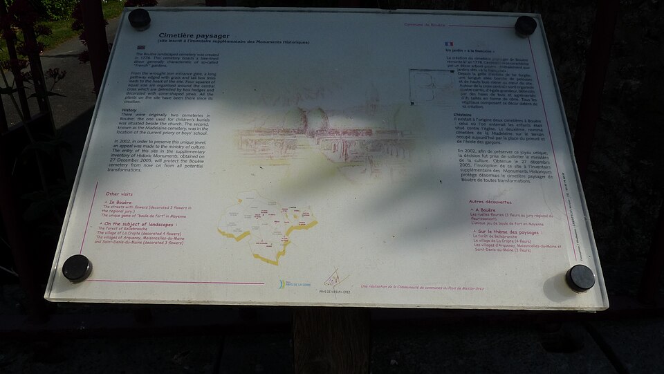 Le cimetière communal de Bouère (Mayenne) se distingue par son décor de type jardin à la française, composé de buis et d’ifs centenaires. Il adopte un plan en quadrilatère divisé en quatre carrés aux angles abattus, bordés de haies de buis et traversés par des allées disposées en croix, ponctuées d’ifs taillés. Un petit oratoire a été construit à l’angle sud‑ouest en 1810. À l’origine, la commune possédait deux cimetières : celui attenant à l’église, où l’on enterrait les enfants, et le cimetière de la Madeleine. Le cimetière actuel a été créé en 1778 à l’initiative du curé René‑Robert Bourdet et béni par l’évêque du Mans, François‑Gaspard de Jouffroy de Gonsans, vers 1780. La végétation, la géométrie et la forme du site sont protégées au titre des monuments historiques ; l’ensemble a été inscrit en 2005. S’y trouvent notamment les tombes de René‑Robert Bourdet, curé de Bouère et député aux États généraux de 1789 ; de Marin‑Pierre Gaullier, chef chouan, et de son fils Pierre Gaullier ; de Marcellin Eucher Pourpe, officier d’infanterie (né en 1814 à Cucuron, mort en 1878 à Bouère et chevalier de la Légion d’honneur en 1852) ; ainsi que de l’acteur Robert Hirsch, inhumé en 2017.
