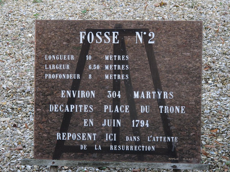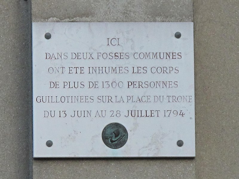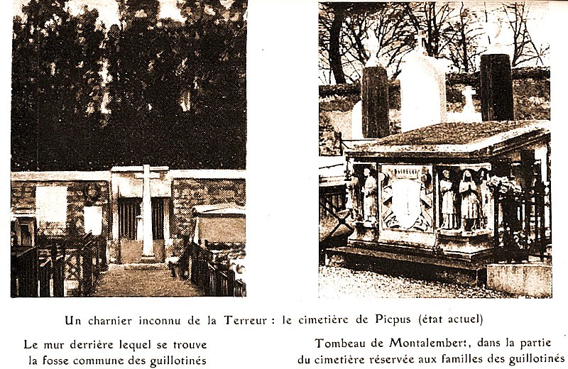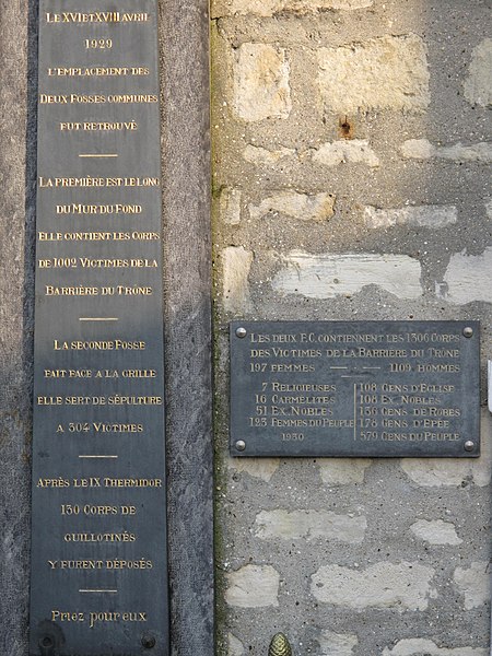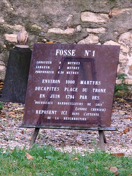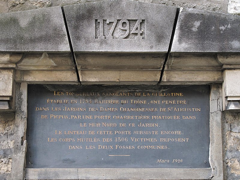 Le cimetière de Picpus occupe une partie de l'ancien couvent des chanoinesses de Saint‑Augustin, dont les religieuses furent expulsées en 1792 et dont les bâtiments, réquisitionnés comme bien national, furent utilisés comme maison de santé par Coignard. En juin‑juillet 1794, pendant la Terreur, une portion du jardin servit à l'inhumation des victimes exécutées place du Trône renversé : deux fosses communes recueillirent au total 1 306 corps. Les fosses, creusées dans la partie nord‑est du jardin, furent successivement remplies ; une troisième fosse découverte en 1929 ne semble pas avoir été utilisée. Les fossoyeurs utilisèrent la chapelle du couvent comme bureau, et les noms des 1 306 personnes furent gravés sur deux plaques de marbre placées près du chœur. Le domaine fut vendu et divisé à la fin du XVIIIe siècle ; le terrain contenant les fosses fut revendu dès 1796, puis acquis par des familles de victimes grâce à une souscription lancée en 1802, ce qui permit de préserver ce lieu. Un cimetière privé, réservé aux descendants de ces familles, fut créé à la suite des fosses ; la première inhumation y eut lieu en 1805. Dès 1805, les Sœurs de la Congrégation des Sacrés‑Cœurs et de l'Adoration Perpétuelle s'installèrent dans les bâtiments reconstruits du couvent et assurent depuis le service religieux du lieu. Une chapelle dédiée à Notre‑Dame‑de‑la‑Paix, située à l'entrée, permet la célébration des offices ; elle abrite la liste des victimes et la statue de la Vierge. Parmi les personnes inhumées figurent Gilbert du Motier, marquis de La Fayette, inhumé aux côtés de son épouse Adrienne de Noailles, ainsi que 1 306 victimes de la Terreur, dont notamment les seize Carmélites de Compiègne, les poètes André Chénier et Jean‑Antoine Roucher, l'architecte Richard Mique, Alexandre de Beauharnais et plusieurs personnalités ecclésiastiques et aristocratiques. De nombreuses familles représentées au comité fondateur de 1802 continuent d'utiliser le cimetière comme lieu d'inhumation, et des plaques commémoratives évoquent aussi des membres déportés et morts pendant la Seconde Guerre mondiale. La Fayette repose sous la terre rapportée de Brandywine ; un drapeau américain flotte en permanence sur sa tombe et est renouvelé chaque 4 juillet depuis 1917 par des sociétés commémoratives. La communauté religieuse prie pour les victimes et, selon la volonté des fondateurs, pour leurs bourreaux, faisant du site un lieu de mémoire, de méditation et de pardon. Pendant la Commune de Paris, la communauté de Picpus fut de nouveau frappée : plusieurs pères furent pris en otage et exécutés. Le jardin, les fosses et le mur d'enceinte sont protégés au titre des monuments historiques, inscription effective en 1998. Situé 35, rue de Picpus dans le 12e arrondissement, ce cimetière privé se visite l'après‑midi du lundi au samedi, de 14 h à 17 h.