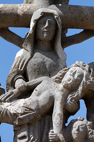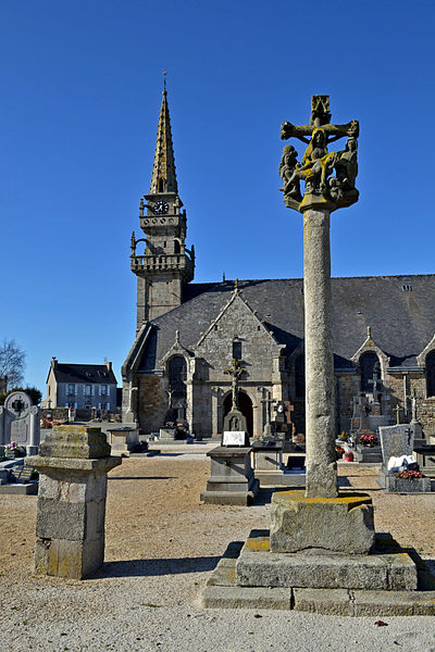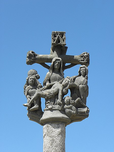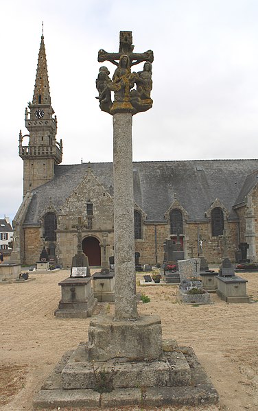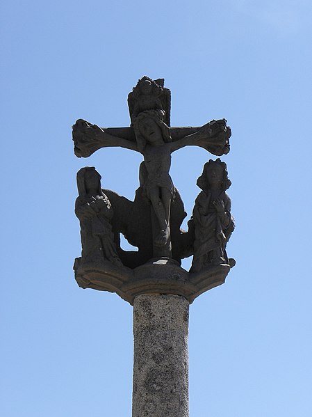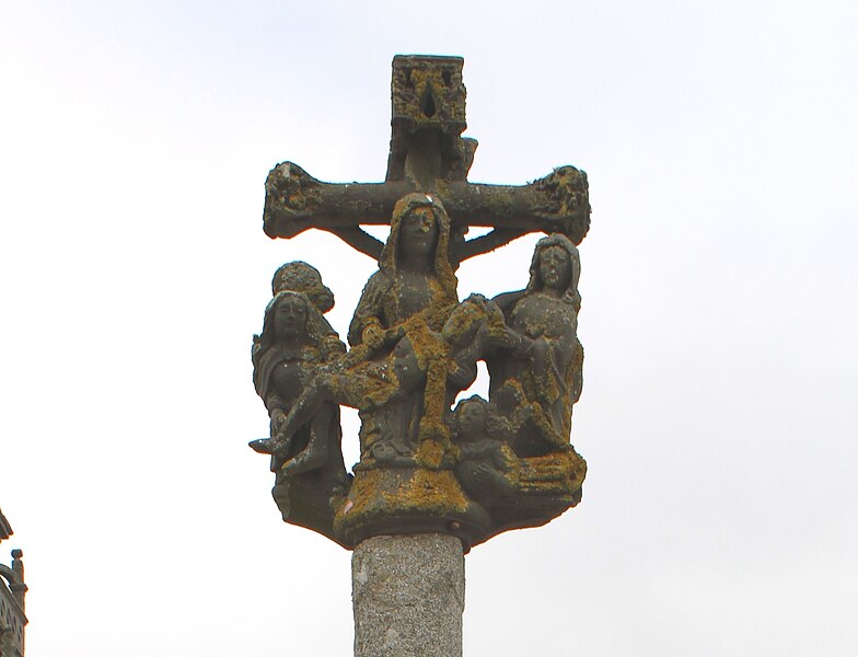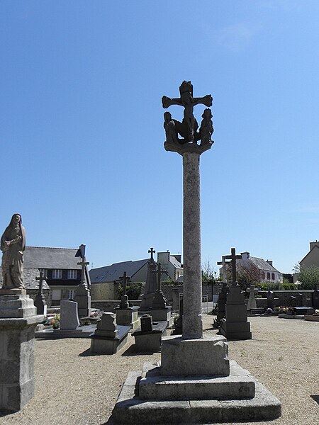 Le calvaire gothique s'élève sur deux gradins carrés qui portent le socle dont les arêtes supérieures sont abattues par quatre motifs d'acanthe, transformant sa section supérieure en octogone. La base et le sommet du fût sont quadrangulaires tandis que le reste du fût est de section circulaire. À l'avers, le Christ est représenté entre la Vierge et saint Jean ; au sommet du croisillon, un ange se penche vers la tête du Christ. Au revers, la Vierge de douleur est figurée entre deux saintes femmes ; le corps du Christ, à demi allongé sur les genoux de la Vierge, est soutenu par les trois femmes tandis qu'un ange tient son poignet gauche. La Pietà est abritée par un dais orné de pinacles et de crochets. L'ossuaire, daté du XVIIIe siècle, est un exemple représentatif de ce type d'ouvrage dans le Léon à cette époque. Il comporte quatre niches voûtées en plein cintre et une tablette en granit court d'un bout à l'autre de l'édifice ; sur cette tablette reposaient primitivement les petites châsses en bois contenant le chef des défunts après exhumation. Deux croix de granit surmontent le faîtage aux extrémités.