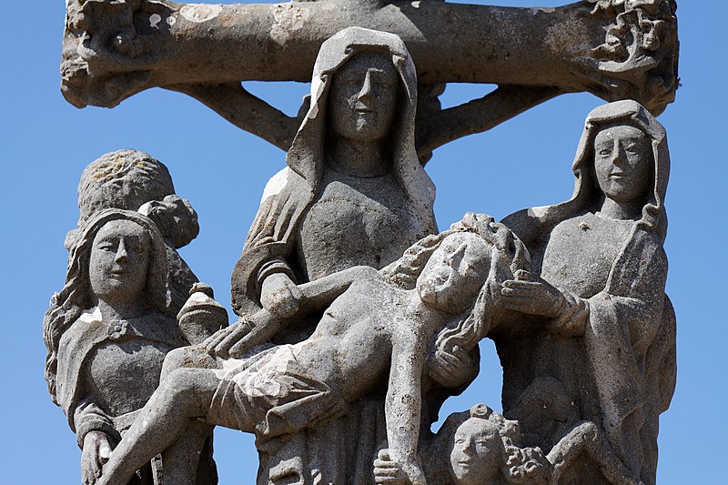 Édification du calvaire gothique avec des motifs d'acanthe et des sculptures représentant le Christ et la Vierge.