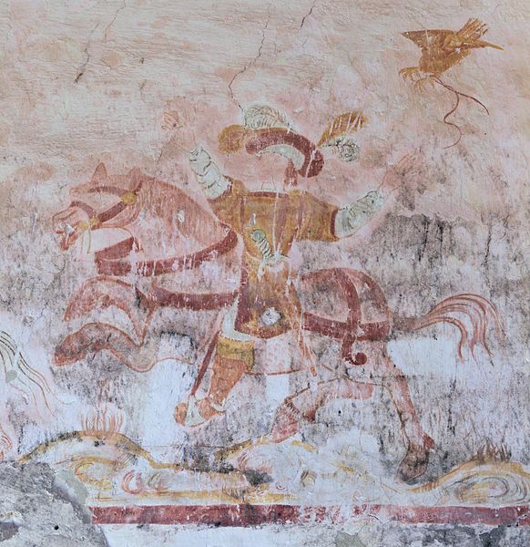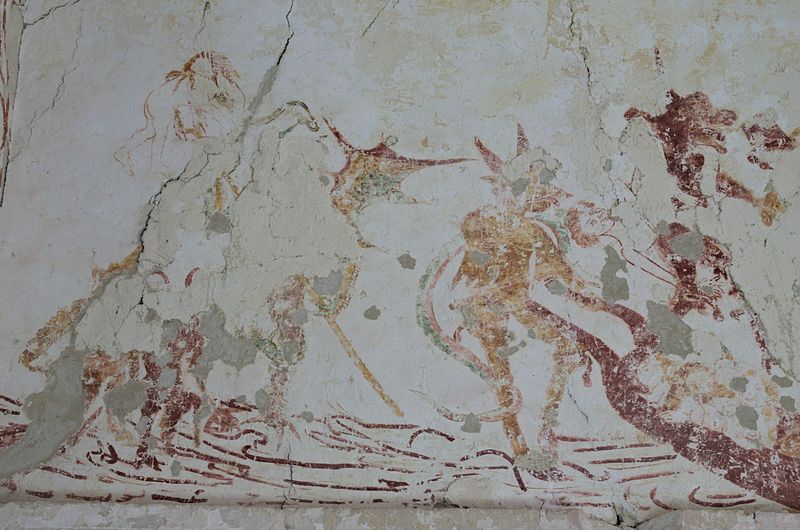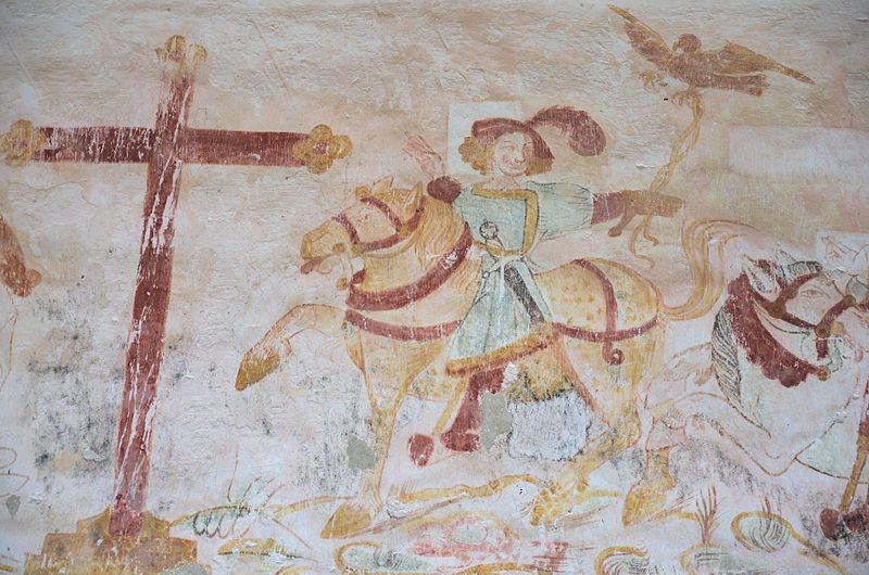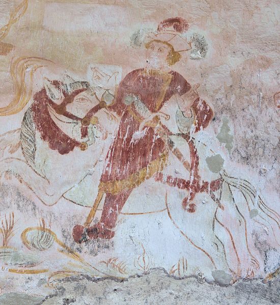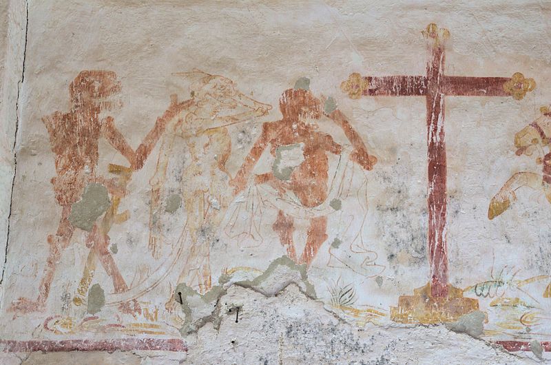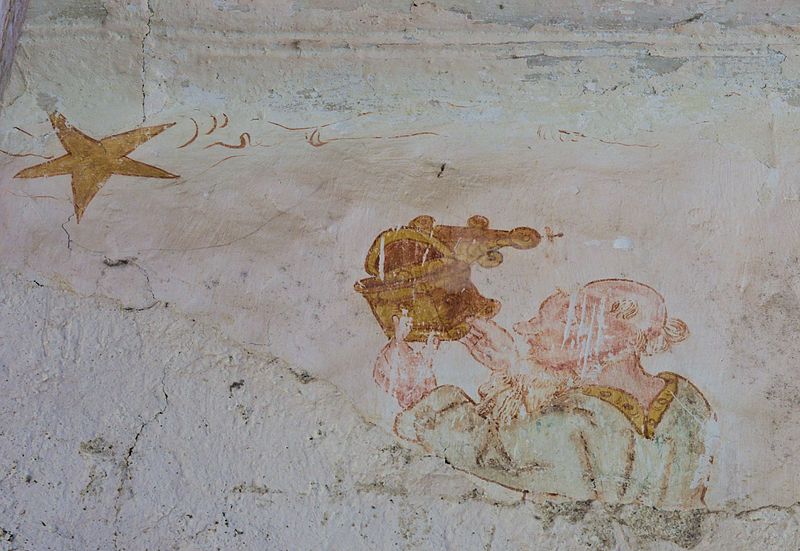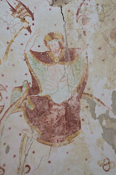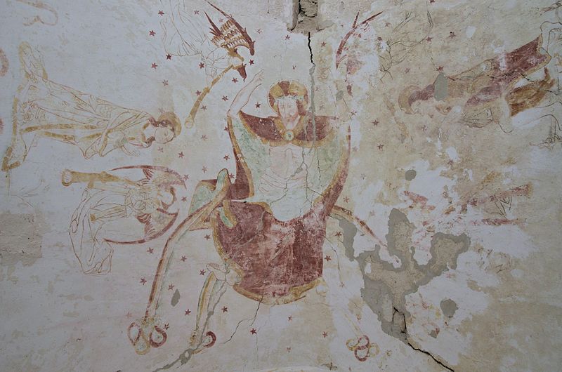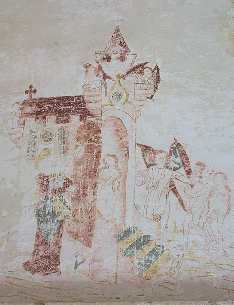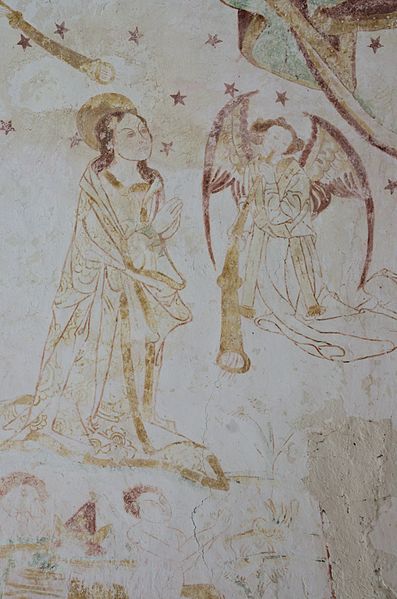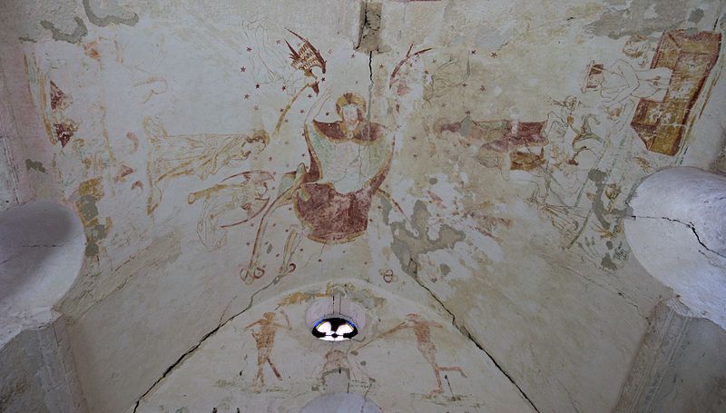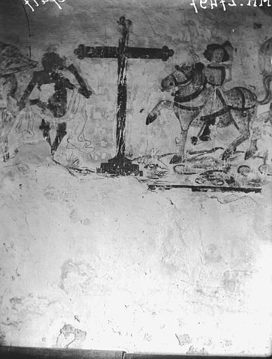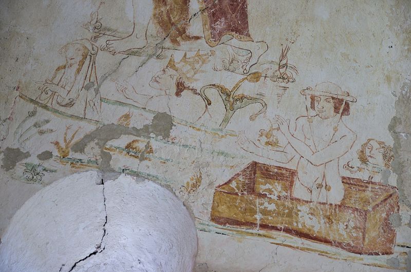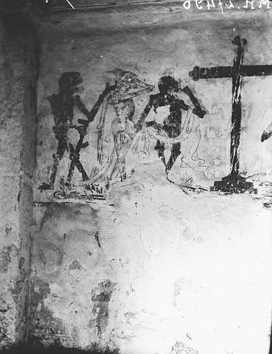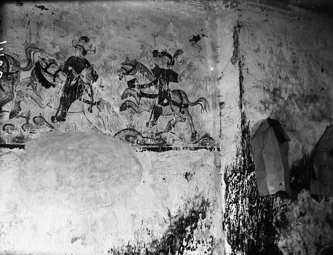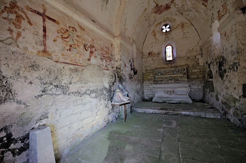 L'intérieur conserve des peintures murales partiellement lisibles, dont la datation varie selon les sources entre le XVe siècle et la première moitié du XVIe siècle. Ces fresques présentent un ensemble iconographique riche : la Vierge, des scènes de résurrection des laïcs et des clercs, le Christ de l'Apocalypse, Jean-Baptiste, la légende des trois morts et des trois vifs, l'arrivée des élus au paradis, l'entrée des damnés en enfer, le jugement dernier, ainsi que la représentation des rois mages et du donateur. Certaines compositions sont localisées dans le chœur, d'autres dans la nef, selon les descriptions anciennes.