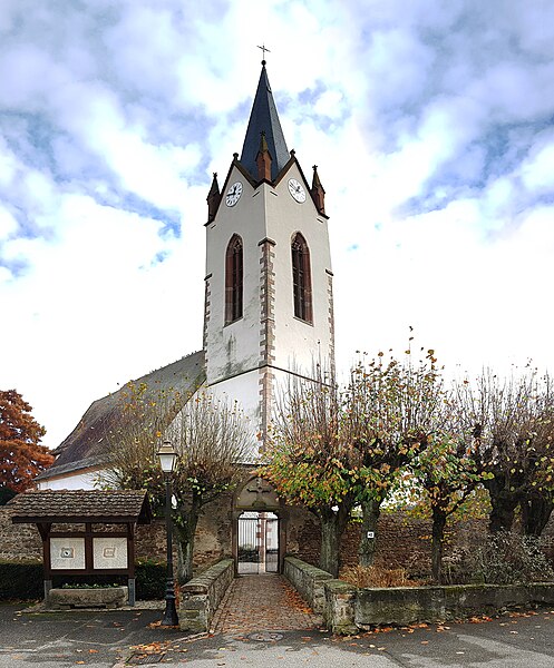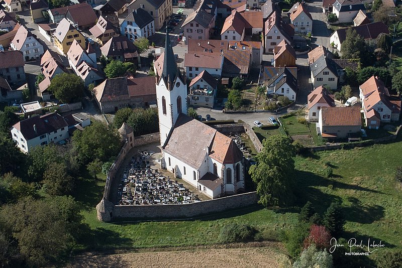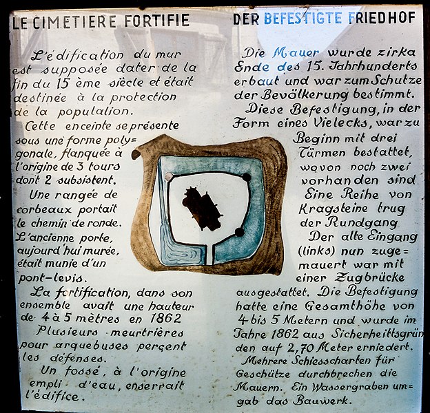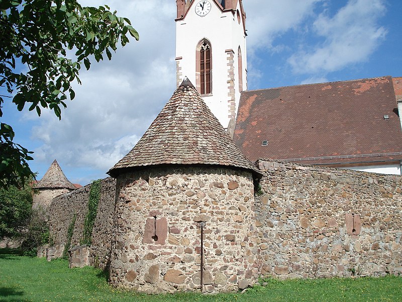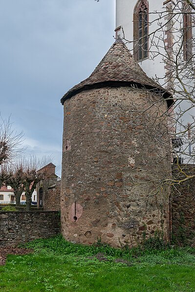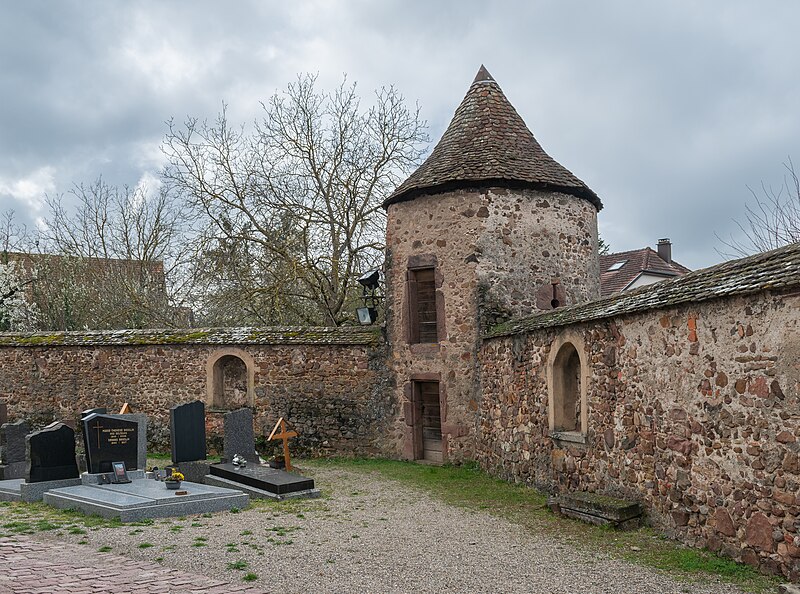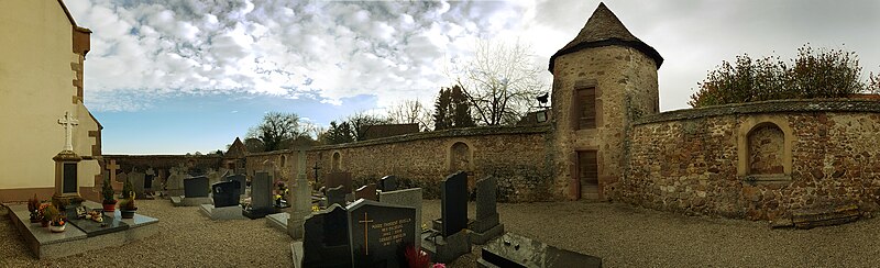 Le cimetière fortifié de Hartmannswiller, situé dans le département du Haut‑Rhin en Alsace, est l’un des mieux conservés de la région avec celui de Hunawihr (68). Il remonterait à la seconde moitié du XVe siècle ou à la première moitié du XVIe siècle. L’entrée d’origine, à l’angle nord‑ouest, a été murée et remplacée par une porte percée dans le mur ouest. Le site a conservé deux tours de flanquement au sud ainsi que des corbeaux intérieurs qui portaient le chemin de ronde. L’édifice est classé au titre des monuments historiques depuis 1920.