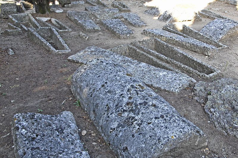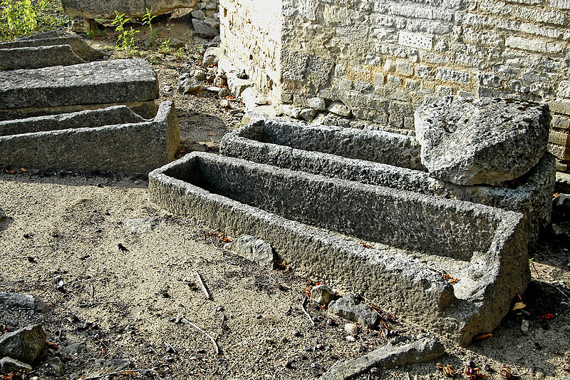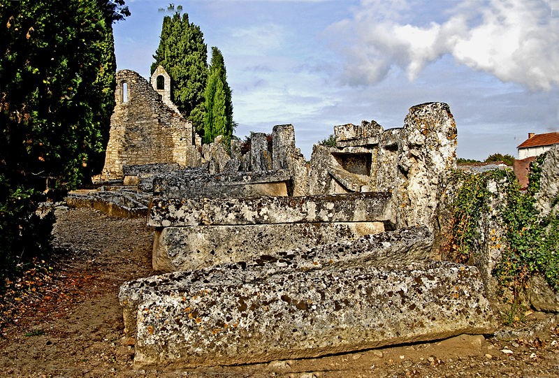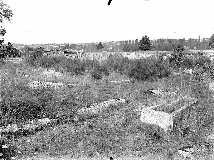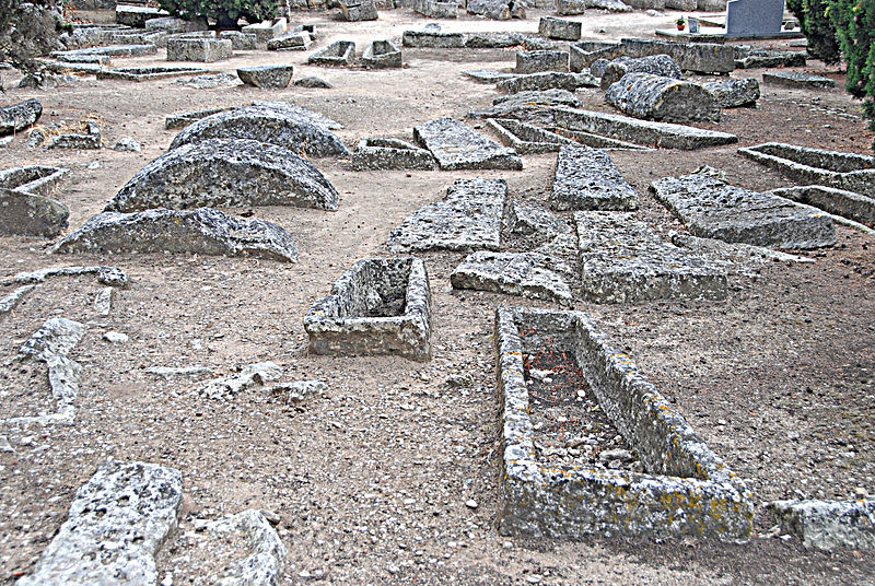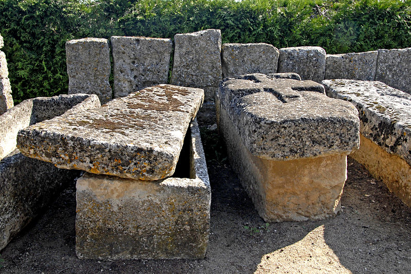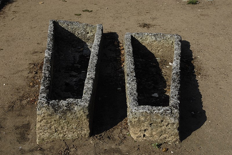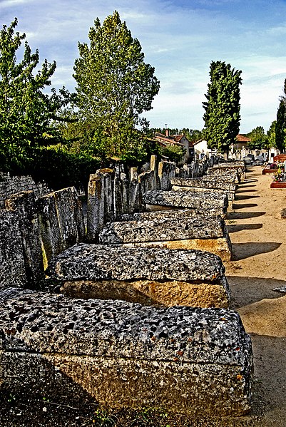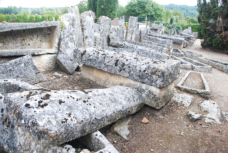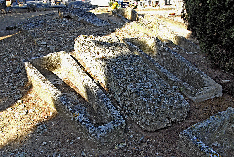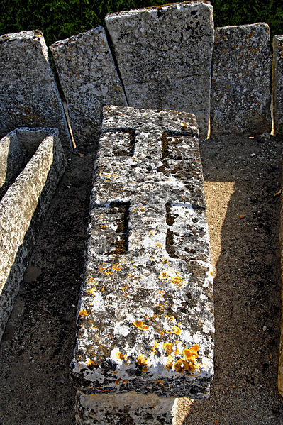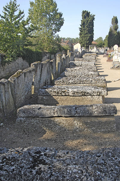 Le cimetière gallo-romain de Civaux (Vienne) présente plusieurs niveaux de sépultures et divers types d'inhumations. Les plus anciens sont d'époque romaine, certains coffrages réutilisent des fragments de colonnes romaines comme couvercles, d'autres tombes sont d'époque médiévale. De nombreux couvercles ont été réemployés pour former la clôture de l'actuel cimetière, et d'autres lieux d'inhumation ont été découverts aux alentours. On dénombre actuellement environ 16 000 sarcophages à Civaux. La nécropole mérovingienne de Civaux, située sur ce même site, a été utilisée comme cimetière pendant plus de 1 700 ans et conserve plusieurs centaines de sarcophages mérovingiens datés de 500 à 750 apr. J.-C., certains en place et d'autres disposés en rangées. L'originalité de la nécropole tient notamment à sa clôture composée de couvercles de sarcophages dressés à la manière de menhirs, structure déjà attestée au XVIIIe siècle. Plusieurs couvercles portent des décors — poisson, croix, chrisme — ainsi que des inscriptions chrétiennes telles que Maria ou Pientia. La nécropole a été classée au titre des monuments historiques en 1923. Le site est ouvert gratuitement au public ; le musée archéologique de Civaux fournit des informations, des audioguides et des visites guidées. Parmi les documents visuels figurent une gravure du XVIIIe siècle et des images montrant la clôture formée par les couvercles de sarcophages.