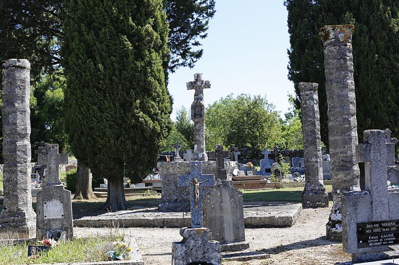 Le cimetière abrite une croix de pierre ornée d'une petite niche taillée dans le même bloc et en saillie, destinée à recevoir une statue aujourd'hui disparue. La figure du Christ est sculptée au‑dessus. L'autel sur lequel se célébrait l'office du jour des défunts, formé de deux blocs superposés, sert de base à la croix. À distance, aux quatre coins d'un rectangle, se dressent des colonnes circulaires pourvues de bases et de chapiteaux, qui soutenaient vraisemblablement une toiture. Dans ce même espace se trouve un tombeau du XVe siècle : un petit édifice de plan rectangulaire dont l'une des faces est creusée d'une large cavité, dont l'arc en tiers‑point se prolonge à l'intérieur par une petite voûte en berceau. La toiture à deux pentes est constituée de dalles de pierre. Ce type de tombeau est assez rare.