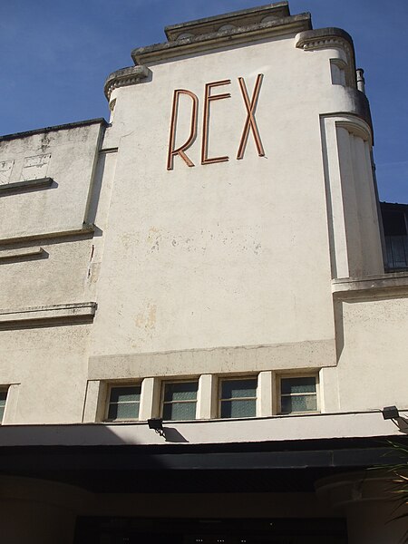 Construit de 1935 à 1938 par l'architecte Villiéras dans le style Art déco, le cinéma Rex a été modifié dans les années 1950 puis transformé en triplex en 1980-1981. Sa façade adopte une architecture fonctionnelle fondée sur des blocs et des volumes qui délimitent le hall d'accueil, le bar et hall du premier étage ainsi que la salle de projection au dernier niveau. Le fronton Art déco, surmonté d'un péristyle formé de colonnettes, structure l'ensemble. Une mise en scène lumineuse mettait en valeur cette façade. Le recours à un vocabulaire machiniste, évoquant l'image d'un paquebot avec ses ponts, fait de l'édifice une métaphore du voyage et du modernisme, en lien avec l'avènement du cinéma parlant dans la commune.
