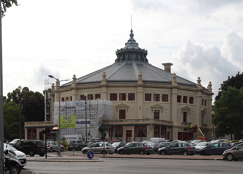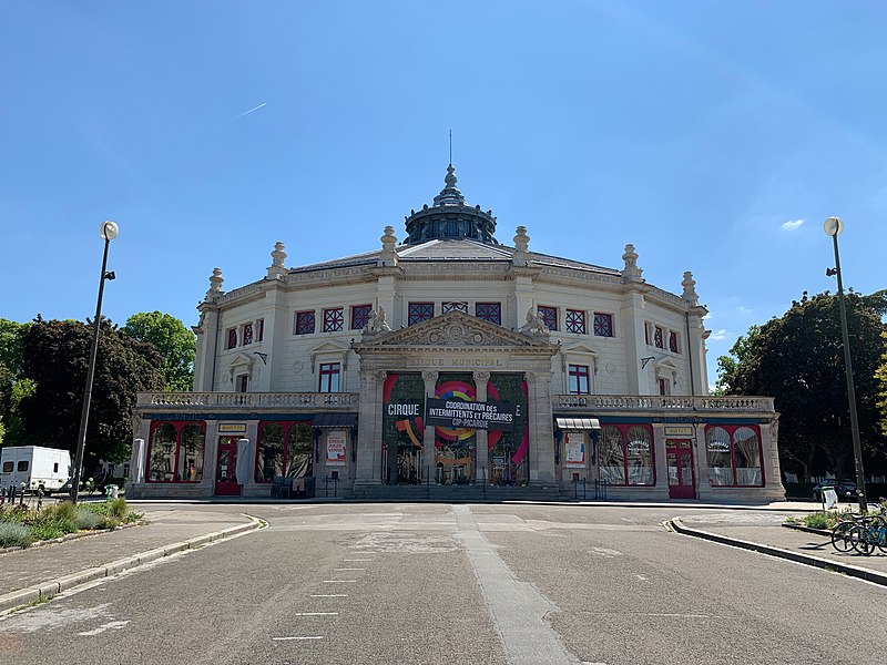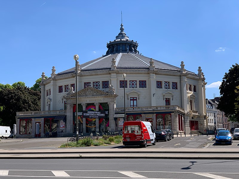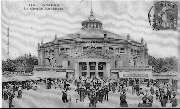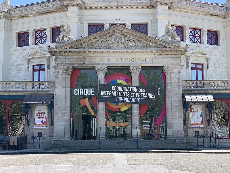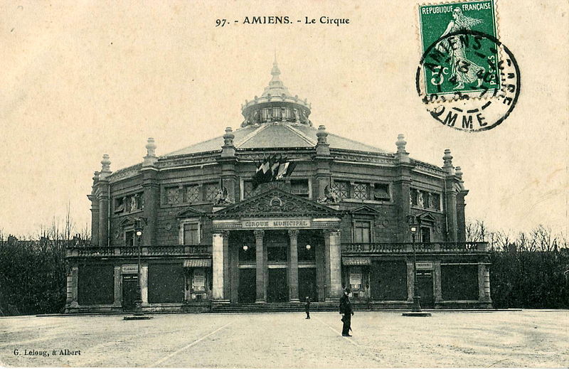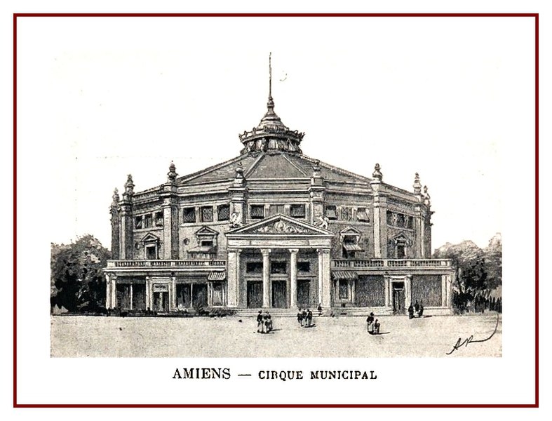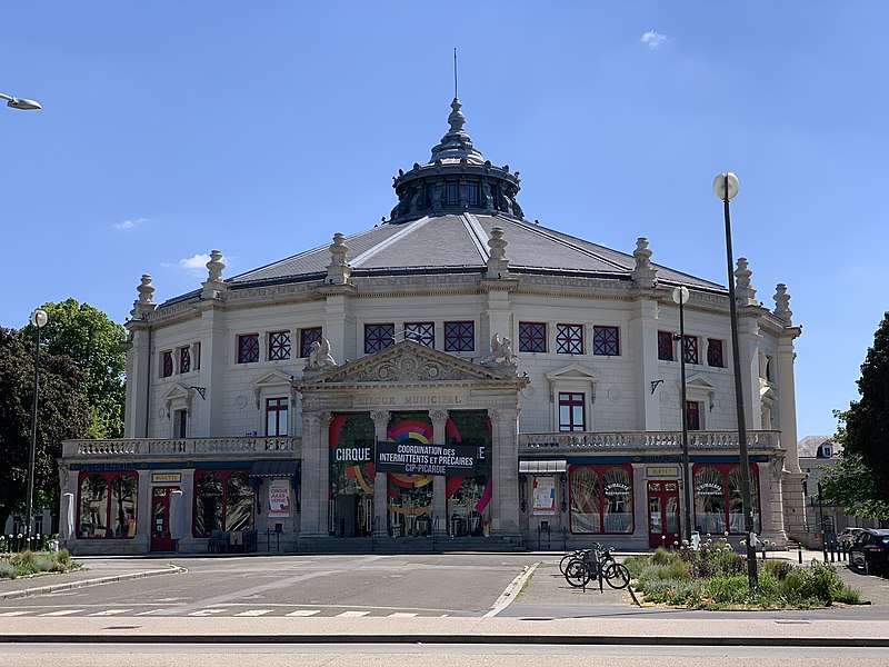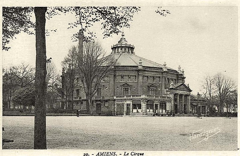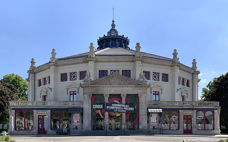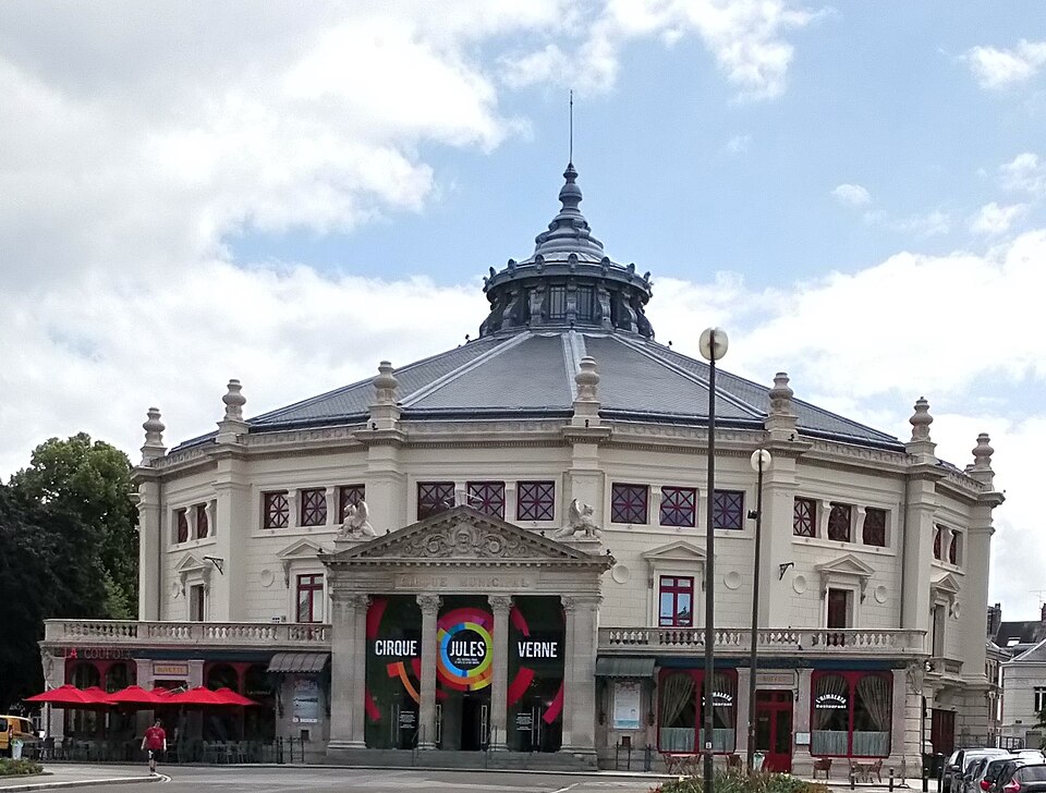 Le Cirque municipal d'Amiens, aujourd'hui nommé Cirque Jules-Verne, est situé place Longueville et inscrit au titre des monuments historiques depuis le 29 octobre 1975 pour ses façades et toitures. L'usage du site pour des constructions provisoires en planches remonte à 1845, lorsque la Foire de la Saint-Jean s'y tenait après le démantèlement des fortifications et la transformation de l'ancien bastion de Longueville en esplanade. Une Société du Cirque se constitue en 1865 pour encourager la construction d'un cirque en dur ; la ville fait toutefois édifier en 1874 un cirque provisoire en bois qui subsiste jusqu'à la fin des années 1880. Le projet d'un cirque permanent se concrétise en 1887 sous l'impulsion du maire Frédéric Petit, avec le soutien actif de Jules Verne, conseiller municipal et défenseur du projet. Les plans sont confiés à Émile Ricquier, architecte en chef du département de la Somme, qui s'inspire des cirques parisiens de Jacques Hittorff pour concevoir un édifice polygonal à seize pans. La construction, commencée en 1887, nécessite un emprunt municipal et des modifications importantes des devis initiaux ; le coût final atteint 815 630,30 francs. L'inauguration solennelle a lieu le 23 juin 1889 en présence de Jules Verne et d'autres personnalités. L'édifice reçoit en 1895 une cheminée élevée à l'arrière ; celle-ci est ensuite raccourcie et consolidée lors d'une campagne de restauration en 1958. Pendant la Première Guerre mondiale, le cirque subit des dommages : un obus endommage notamment la toiture, les buvettes et l'une des marquises de fer forgé. Malgré la disparition de nombreux cirques en dur en France au XXe siècle, celui d'Amiens conserve son enveloppe d'origine et continue d'accueillir des activités variées. Conçu pour être polyvalent, il a servi de cirque, de palais des congrès et de salle de spectacles pour meetings, fêtes, séances de cinéma, compétitions sportives et spectacles de variétés. De grands noms du cirque et du spectacle s'y sont produits, et le bâtiment a aussi été choisi pour des tournages cinématographiques, parmi lesquels Les Clowns de Federico Fellini, Roselyne et les Lions de Jean-Jacques Beineix et Les Équilibristes de Nico Papatakis. À la fin des années 1960 et au début des années 1970, des émissions de télévision y sont tournées, et dans les années 1980 l'École de Cirque d'Amiens est créée avec le soutien d'Annie Fratellini. Une première campagne de restauration des façades a lieu en 1992, suivie au début des années 2000 d'une rénovation intérieure profonde conduite par les architectes Éric Dubosc, Marc Landowski et Michel Lefort pour un montant total de 3,04 millions d'euros. Les travaux mettent l'édifice aux normes modernes de confort et de sécurité tout en respectant son esprit d'origine : la capacité passe d'environ 3 100 à 1 700 places assises, les sièges sont remplacés mais conservent un velours rouge traditionnel, et les vitraux du lanterneau sont restaurés. Une œuvre picturale de l'artiste Ernst Caramelle orne désormais la coupole et évoque la toile des chapiteaux itinérants ; à l'issue des travaux, en novembre 2003, le bâtiment prend officiellement le nom de Cirque Jules-Verne et accueille le Pôle régional des arts du cirque. Le Cirque Jules-Verne est aujourd'hui un EPCC labellisé Pôle national cirque, qui propose chaque année une saison d'arts du cirque et une programmation accueillant également concerts et spectacles vivants. Depuis 2011, le Cirque, le Hangar pour les arts de la rue et l'École de Cirque forment un Pôle national cirque. Des travaux extérieurs d'envergure, engagés à partir de novembre 2016 pour lutter contre des infiltrations et restaurer les façades, ont représenté un chantier d'environ 1,6 million d'euros comprenant la restitution des couleurs d'origine des menuiseries et ferronneries, le remplacement de 120 ouvrants et la recréation d'une marquise disparue. Une lanterne d'origine a été réinstallée dans le hall après avoir été retrouvée à l'étranger et restituée au bâtiment. Le plan du cirque est un polygone à seize pans de 44 mètres de diamètre centré sur une piste circulaire de 13 mètres de diamètre, suffisante pour permettre à un cheval de courir au galop au bout d'une longe. Les fonctions usuelles — loges, écuries, selleries et magasins — ont été intégrées au rez-de-chaussée sous l'amphithéâtre afin de ne pas altérer l'enceinte principale. La façade principale, en avant-corps, porte l'inscription CIRQUE MUNICIPAL en lettres d'or sur fond de pierre blanche ; le tambour présente deux niveaux de baies rythmés par des contreforts coiffés de vases d'aération et se termine par un toit à seize versants convergeant vers un lanterneau zénithal. À l'intérieur, une charpente métallique apparente formée de seize poutres convergeant autour du lanterneau permet d'obtenir un volume sans appuis gênants pour le public, et l'ornementation d'origine, de style pompéien et éclectique, subsiste par endroits sous des décors plus récents. Le Cirque Jules-Verne est accessible place Longueville, à proximité du centre-ville et de la gare, desservi par plusieurs lignes de bus, doté d'un parking devant l'entrée et d'aménagements pour les personnes à mobilité réduite.