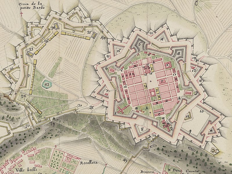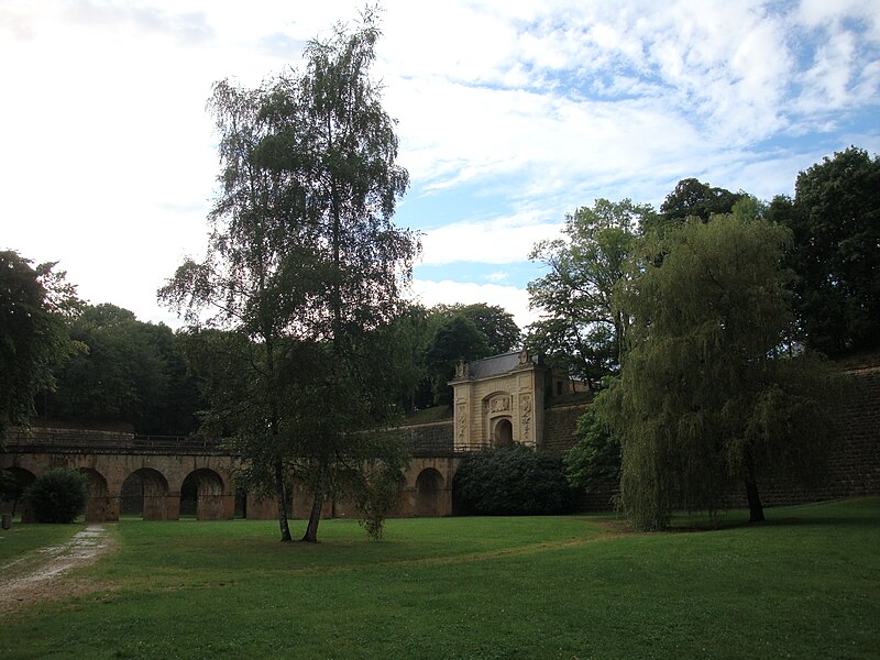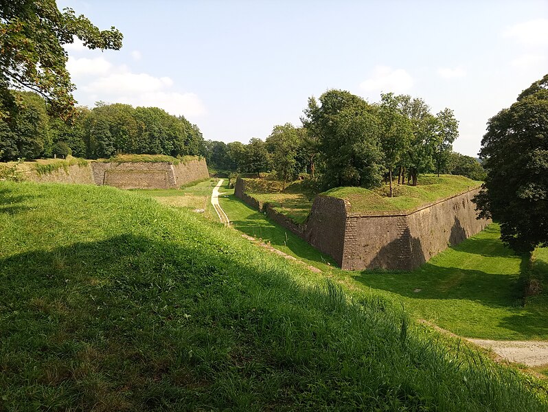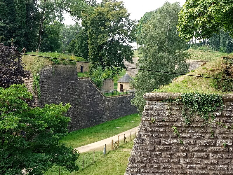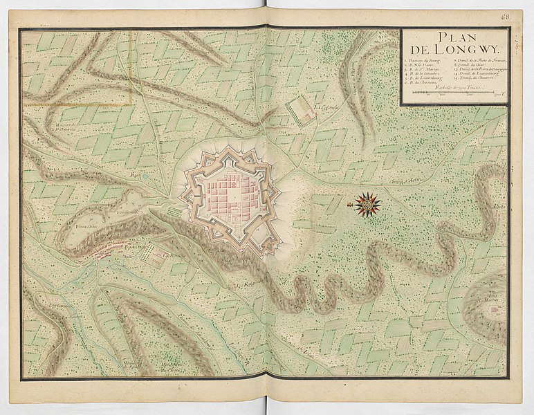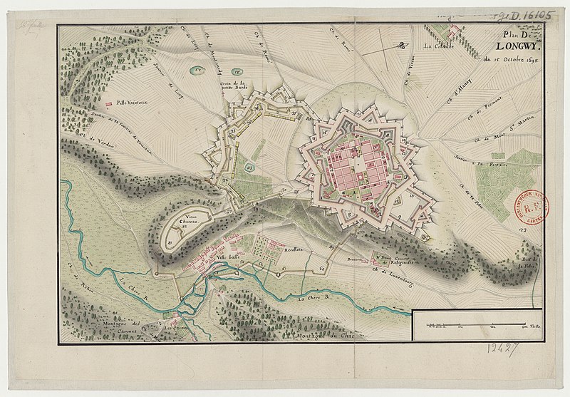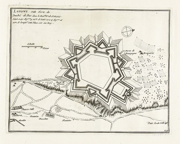 L'enceinte fortifiée de Longwy, située au cœur historique de la ville en Meurthe-et-Moselle, est un système de fortifications construit à la fin du XVIIe siècle sous la direction de Sébastien Le Prestre de Vauban et de Choisy. Sa construction s'est déroulée entre 1679 et 1690, la première pierre ayant été posée en 1680. Après l'annexion de Longwy au royaume de France par le traité de Nimègue en 1678, le vieux château et l'ancien Longwy-Haut furent démolis pour édifier une ville neuve sur le plateau dominant la vallée de la Chiers et Longwy-Bas. L'ensemble, organisé sur un plan hexagonal, comprenait une église, un arsenal, onze casernes, cinq puits et deux accès principaux, la porte de Bourgogne (détruite en 1914) et la porte de France. La porte de France, dont une date de 1683 est portée mais considérée apocryphe, a fait l'objet de multiples aménagements : pont dormant reconstruit en 1760, prolongement du passage en 1822, restauration en 1859, puis installation d'une casemate en 1883. Des ouvrages isolés, notamment les lunettes de Bourgogne, de France et du Précipice, sont apparus entre 1730 et 1751 selon l'observation des plans. À partir de 1789, des perfectionnements du système défensif furent entrepris ; ces travaux restèrent inachevés au siège de 1792, qui vit la construction d'un cavalier dans l'ouvrage à corne et l'édification d'une redoute sur le site de l'ancien château pour commander la vallée de la Moulaine et les plateaux de Mexy et de Pulventeux (travaux datés entre 1789 et 1792). En 1827 furent réalisés des renforcements derrière la demi-lune 7 et la première porte de France, et diverses destructions et transformations eurent lieu aux XIXe et XXe siècles : la lunette dite de Bourgogne fut détruite en 1827, la porte de Bourgogne et des courtines s'effondrèrent en 1914, des percements routiers et comblements de parties non classées intervinrent entre 1920 et 1930 puis en 1953-1954, et l'ouvrage à corne ainsi que la lunette dite du fort de Bitche furent supprimés après le déclassement en 1958. L'hôtel du gouverneur fut presque totalement détruit en 1871 puis converti en magasin à fourrage, et un hôpital de siège fut construit entre les bastions 4 et 7 après 1870-1871. Les fronts nord et ouest ont été démantelés, mais le reste des fortifications subsiste ; en 2019 plus de la moitié de l'enceinte et des bastions ainsi que la porte de France étaient bien conservés, et la plupart des bâtiments d'origine, tels que l'hôtel de ville, l'église, les casernes, le puits central et la boulangerie, demeuraient visibles. La porte de France et plusieurs bastions et ouvrages ont reçu des protections au titre des monuments historiques, et l'ensemble figure depuis le 7 juillet 2008 au patrimoine mondial de l'UNESCO comme composante du réseau des sites majeurs de Vauban. Le musée des émaux de Longwy est installé dans l'ancienne boulangerie militaire, témoignant du réemploi des bâtiments militaires dans la ville.