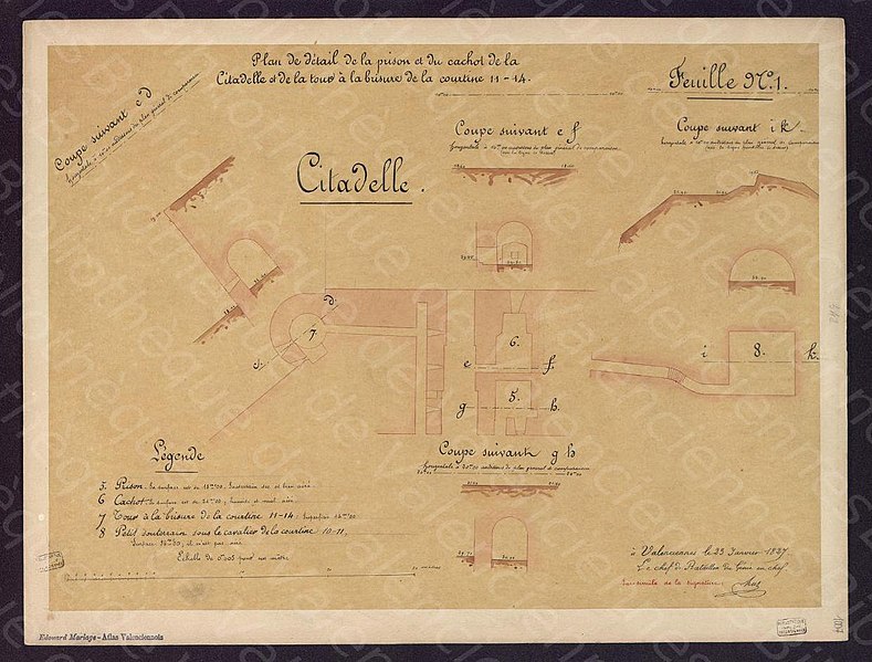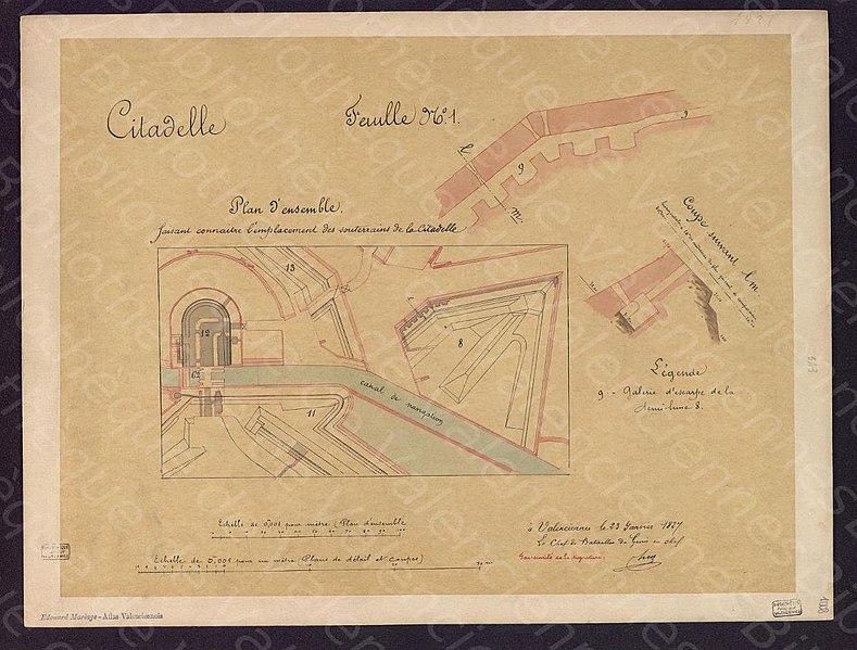 La citadelle de Valenciennes est un ouvrage militaire aujourd'hui en grande partie détruit, situé dans la ville de Valenciennes (département du Nord, région Hauts‑de‑France). Démantelée à la fin du XIXe siècle, comme l'enceinte de la ville, elle ne conserve actuellement qu'une portion du front côté ville, comprenant des éléments des bastions 15 et 16 et la demi‑lune 75. Une monographie d'Édouard Mariage, Maurice Hénault et Émile Dutouquet intitulée Les fortifications de Valenciennes (Imprimerie G. Giard et A. Seulin, Valenciennes, 1891–1895, 290 p.) est disponible en ligne sur le site de la Médiathèque Simone Veil de Valenciennes. Des documents et images sont également consultables sur Wikimedia Commons sous « Citadelle de Valenciennes », et des articles connexes abordent l'enceinte et la place fortifiée de Valenciennes, le siège de Valenciennes, les listes de fortifications en France et des villes fortifiées par Vauban, ainsi que les portails consacrés à l'histoire militaire et au Nord‑Pas‑de‑Calais.