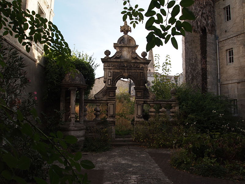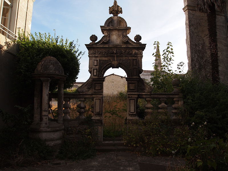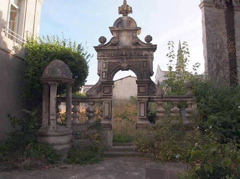 La clôture se compose d'une balustrade posée sur un mur-bahut et supporte un appui mouluré. À chaque extrémité, un socle porte une sphère en pierre. La porte, placée au centre de la balustrade, est ménagée dans un arc plein cintre qui donne l'impression d'avoir été formé d'éléments superposés assemblés de façon un peu aléatoire. Les piédroits sont constitués de blocs rectangulaires moulurés. Les tympans, situés au‑dessus de l'extrados de l'archivolte, sont délimités par des panneaux. Ces tympans, ainsi que la frise de l'entablement qui couronne la porte, sont décorés de motifs de feuillage. Au‑dessus se développe un fronton en volutes, ouvert pour laisser apparaître un écu dont les armoiries ont été buchées. Ce fronton est surmonté d'un second fronton demi‑circulaire contenant une urne ornée d'une draperie. L'ensemble est encadré par des consoles renversées qui reposent sur la balustrade. Devant cet ensemble se situe la margelle d'un puits, couverte par une petite coupole portée par trois colonnes doriques.