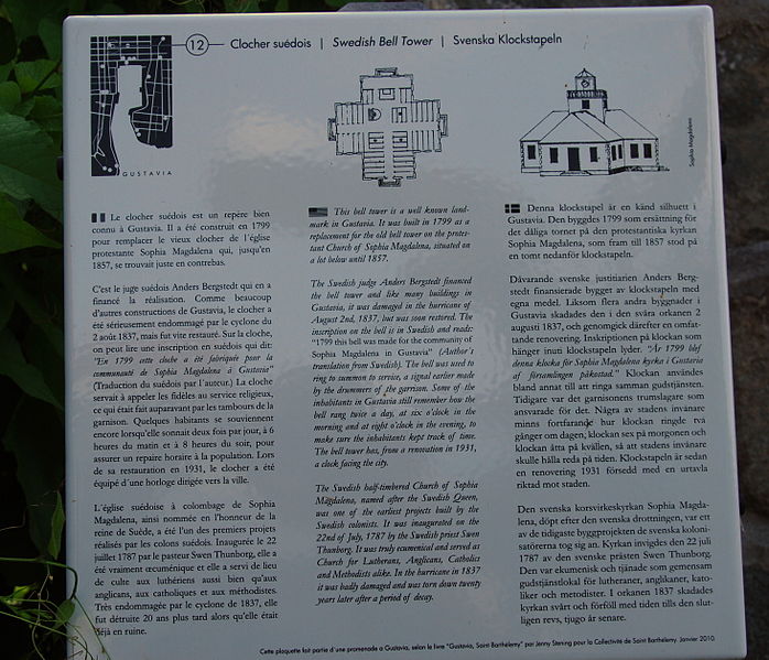 Le clocher suédois de Gustavia, situé rue Lubin-Prin près de la sous-préfecture à Gustavia (Saint-Barthélemy), a été élevé en pierre volcanique à la fin du XVIIIe siècle, vers 1790, pendant l'occupation suédoise (1785-1877) ; il est parfois daté de 1800. La cloche en fonte, baptisée « Sofia Magdalena » en l'honneur de la reine Sophie-Madeleine de Danemark, a été coulée à Stockholm en 1799. Ce clocher remplaçait le vieux beffroi de l'église protestante Sophia Magdalena, inaugurée le 22 juillet 1787 par les colons suédois et ayant servi successivement de lieu de culte aux luthériens, anglicans, catholiques et méthodistes ; très endommagée par le cyclone du 2 août 1837, l'église fut rasée en 1857. La cloche appelait les fidèles et fournissait un repère horaire à la population, sonnant notamment à 6 heures du matin et à 8 heures du soir. Lors de la restauration du clocher en 1931, une horloge orientée vers la ville y fut installée. Le clocher est inscrit au titre des monuments historiques depuis le 1er août 1995. Le 7 septembre 2017, il a été fortement endommagé par le passage de l'ouragan Irma : sa partie supérieure en bois s'est effondrée et ses bases ont été fragilisées.