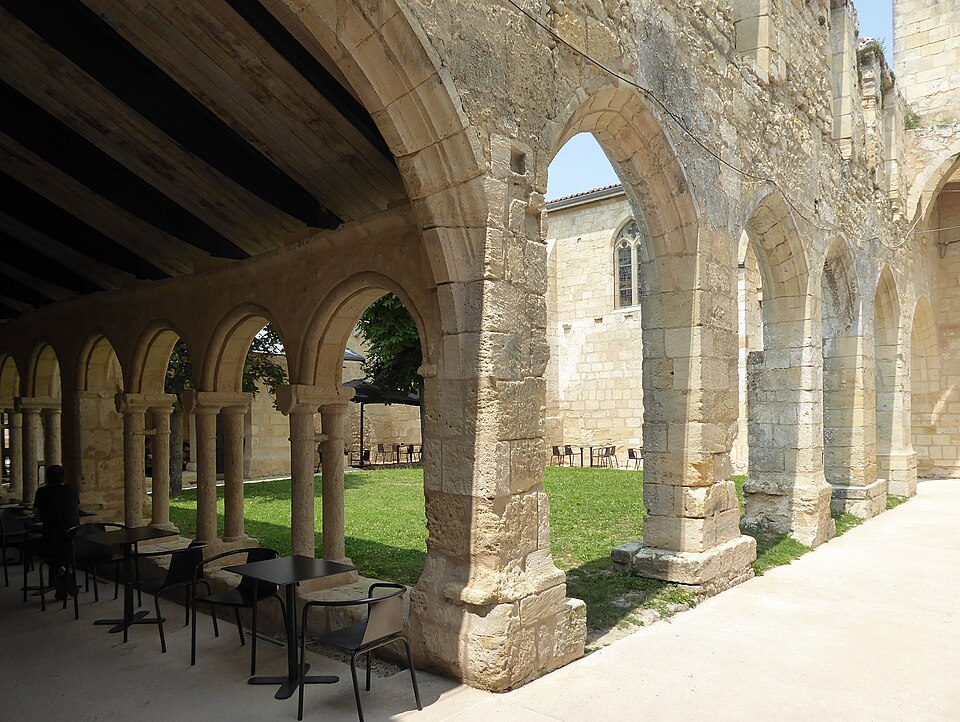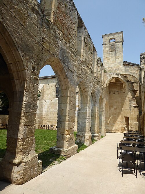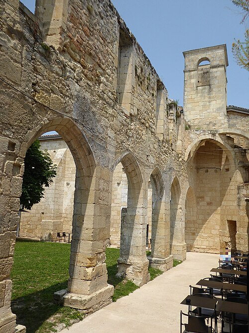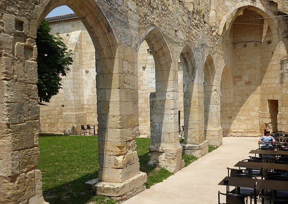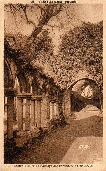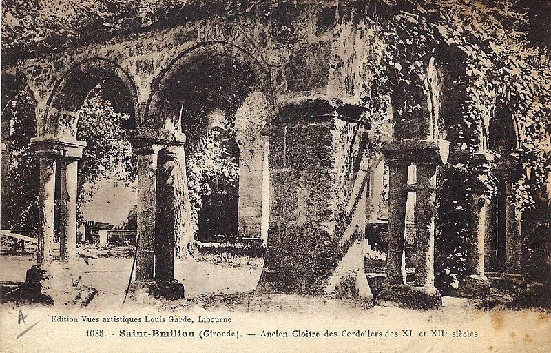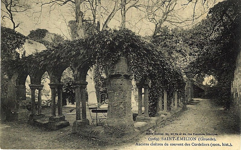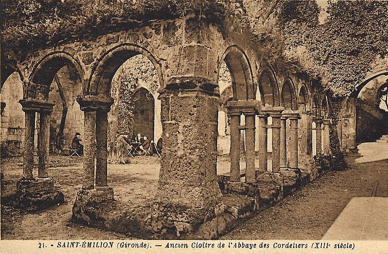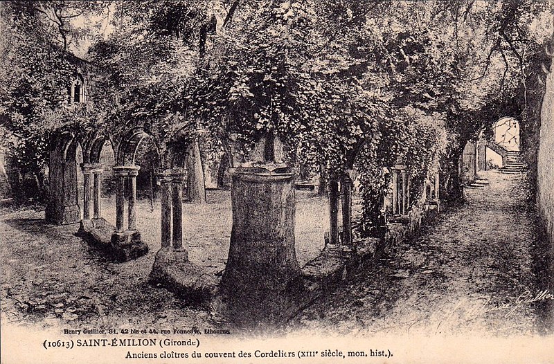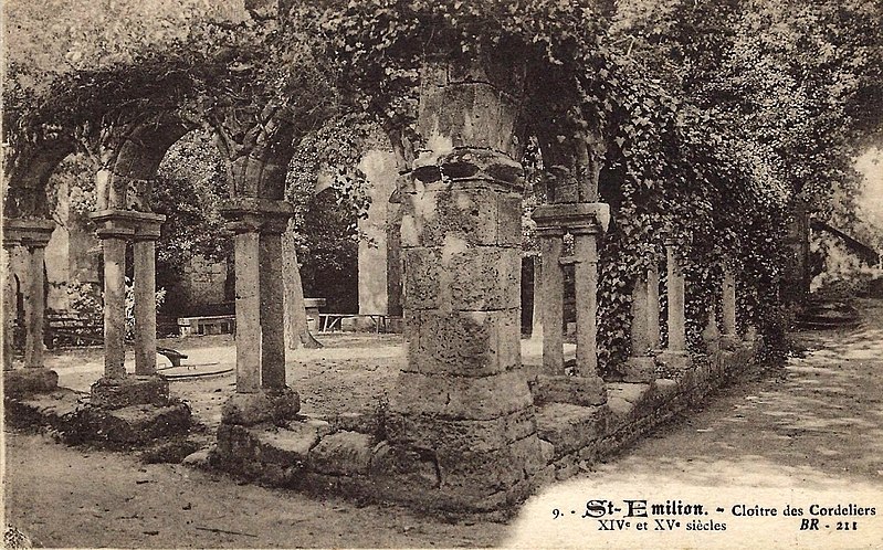 Le cloître des Cordeliers se situe au cœur de la cité médiévale de Saint-Émilion, en Gironde. Les Cordeliers, frères franciscains ainsi nommés en référence à la corde de leur ceinture, s'installent dès le XIIIe siècle initialement à l'extérieur des remparts. Ils occupaient vraisemblablement un lieu dit « Les Menuts » où l'on trouvait encore des vestiges de leur ancienne église, le terme gascon "menut" signifiant « petit ». Après d'importants dégâts subis pendant la guerre de Cent Ans, notamment le pillage de 1337, les religieux demandent et obtiennent l'autorisation de s'implanter à l'intérieur de la ville. À partir de 1338 ils entreprennent l'édification d'une chapelle intra-muros et, en 1343, le pape leur accorde le droit d'établir leur couvent en ville, conduisant à la construction du cloître et d'une partie des bâtiments conventuels. La chapelle sera ensuite transformée en l'église visible aujourd'hui, tandis que d'autres bâtiments antérieurs restent enfermés entre les murailles. En 1383, le roi d'Angleterre leur cède définitivement une parcelle constructible proche de leur ancien emplacement mais située à l'intérieur des remparts. Quatre siècles durant, les Cordeliers occupent le couvent qui comprend alors une église, une cour d'entrée, un chai, un cuvier, une cave, un jardin et un corps de logis avec six chambres. La Révolution de 1789 provoque la fermeture de l'ordre et la mise du bâtiment en bien national ; les religieux sont dispersés et le cloître reste délaissé malgré la réautorisation de l'ordre en 1850. Abandonné, le site est peu à peu envahi par la végétation et devient un lieu de rendez-vous romantique et pittoresque, évoqué au XIXe siècle par Maurice Graterrole pour son atmosphère mélancolique et poétique. À la fin du XIXe siècle, des propriétaires exploitent les sous-sols et les caves souterraines pour l'élaboration de vins pétillants sous le nom de MM. G. Meynot et Compagnie, donnant un renouveau d'activité au cloître. Depuis lors, plusieurs occupants se succèdent et perpétuent la production de vins effervescents, aujourd'hui réputés. Le cloître, construit en pierre calcaire locale, présente une architecture romane qui côtoie l'ancienne chapelle et l'église de style gothique. Ses colonnes monolithes, taillées d'un seul bloc, supportent des abaques décorés de petits écussons. On y distingue des arcs en plein cintre du milieu du XIVe siècle de style roman ainsi que des arcs en ogive gothiques dans le fond, ainsi que les restes d'une petite tour formant le clocher. On peut également observer un grand arc très pur traversant l'église, des colonnes dépourvues de chapiteaux et différentes fenêtres. Le site est classé au titre des monuments historiques et inscrit au patrimoine mondial de l'UNESCO. Les conditions naturelles des caves souterraines conviennent à la fermentation et au vieillissement des vins effervescents, dont la méthode traditionnelle comprend notamment le remuage quotidien des bouteilles, le dosage en liqueur d'expédition et le bouchage final par liège. Les Cordeliers produisent une dizaine de vins effervescents, blancs et rosés, brut ou demi-sec, élaborés à partir de cépages bordelais tels que Merlot, Sémillon, Cabernet Franc et Sauvignon. Il est possible de visiter les caves et galeries souterraines pour découvrir l'élaboration des vins et les dessous de la cité médiévale. Le cloître a aussi inspiré les arts : son décor a été reproduit à l'Opéra de Paris en 1839 pour Robert le Diable de Meyerbeer, et il a servi de lieu de tournage pour le film La mariée était trop belle de Pierre Gaspard-Huit.