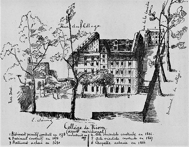 L'ancien collège de l'Oratoire, établi à Riom au XVIIe siècle, se compose de deux corps de bâtiments dont l'un présente un plan quadrangulaire; la porte d'entrée principale, située entre ces deux ensembles, illustre bien l'architecture de l'époque. Cette porte cochère, en pierre de taille, est surmontée d'un fronton triangulaire tronqué et encadrée par deux pilastres doriques ; son arc au cintre légèrement surbaissé et le cartouche orné de têtes, de feuillages et de fleurs témoignent du décor sculpté de la période ; l'année 1662 est gravée à la base du cartouche. Depuis le Moyen Âge, Riom disposait d'établissements d'enseignement liés à l'abbaye Saint-Amable et aux chanoines réguliers, puis la ville a progressivement pris en charge les écoles avant l'installation de congrégations nouvelles. En 1618 la municipalité mit des locaux à la disposition de la Congrégation de l'Oratoire, qui y commença l'enseignement dès 1619 selon un traité passé avec la ville. Les Oratoriens développèrent progressivement l'offre scolaire : dès 1622 des classes supérieures furent ouvertes, un cours de philosophie fut créé après les travaux achevés en 1649, et l'établissement connut une forte croissance au milieu du siècle, recevant jusqu'à plus de 800 élèves après la reconstruction d'un bâtiment de classes achevée en 1657. Un traité de 1660 prévoyait l'ouverture de cours de théologie, ratifié par l'autorité royale en 1661, et la ville contribua par des dotations et impositions pour assurer l'entretien du collège. Entre 1672 et 1680 furent édifiés les corps de logis auxquels les Pères s'installèrent en 1680, incluant la chapelle agrandie et une bibliothèque aménagée au-dessus de la salle des actes. Les bâtiments restèrent essentiellement en l'état jusqu'à la Révolution ; la vie religieuse et pédagogique connut cependant des controverses, notamment autour de l'accusation de jansénisme au XVIIIe siècle. La Révolution entraîna la disparition de la Congrégation et la mise en vente de ses biens ; le collège devint collège municipal et les locaux furent affectés à divers usages, la chapelle ayant notamment servi de dépôt. Au XIXe siècle la commune conserva et entretint les bâtiments : agrandissements et réparations sont réalisés notamment en 1806-1809, puis lors d'opérations entre 1857 et 1864 (avec une chapelle reconstruite d'après les plans de Ledru) et encore en 1876-1881 ; des aménagements importants eurent lieu aussi en 1840-1842 et dans la seconde moitié du siècle sous l'administration municipale. De 1856 à 1886 l'établissement fut confié aux Pères maristes sous le nom d'Institution Sainte-Marie, qui entreprirent des travaux et un agrandissement, puis en 1886 le collège redevint public et prit le nom de Michel-de-l'Hospital. Au XXe siècle l'établissement accueillit successivement une école primaire, une école de commerce et d'industrie ; une aile fut ajoutée en 1954, il devint lycée en 1963 puis retrouva le statut de collège une vingtaine d'années plus tard. Des restructurations récentes comprennent l'adjonction d'une cage d'escalier vitrée réalisée entre 1989 et 1992 ; à l'issue de ces travaux l'ensemble accueillait 549 élèves. La porte cochère datée de 1662 a été inscrite au titre des monuments historiques en 1929.