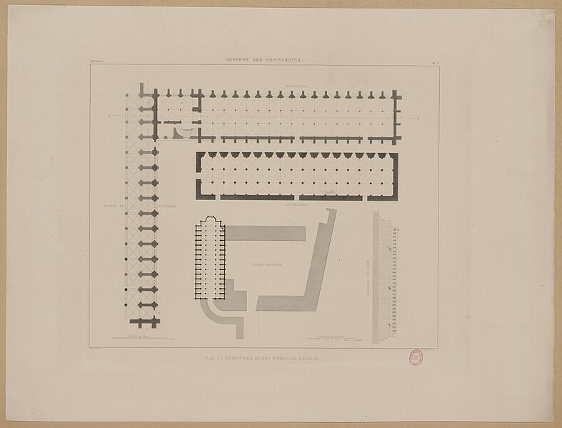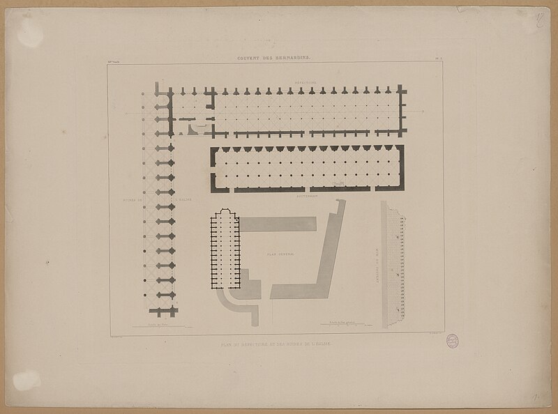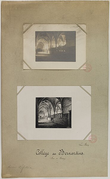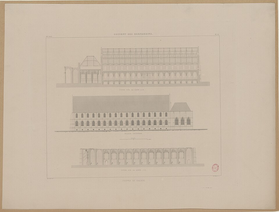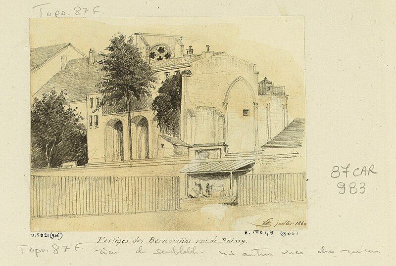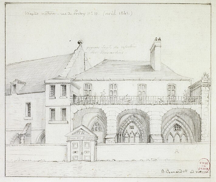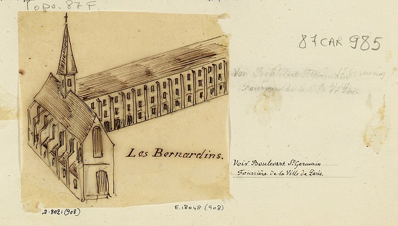 L'ancien couvent des Bernardins, situé 20 rue de Poissy dans le 5e arrondissement de Paris, est l'ancien Collège des Bernardins, un collège cistercien de l'université de Paris. Fondé au XIIIe siècle par Étienne de Lexington avec l'encouragement du pape Innocent IV, il servit de résidence aux moines cisterciens étudiant à l'université. Le corps principal du Collège, commencé à partir de 1248 et achevé vers 1253, comprenait plusieurs niveaux abritant salles de cours, réfectoires et dortoirs; ses fondations reposaient sur des pilotis de chêne en raison du sol marécageux. Protégé par Alphonse de Poitiers, il accueillit pendant plusieurs siècles un grand nombre d'étudiants cisterciens venus d'Europe et assura un enseignement théologique intensif, dispensé en latin tout au long de la journée. L'église du collège, dont la sacristie et les travaux furent encouragés par le pape Benoît XII, resta inachevée; elle fut partiellement démolie pour le tracé de la rue de Pontoise, ses ruines rasées lors du percement du boulevard Saint‑Germain et largement détruites ensuite. Confisqué à la Révolution et devenu bien national, le Collège fut successivement transformé en prison, puis en caserne de pompiers et accueillit d'autres occupations, dont un internat de la Police nationale. Durant la Semaine sanglante de 1871, le réfectoire, converti en caserne, servit de refuge à de nombreux civils. Malgré son classement au titre des monuments historiques depuis le 10 février 1887, le site resta longtemps méconnu et menaçait d'effondrement. Racheté par le diocèse de Paris en avril 2001, le Collège fit l'objet d'un important programme de restauration pour le transformer en lieu de rencontres, de formation et de culture. Les travaux, conduits de 2004 à 2008 sous la responsabilité de Hervé Baptiste pour la partie ancienne et de Jean‑Michel Wilmotte pour les espaces contemporains, ont nécessité la mise en place de 322 micropieux d'acier de 15 à 25 mètres de profondeur, le renforcement des piliers par cerclage métallique et la restauration de la toiture par une charpente métallique couverte de tuiles plates artisanales (110 000 tuiles de six nuances). Les fouilles et déblaiements ont mis au jour des voûtes romanes ensevelies, un canal de dérivation de la Bièvre et une pierre tombale datée de 1306. La rénovation, livrée en septembre 2008 et inaugurée début septembre par l'archevêque, permit d'aménager environ 5 000 m² utiles, dont 1 000 m² créés, et d'installer quinze salles de cours ainsi que deux auditoriums. Le 12 septembre 2008, le pape Benoît XVI prononça un discours au Collège, et l'établissement accueille depuis 2009 l'Académie catholique de France. Restauré dans sa triple vocation éducative, culturelle et spirituelle, le Collège propose expositions, concerts, conférences et activités pour le jeune public, assure une formation théologique au sein de l'École cathédrale et abrite un pôle de recherche structuré en départements thématiques. Ces départements traitent notamment de l'éducation et de la transmission, de l'économie et de la société, de l'éthique biomédicale, de la politique et des religions, de l'humanisme numérique, des humanités environnementales et des relations entre art et parole, complétés par des chaires de recherche successives. Depuis sa réouverture, le Collège des Bernardins a retrouvé une place active dans le paysage culturel et intellectuel parisien tout en conservant le souvenir de son histoire monastique et universitaire.