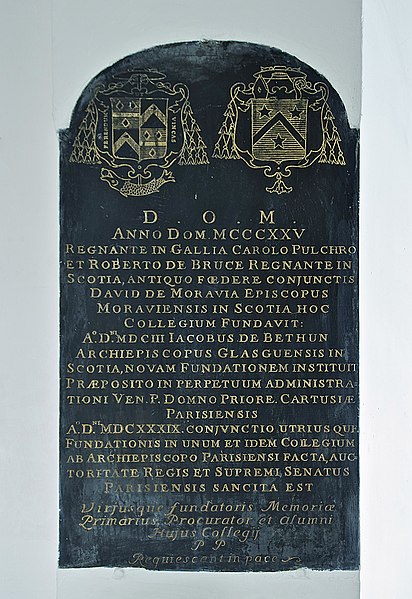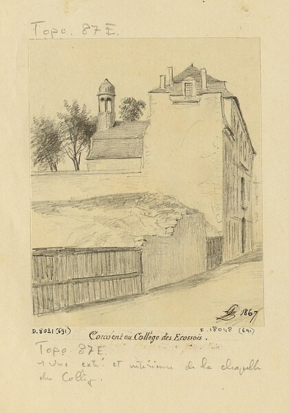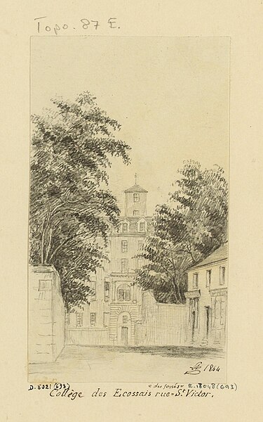 Le collège de Paris, ou collège de Grisy, fut érigé par acte le 8 juillet 1333 par Jean, évêque de Murray, dans une maison de la rue des Amandiers (actuelle rue Laplace). Les étudiants écossais logeaient alors dans la rue du Chauderon voisine, qui devint sous cette influence la rue d'Écosse. L'ambassadeur Jacques de Béthun forma une communauté de prêtres écossais réfugiés en France ; en 1639 cette communauté fut adjointe au collège avec l'accord de l'archevêque de Paris. En 1662, Robert Barclay, alors principal, acquit un emplacement sur les fossés Saint-Victor et y fit édifier une maison réunissant la double fonction de séminaire et de collège. Dans une des chapelles se trouvait une urne en bronze doré contenant la cervelle de Jacques II, mort à Saint-Germain-en-Laye en 1701.