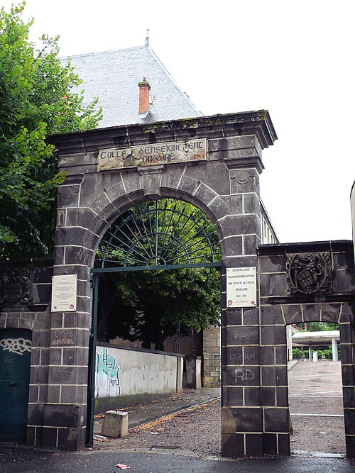 Le Collège des Jésuites de Billom, fondé au milieu du XVIe siècle par l'évêque Guillaume Duprat, est présenté comme le premier collège de la Compagnie de Jésus construit en France. Les premières démarches remontent à janvier 1555 par un concordat avec le chapitre de Saint‑Cerneuf de Billom pour transférer la régence des écoles aux jésuites, et des lettres patentes en 1556 et 1557 confirmèrent la décision municipale visant à financer la construction. Les terrains, achetés en 1556 par Duprat et la municipalité au sud de Billom, accueillirent la fondation officielle le 19 novembre 1558 ; la première pierre de l'église fut bénie en mai 1559, Duprat léguant 5 000 livres en 1560 pour l'achèvement, et l'église fut dédiée en avril 1564. Édifié de 1558 à 1564, l'ensemble correspond au premier type de collèges jésuites, organisé en quadrilatères autour de cours fermées. Les locaux scolaires se développaient autour de la cour des classes, avec une salle de théâtre et des chapelles pour les congrégations des maîtres, des élèves et des habitants ; les espaces domestiques comprenaient cuisine, réfectoire, apothicairerie, jardin, ainsi que l'église et la sacristie. Le quadrilatère nord‑ouest, aujourd'hui très transformé, abritait la partie scolaire ; le quadrilatère est, mieux conservé, regroupait les habitations et l'église autour de la cour domestique et du jardin. Après l'interdiction générale des jésuites en 1593 et la soumission de la ville à Henri IV en 1594, les Jésuites furent chassés et remplacés par les chanoines ; ils revinrent en 1604 et le collège prospéra aux XVIIe et XVIIIe siècles. Un incendie durant l'hiver 1621 détruisit une grande partie de l'établissement, suivi de travaux de reconstruction, et des rénovations eurent lieu vers 1750. En 1762 les jésuites furent de nouveau expulsés et le collège passa sous contrôle diocésain jusqu'à sa fermeture pendant la Révolution. Au XIXe siècle, les bâtiments connurent de multiples affectations et transformations : restauration en 1802, hébergement de la gendarmerie et des tribunaux jusqu'en 1803, réouverture comme collège la même année, petit séminaire de 1826 à 1828 et reconstruction de l'aile sud du bâtiment nord‑ouest en 1827. L'établissement resta communal jusqu'en 1853 puis devint collège libre ; les ailes est et sud furent transformées en caserne de hussards vers 1843‑1844, avec construction d'un manège et d'écuries, et la caserne subsista jusqu'en 1877. Après le départ de la garnison, la totalité des bâtiments fut affectée vers 1884 à une école d'enfants de troupe ; l'église fut aménagée par un plancher et des cloisons pour y installer dortoirs et salle de spectacle. L'école militaire préparatoire des enfants de troupe, créée en 1886, fonctionna jusqu'en 1963 et forma environ 11 000 élèves. L'établissement devint collège d'État en 1963, puis fut définitivement fermé en 1994 ; il subit un important incendie en 1998. Le décor comprenait dans la chapelle un grand tableau allégorique, le Typus Religionis, exécuté autour du XVIIe siècle et aujourd'hui conservé aux Archives nationales à Paris. Le site fait actuellement l'objet d'un projet de rénovation soutenu par la Fondation du patrimoine et la Mission Stéphane Bern.