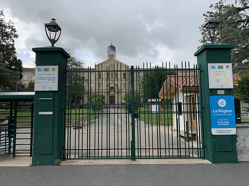 Le lycée Notre‑Dame‑de‑Mongré, couramment appelé Mongré, est un établissement d'enseignement secondaire privé catholique situé à Villefranche‑sur‑Saône (Rhône) qui accueille plus de 2 000 élèves, de la maternelle à la terminale ; ses élèves sont appelés « Mongréens ». Sa devise officielle est « Christo in adolescentibus » (« Pour le Christ qui est dans les adolescents ») et une devise informelle en jeu de mots est « Le gré de Dieu, mon gré ! ». L'histoire de Mongré commence le 14 août 1842 lorsqu'une donation de Mlle Bottu de La Barmondière confie le domaine aux pères jésuites pour y fonder un établissement d'éducation ; la première rentrée a lieu en 1851 au Vieux Château, détruit en 1964. Les bâtiments actuels, dessinés par l'architecte M. Bresson, sont édifiés entre 1851 et 1853, la grande chapelle est achevée le 25 mai 1865 et l'orgue, réalisé par Aristide Cavaillé‑Coll, est installé en 1869. Pendant la seconde moitié du XIXe siècle et la première moitié du XXe siècle, Mongré figure parmi les plus importants collèges jésuites de France. La direction de l'établissement connaît trois grandes périodes : jésuite (1851‑1951), assomptionniste (1951‑1975) puis laïque depuis 1975, tout en conservant une pédagogie d'inspiration ignatienne. L'histoire du domaine est marquée par de nombreux événements : occupations militaires en 1870‑1871, départs liés aux décrets de 1880, ventes et reprises au début du XXe siècle, la transformation en hôpital militaire durant la Première Guerre mondiale où 2 437 blessés ont été soignés, puis des réquisitions et hébergements variés pendant la Seconde Guerre mondiale, jusqu'à la libération de Villefranche‑sur‑Saône en septembre 1944. Après la guerre, les lieux accueillent successivement des formations jésuites et une réorganisation pédagogique ; en 1946 est fondée l'Association familiale scolaire et, en 1950‑1951, l'Association familiale, aidée par les pères assomptionnistes, rouvre le collège de Mongré. L'essor de l'établissement se poursuit avec la signature d'un contrat d'association pour les secondaires en 1960, l'introduction progressive de la mixité dans les années 1960, la démolition du Vieux Château en 1964 pour aménager des stades, et une croissance continue des effectifs jusqu'à dépasser 2 000 élèves en 2015 ; en 2019 les bâtiments font l'objet d'une inscription partielle aux monuments historiques. D'inspiration ignacienne, l'école comprend maternelle, primaire, collège et lycée (sections littéraire, économique et sociale, et scientifique) et met l'accent sur l'excellence personnelle et le développement de la confiance en soi, éléments centraux de ce que l'on nomme la « méthode mongréenne ». Les Petits Chanteurs de Mongré, fondés en 1998 par Vincent Coiffet et regroupant une cinquantaine d'élèves, sont affiliés aux Pueri Cantores, représentent l'établissement lors de concerts, ont enregistré deux CD et ont participé à des événements importants, notamment un concert à Lyon dirigé en 2019 par John Rutter ; la direction du chœur est assurée depuis septembre 2019 par Véronique Mille. Au plan scolaire, le lycée se plaçait en 2015 au 22e rang départemental sur 67 et au 551e rang national selon des critères portant sur le taux de réussite au baccalauréat, la continuité scolaire et la valeur ajoutée. Parmi les anciens élèves figurent des personnalités telles qu'Antoine de Saint‑Exupéry, Pierre Teilhard de Chardin, Tom Morel, Nicolas de Tavernost, Benjamin Biolay, Woodkid et de nombreux autres acteurs politiques, scientifiques, militaires et culturels. Plusieurs professeurs remarqués ont enseigné à Mongré, dont Victor Fontoynont, Francisque Perrut et Désiré Walter. Enfin, 175 anciens élèves sont morts pour la France lors de la Première Guerre mondiale ; leurs noms sont gravés sur une plaque commémorative dans l'atrium du bâtiment.