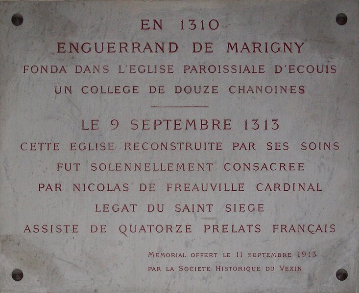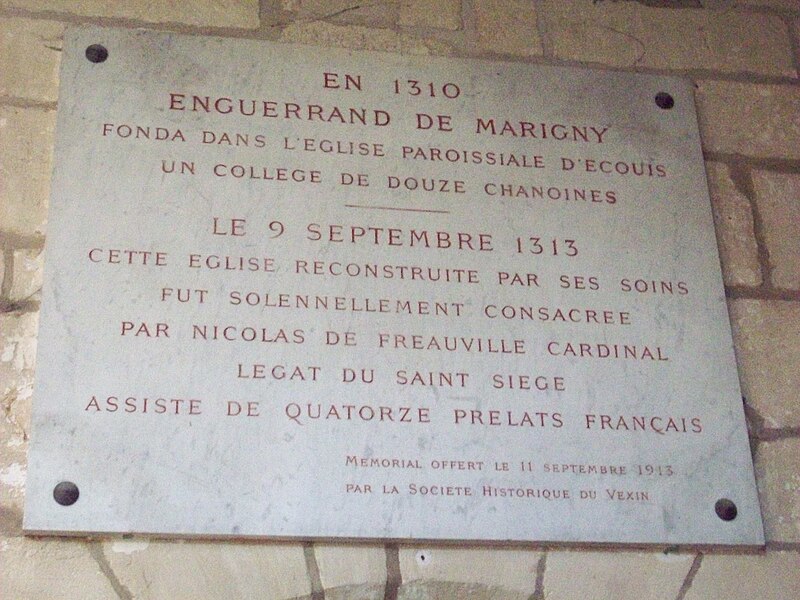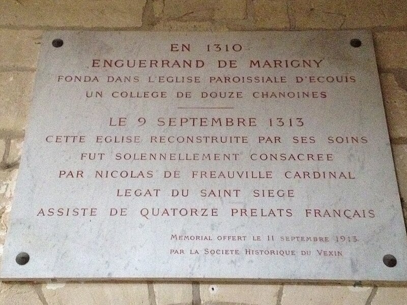 La collégiale Notre‑Dame d'Écouis, située dans l'Eure, a été fondée par Enguerrand de Marigny, ministre des finances de Philippe le Bel, natif de Lyons‑la‑Forêt qui possédait à Écouis un domaine comprenant un hôpital et un collège de chanoines. Placée sous l'invocation de Notre‑Dame de l'Assomption, elle fut établie comme une collégiale de neuf chanoines, complétée par un doyen, un trésorier et un chantre, avec l'approbation du roi, de l'archevêque de Rouen Bernard de Farges et du pape Clément V. Remplaçant l'ancienne église dédiée à saint Aubin, sa construction mobilisa quatre mille pierres de Vernon et s'étendit sur trois années, de 1310 à 1313. L'édifice fut consacré le 9 septembre 1313. Après la disgrâce et l'exécution d'Enguerrand de Marigny à Montfaucon, sa dépouille fut rapportée à la collégiale en 1326 et déposée dans le chœur. Au début du XIVe siècle fut ajoutée une chapelle au nord de la nef, entre la tour de façade et le transept; en 1528 on entreprit la construction, côté sud, de la chapelle Saint‑Aubin destinée au service paroissial. La collégiale a accueilli plusieurs rois de France, dont Louis XI et Louis XII, et eut parmi ses chanoines saint Vincent de Paul. Elle conserva son statut collégial jusqu'à la Révolution; le chapitre fut supprimé le 24 août 1790 et un ancien chanoine, Antoine Marie François Hallé d'Amfreville, qui n'avait pas prêté serment, fut exécuté à Évreux le 13 juillet 1794. Durant la Révolution, l'édifice fut transformé en temple de la Raison en 1794, puis utilisé comme atelier puis comme grange jusqu'en 1797; c'est également à cette période que la flèche disparut, que le mobilier fut brûlé et que le portail fut modifié. Rendue au culte par la suite, la collégiale devint l'église paroissiale d'Écouis.