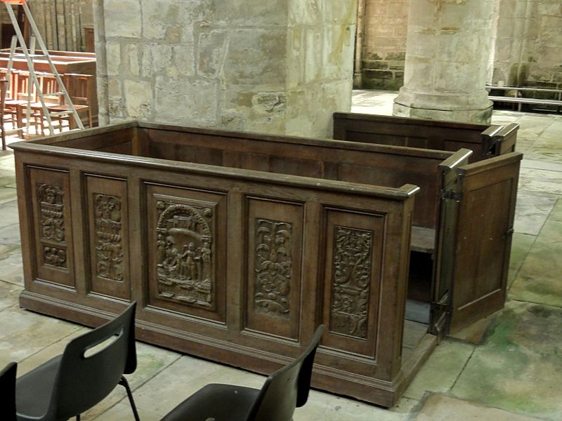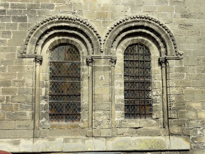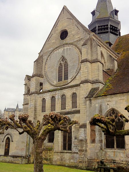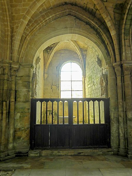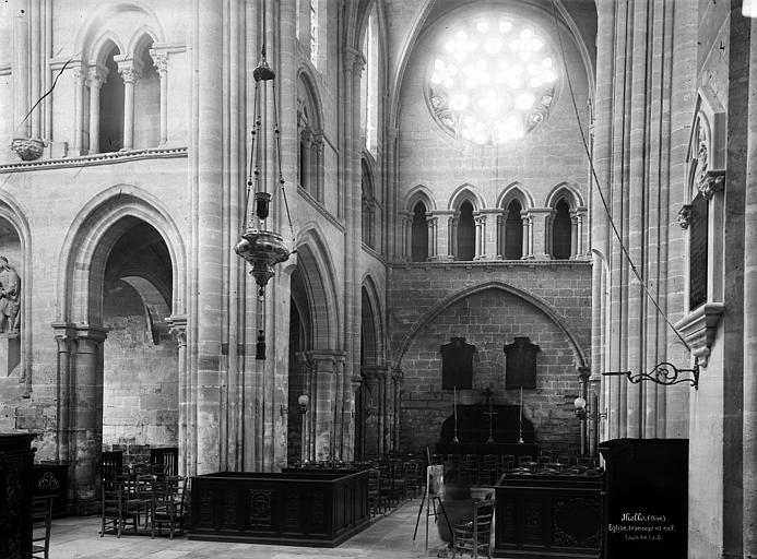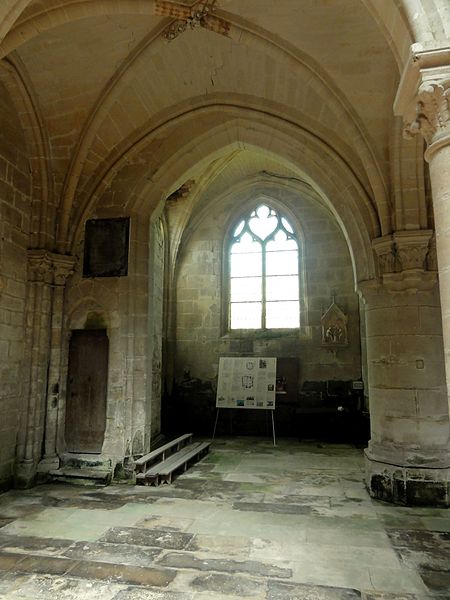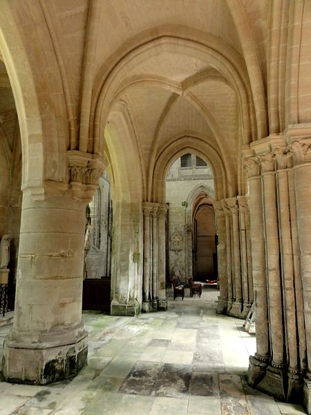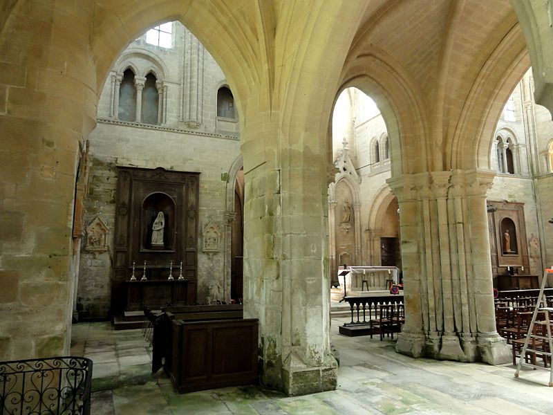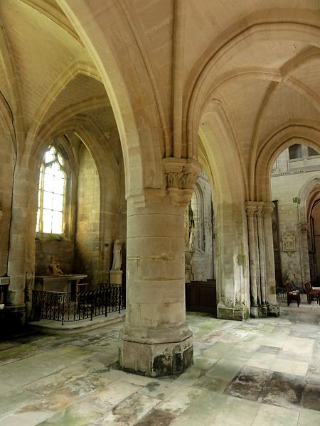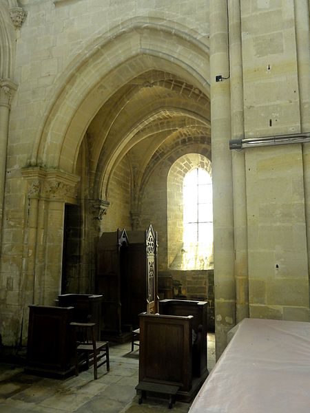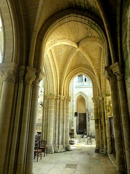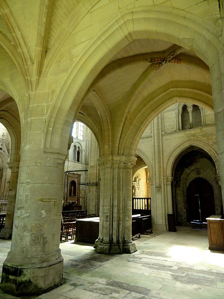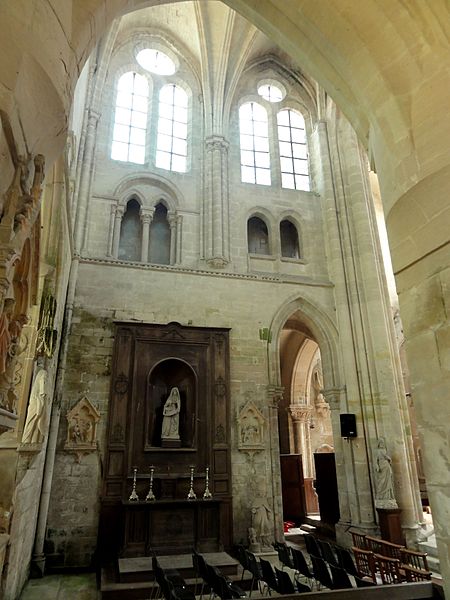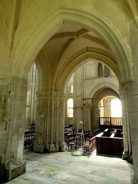 À l'intérieur, la qualité des élévations et l'équilibre des proportions compensent l'aspect extérieur hétérogène : les supports combinent tores, bandeaux et consoles, les faisceaux de colonnettes diffèrent selon les fonctions des voûtes, et le triforium adopte deux variantes selon qu'il longe les murs gouttereaux ou les murs d'extrémité. Le mur septentrional de la nef contient deux grandes arcades ouvrant sur une tribune profonde qui, selon la tradition, aurait servi de tribune seigneuriale avec accès depuis le château.