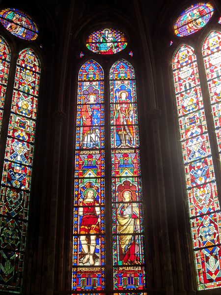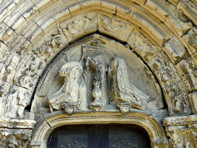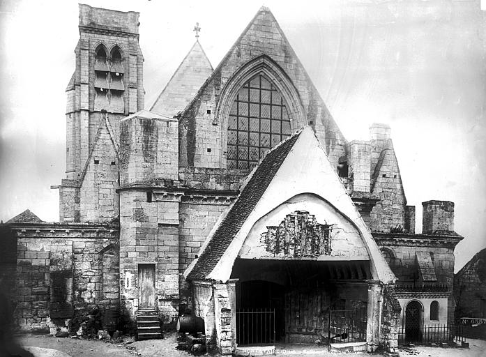À l'extérieur, le contraste entre la nef plus basse et les parties orientales élevées, les pignons aigus des bas‑côtés couverts en pierre, la frise de crochets et le soin apporté au remplage confèrent à l'édifice une silhouette caractéristique. La façade occidentale est soulignée par une galerie de circulation sous la grande baie, accessible par une tourelle d'escalier, et par deux portails en anse de panier : le portail occidental, marqué par le souvenir d'un porche du XVIe siècle, et le portail méridional, mieux conservé et précédé d'un porche sous un gâble aigu. Le tympan du portail méridional, avec un groupe de l'Annonciation remanié au XVIe siècle, a été mutilé durant la Révolution.