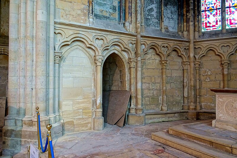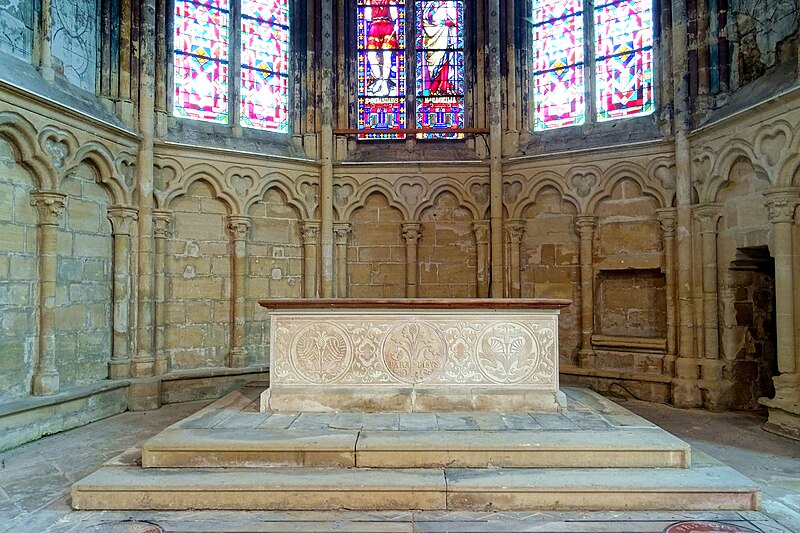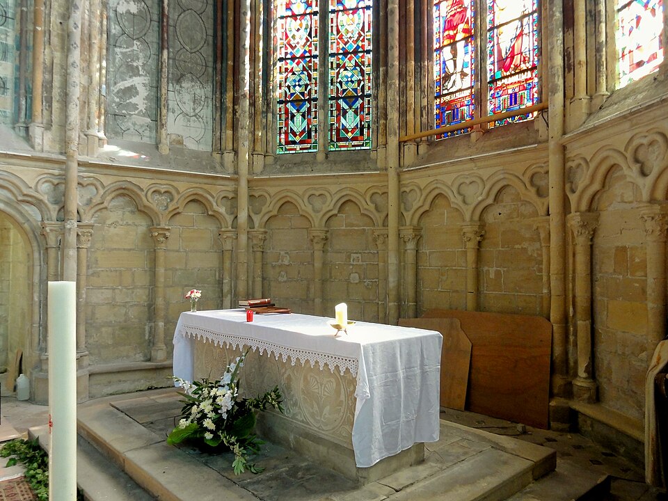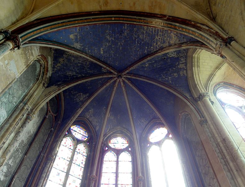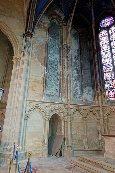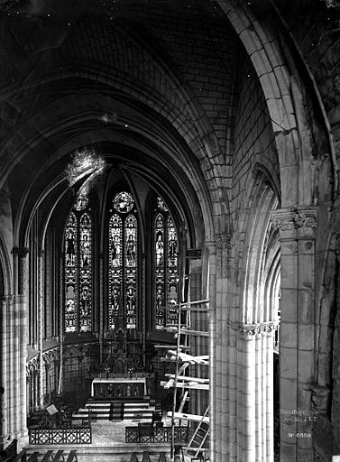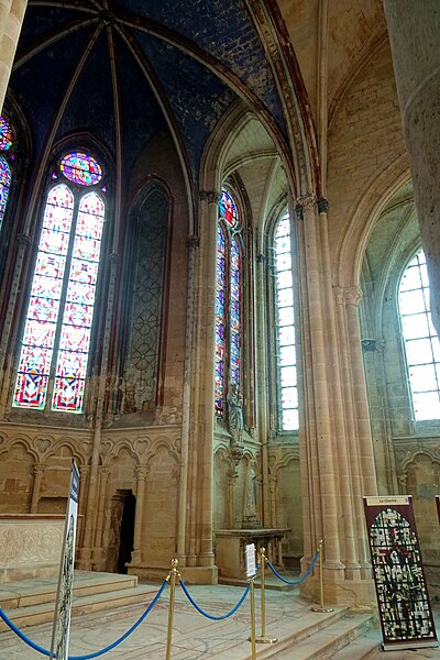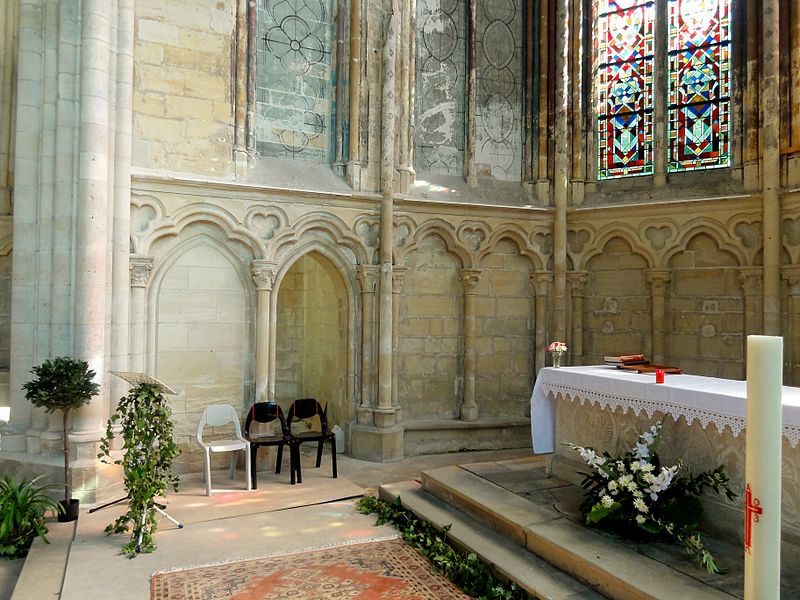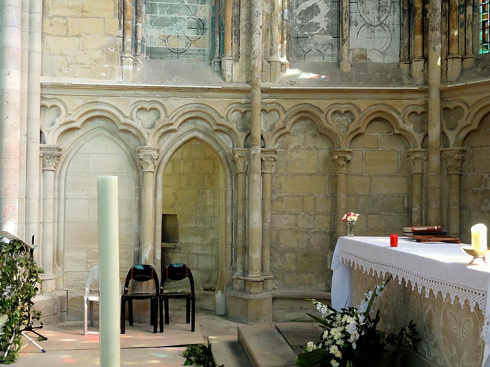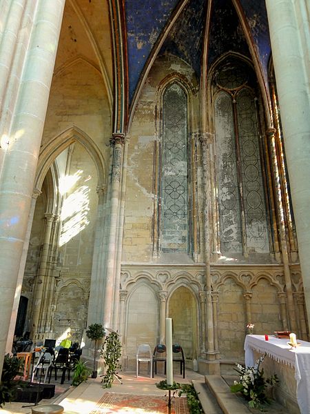 La croisée du transept et le chœur forment un ensemble homogène d'inspiration rayonnante, lumineux et élancé ; les travées droites aboutissent à l'abside dont le remplage délicat et les arcatures aveugles décorées de têtes trilobées témoignent d'un soin ornemental rare dans la région. La troisième travée et l'abside sont voûtées par une voûte à huit voûtains, proche d'une moitié de voûte sexpartite ; les clés de voûte portent des couronnes de feuillages et la polychromie appliquée au XIXe siècle cherche à imiter un état ancien. La chapelle de la Vierge possède une importante verrière colorée et abrite la seule œuvre classée au titre des monuments historiques de l'église : une Vierge à l'Enfant en calcaire polychrome de 165 cm, datée du second quart du XIVe siècle, dont certaines parties et la polychromie ont été remaniées.