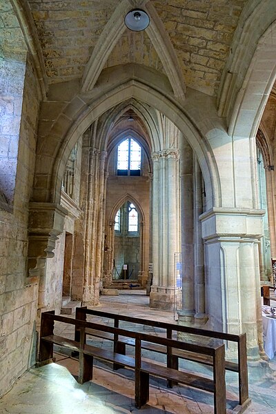 L'église est orientée légèrement vers le sud‑ouest ; elle se compose d'une nef non voûtée de trois travées flanquée de deux bas‑côtés, d'un transept peu saillant, d'un chœur de quatre travées terminé par une abside à cinq pans, d'un collatéral nord de deux travées complété par une chapelle basse, et d'un collatéral sud de trois travées dont la dernière, la chapelle de la Vierge, est voûtée à la même hauteur que le vaisseau central. Hormis la nef, l'ensemble est voûté d'ogives ; les grandes arcades en tiers‑point et les chapiteaux, parfois ornés de crochets et de feuillages naturalistes, traduisent la qualité de l'exécution. Les quatre piliers isolés de la nef portent des chapiteaux d'une grande vigueur sculpturale ; le deuxième pilier du sud conserve un décor exceptionnel, avec chimères et dragons formant un motif probablement allégorique.