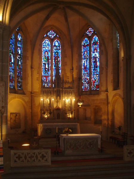 Le chœur comporte huit vitraux ; au centre figurent les apôtres saint Pierre et saint Paul, entourés des quatre évangélistes — Luc et Matthieu à gauche, Marc et Jean à droite — et, de part et d’autre, deux vitraux peu visibles depuis l’église symbolisant la Vierge Marie à l’extrémité gauche et l’Eucharistie à l’extrémité droite. La Société chorale Saint‑Étienne assure régulièrement le chant pour les offices et donne aussi des concerts dans la collégiale.