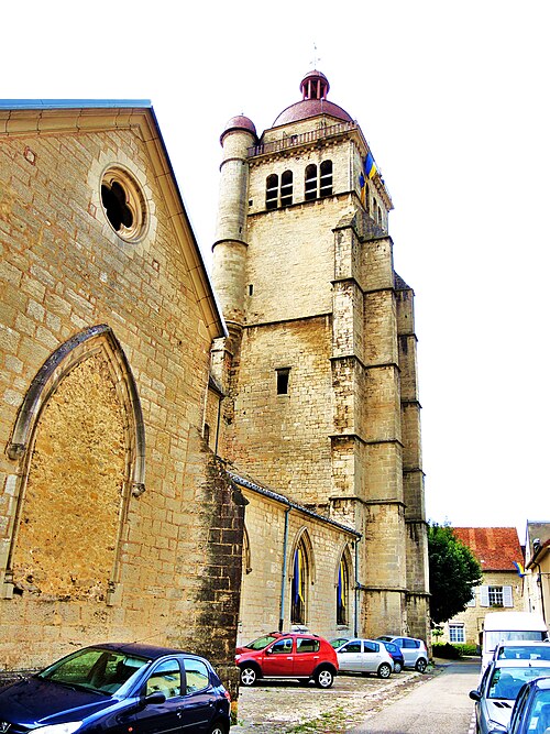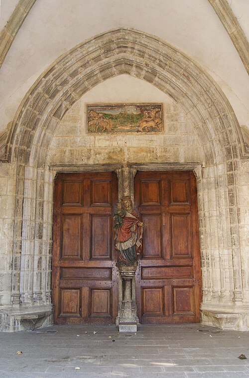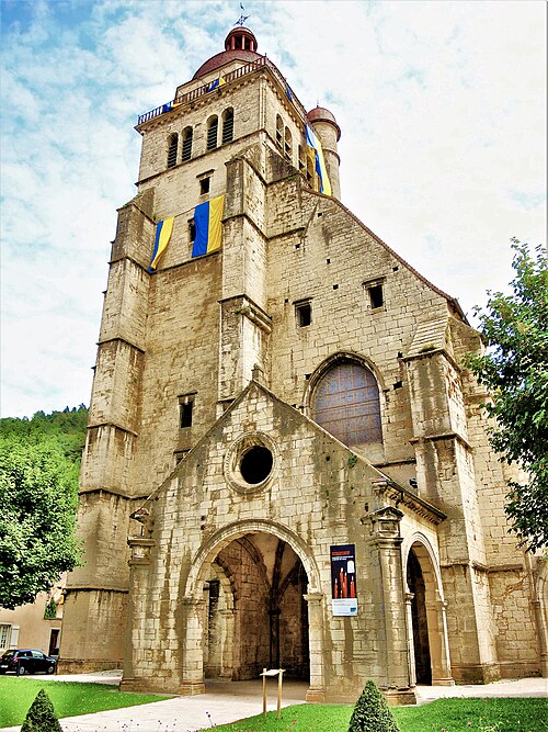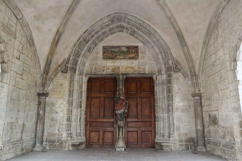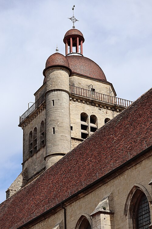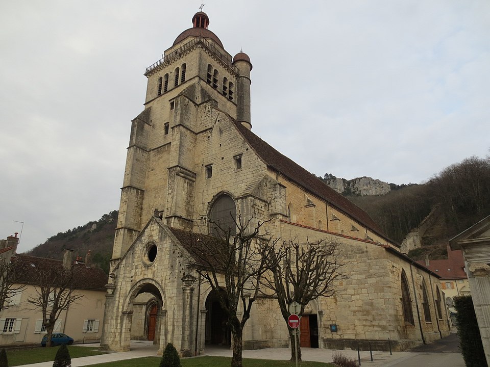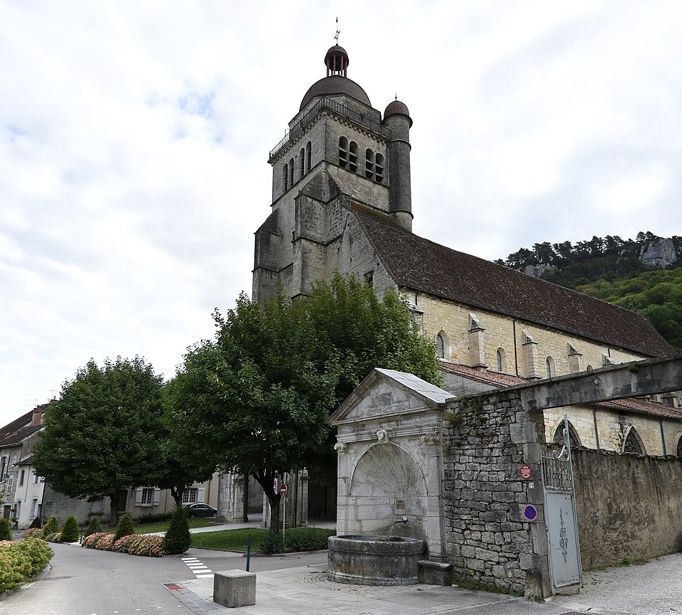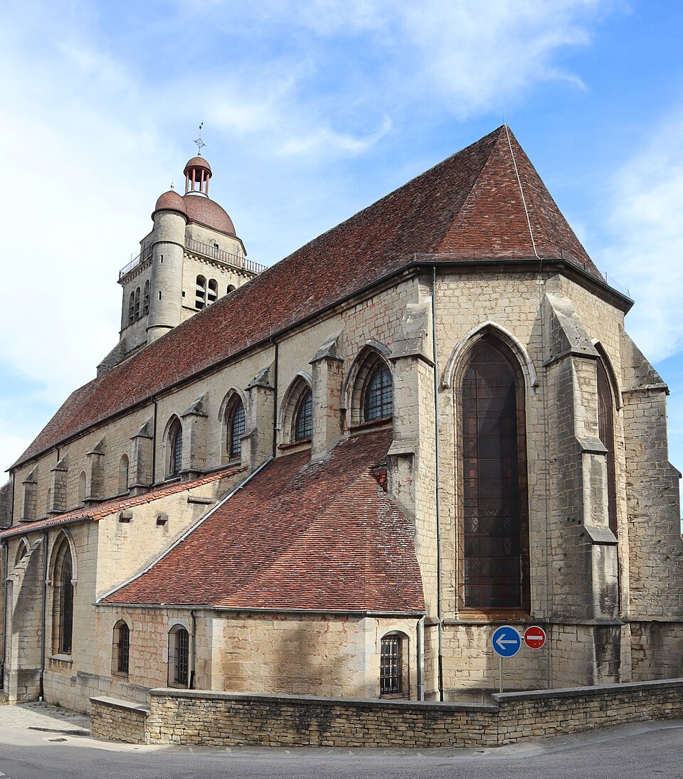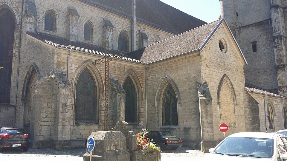 La collégiale Saint‑Hippolyte de Poligny, dans le Jura, doit sa construction aux dons de Jean Chousat, bourgeois et membre du Grand Conseil de Bourgogne, et aux enrichissements apportés par Jean Chevrot, évêque de Tournai et président du conseil de Philippe le Bon. Dès l'origine, elle cumule les fonctions de collégiale et d'église paroissiale. Classée au titre des monuments historiques en 1911, elle a fait l'objet d'une importante campagne de restauration de 1974 à 1988, incluant l'orgue. Les archives conservées permettent de connaître précisément le chantier, commencé en 1414; l'église est dédiée en 1437 et la construction, à peu près achevée vers 1440, se poursuit jusqu'en 1450 pour l'élévation du clocher. Réalisée dans les débuts du gothique flamboyant en moins d'un demi‑siècle, sa construction rapide lui confère une unité architecturale, et l'ampleur du projet s'explique notamment par la montée en puissance de Poligny lors de la séparation de la comté et du duché de Bourgogne. La tour carrée du clocher, du XVe siècle, est décentrée à gauche de la façade; elle était à l'origine coiffée d'une flèche en pierre détruite au XVIIe siècle et remplacée par un dôme. Le porche, daté du XVIIe siècle, est couvert d'une voûte d'ogives dont les arcs retombent sur des colonnes toscanes; il abrite une Vierge polychrome du XVe siècle. L'édifice est composé d'une nef flanquée de collatéraux en cinq travées, d'un chœur de deux travées et d'une abside polygonale; plusieurs chapelles s'ouvrent sur les bas‑côtés. La collégiale conserve une collection de statues de l'école bourguignonne du XVe siècle, parmi lesquelles figurent quatre statues de l'abside et les statues du Calvaire dominant l'entrée du chœur. On y trouve également une Vierge à l'Enfant attribuée à l'atelier de Jean de la Huerta (milieu du XVe siècle), une statue de saint Jacques le Majeur par Jean de la Huerta et un bas‑relief intitulé «Le Martyre de saint Hippolyte» au‑dessus du portail principal, ainsi que la statue de Jean Chevrot. Vers 1445, Jean Chevrot fit décorer sa chapelle funéraire en commandant à Rogier van der Weyden le Retable des Sept Sacrements, aujourd'hui conservé au MRBA d'Anvers. L'édifice abrite un orgue Cavaillé‑Coll.