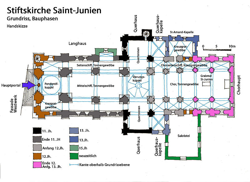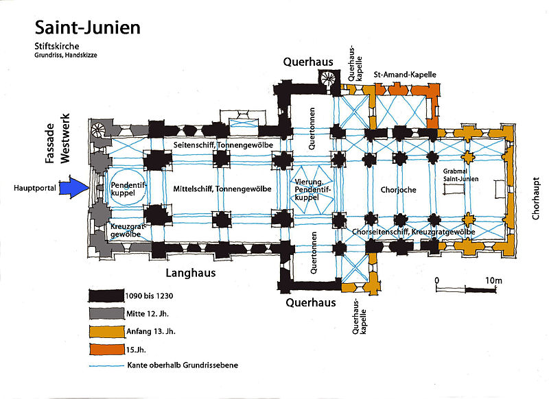 L'ancienne collégiale Saint-Junien se situe à Saint-Junien, dans le département de la Haute-Vienne, en France. Son origine remonte au VIIe siècle, lorsque l'évêque de Limoges Rorice II fit édifier un oratoire sur le tombeau de l'ermite Junien et installa un collège de chanoines pour assurer son culte. La nef et le transept, de style roman limousin, datent de la fin du XIe siècle ; la façade a été complétée à la fin du XIIe siècle et le chevet carré, d'aspect sévère, appartient au XIIIe siècle. Le clocher central, écroulé en 1922, a été reconstruit. Parmi les éléments remarquables se trouvent le tombeau en calcaire de saint Junien (XIIe siècle), une fresque de la nef représentant les vingt-quatre vieillards de l'Apocalypse (XIIe siècle) et la chapelle Saint-Martial (XIIIe siècle) qui abrite une mise au tombeau sculptée (XVe siècle). La collégiale est classée aux monuments historiques par la liste de 1840. Le chanoine et chroniqueur médiéval Étienne Maleu, qui a raconté l'histoire du chapitre de Saint-Junien, y a été inhumé.