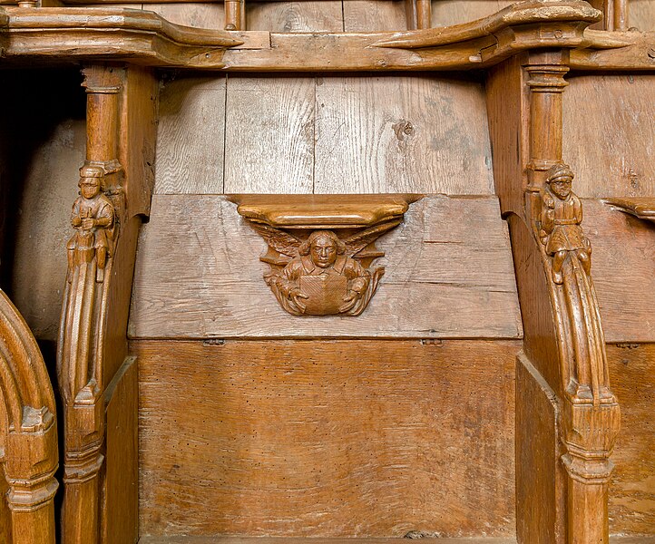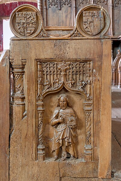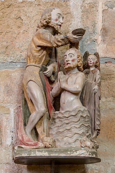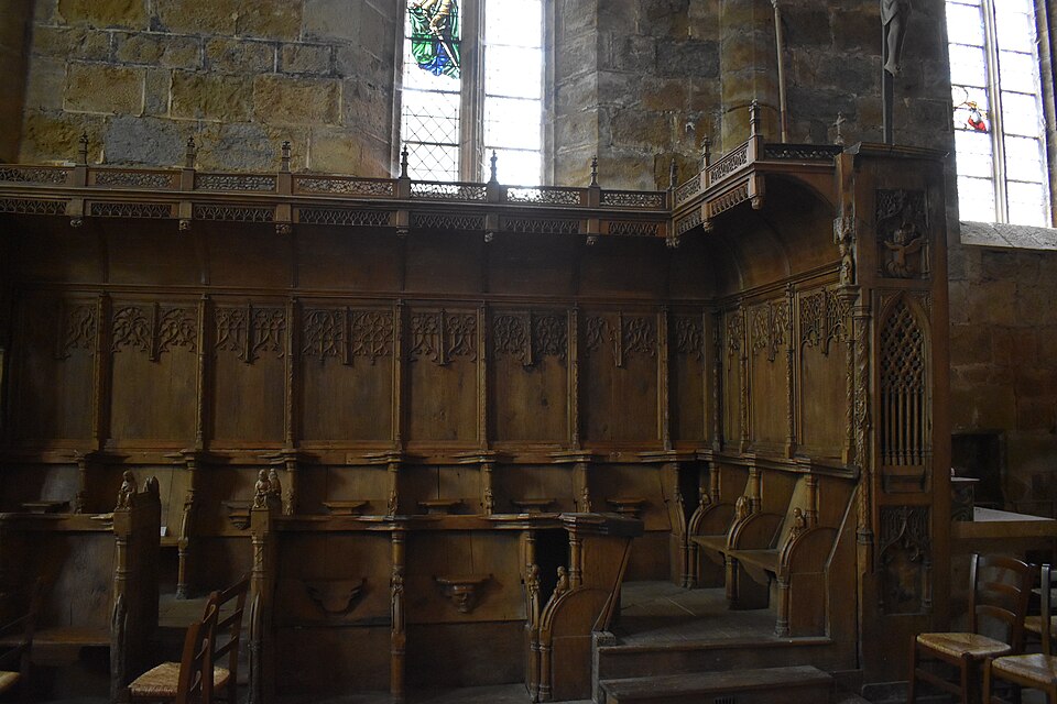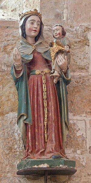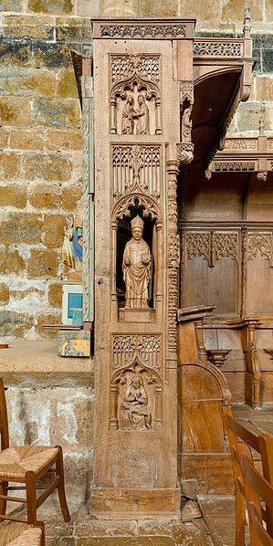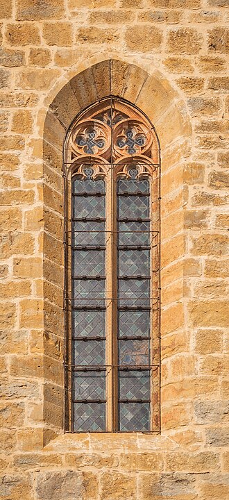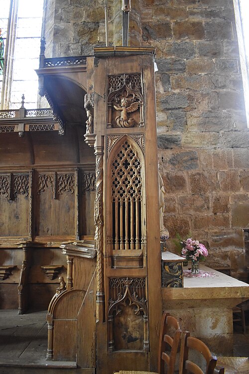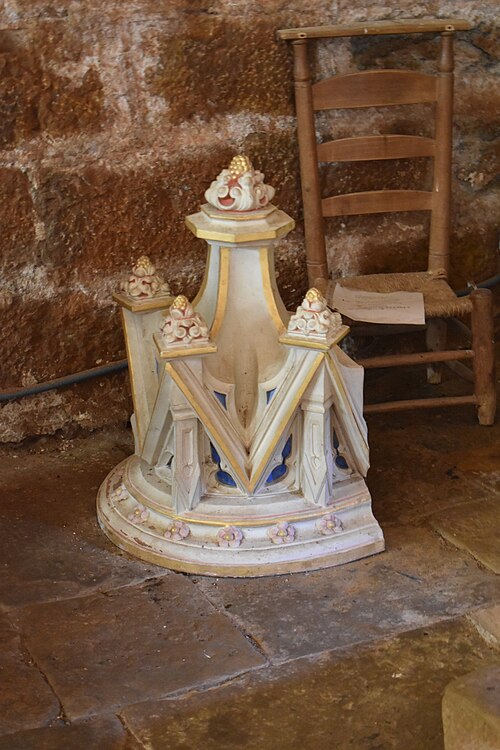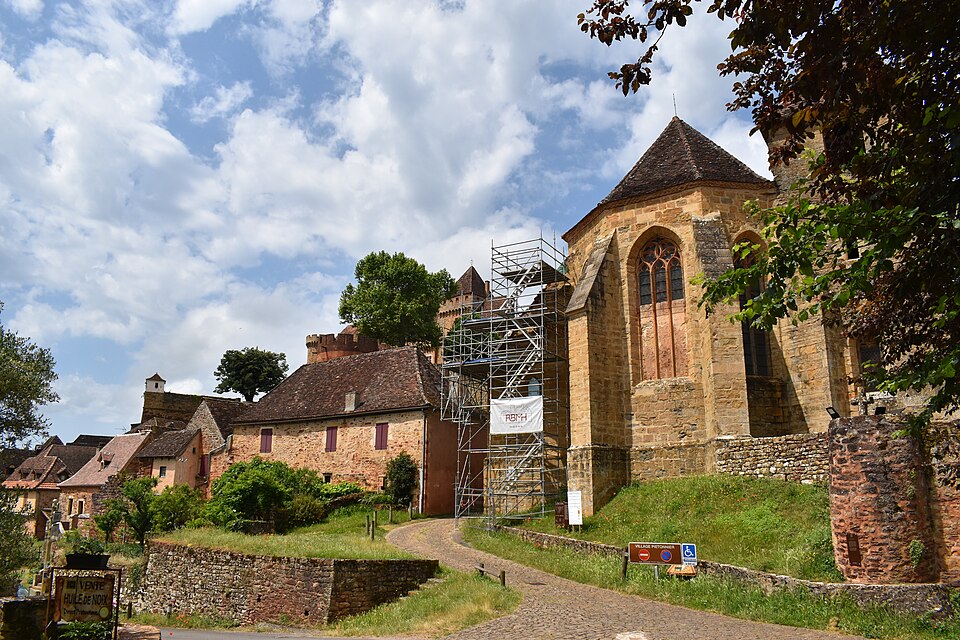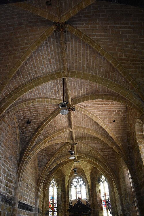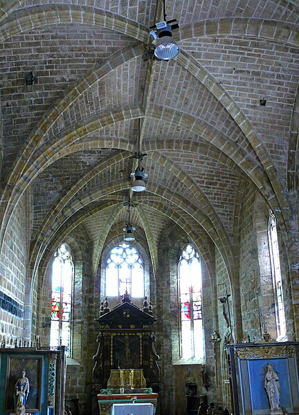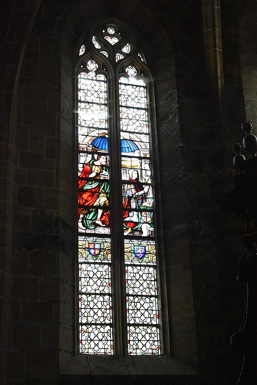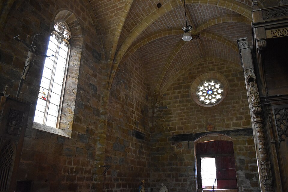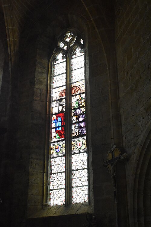 Les vitraux des baies de la nef datent du XVIe siècle, mais il n’en subsiste que des fragments remontés lors de la restauration des années 1990; la baie axiale, représentant une Crucifixion, avait été endommagée par l’installation du retable en 1663. De part et d’autre de la baie axiale figurent des verrières représentant Jean II de Castelnau en orant accompagné de saint Jean-Baptiste et son épouse Anne de Culant avec sainte Anne; Jean II s’était marié en 1459 avec Anne de Culant.