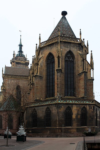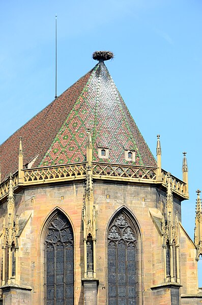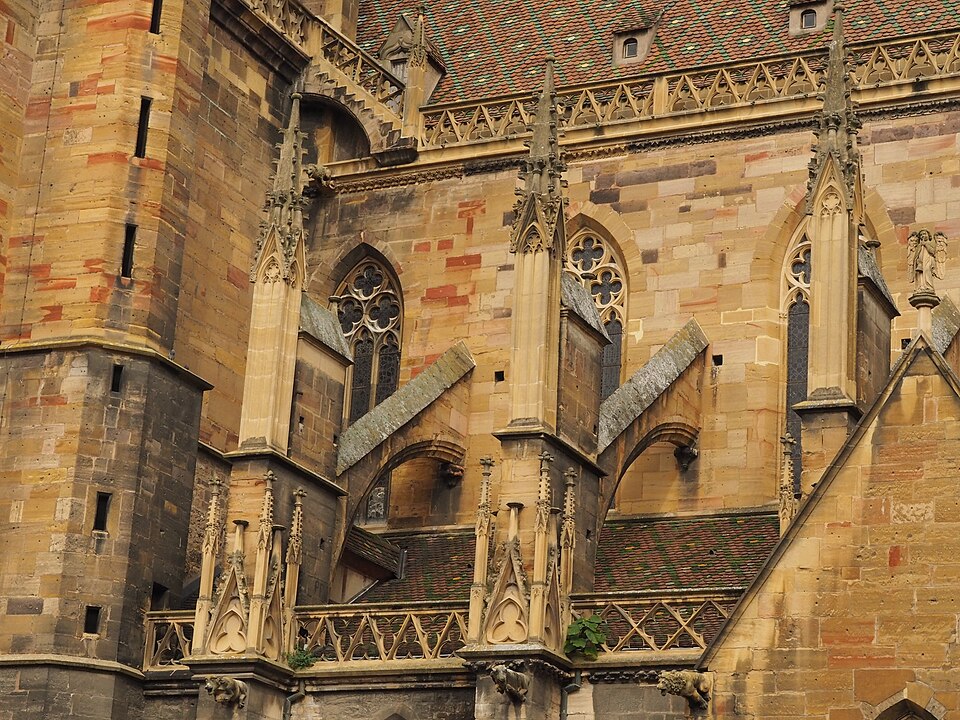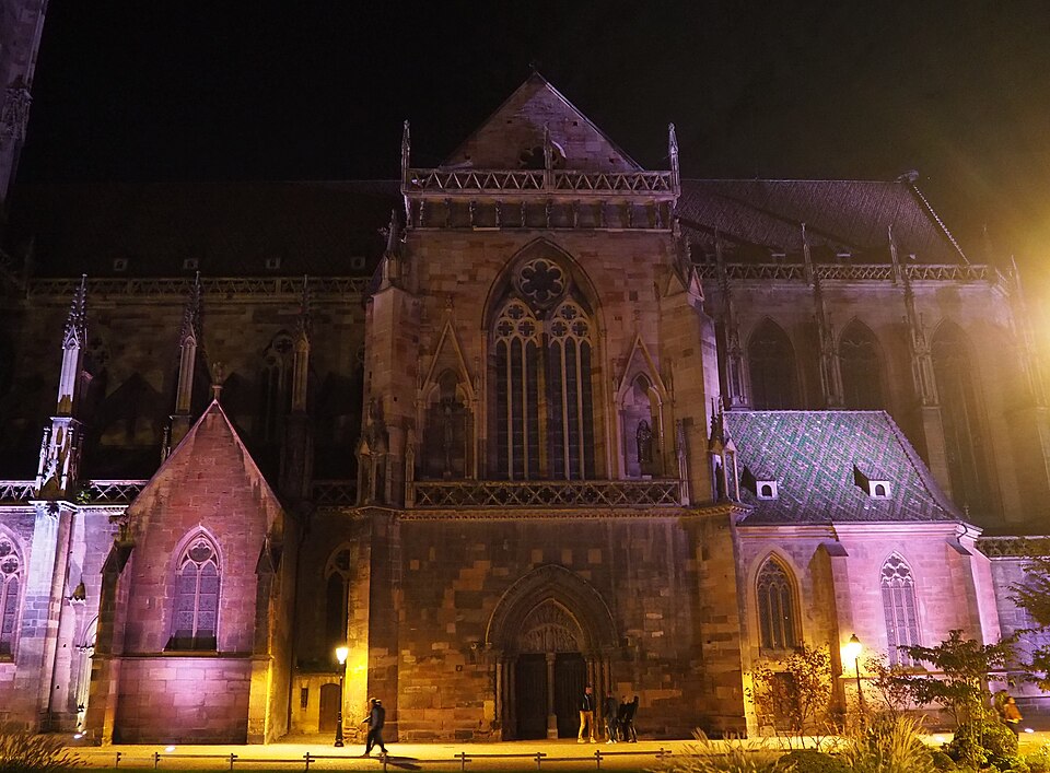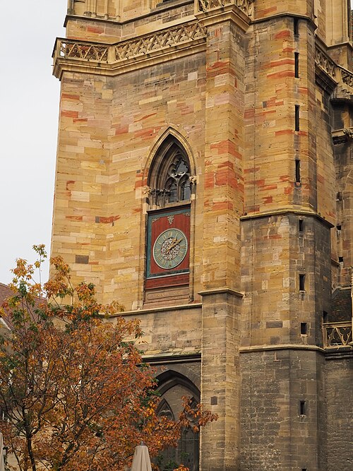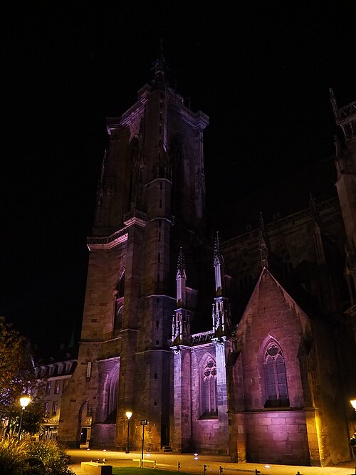 À l'intérieur, la longueur est de 78 m, la hauteur intérieure de 20 m, la largeur au transept de 34 m et la hauteur de la tour atteint 71 m. L'édifice comporte de nombreux portails — certains murés —, dont les plus importants sont ornés de tympans sculptés ; le toit coloré rappelle celui de la collégiale Saint-Thiébaut de Thann. Les massifs piliers de la façade confèrent un aspect lourd qui contraste avec l'allure aérienne des fenêtres de l'abside.