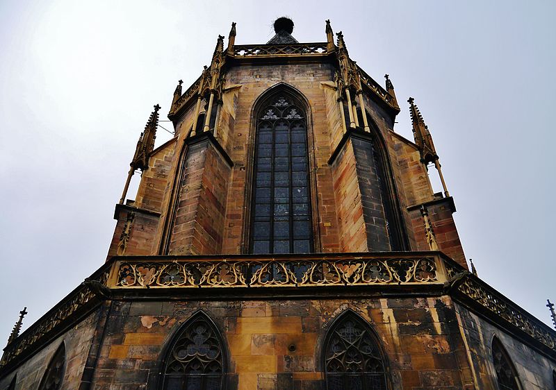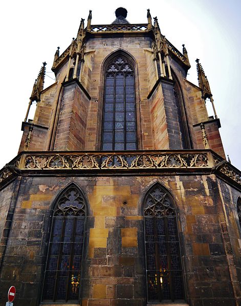 La reconstruction gothique actuelle s'étend de 1234 à environ 1365 : les travaux commencèrent par le transept, se poursuivirent par les trois nefs et les clochers sous la direction du maître Humbert, et s'achevèrent par le chœur et son déambulatoire d'après les plans de Guillaume de Marbourg. L'édifice ne fut jamais totalement mené à son terme : la tour nord prévue n'a pas été réalisée. Un incendie du 23 mai 1572 détruisit la charpente, le couronnement de la tour sud et le clocheton de la croisée ; trois ans plus tard un lanternon à bulbe remplaça le couronnement et contribue encore aujourd'hui à la silhouette caractéristique de l'église.