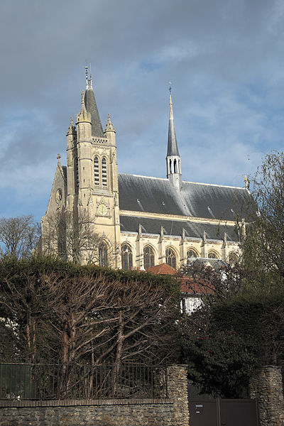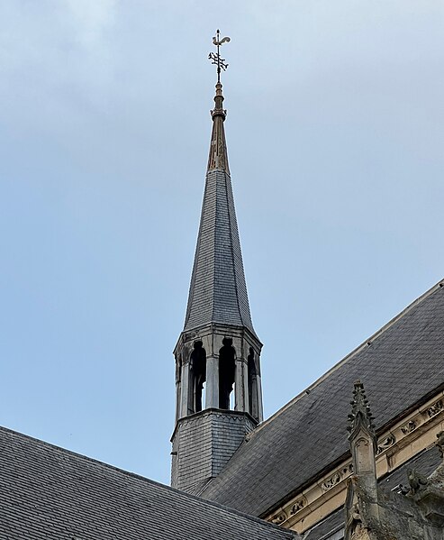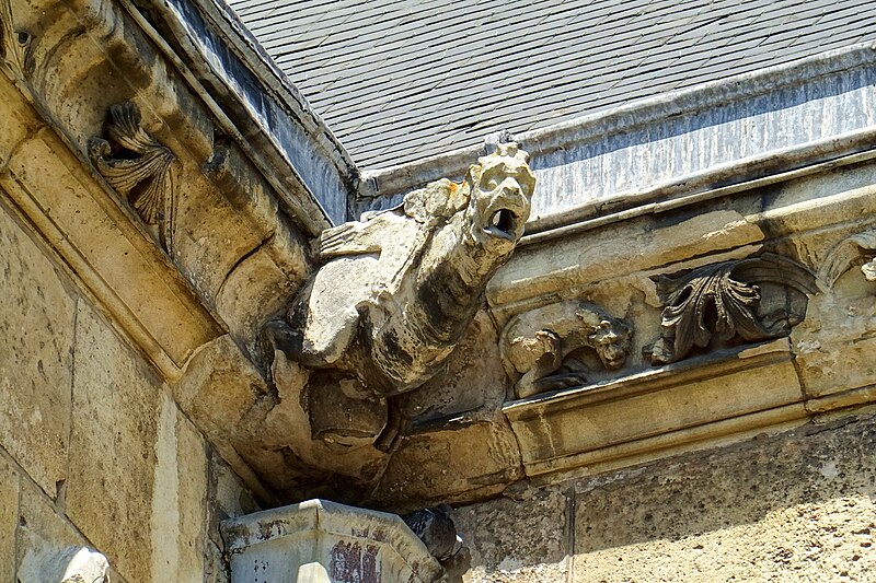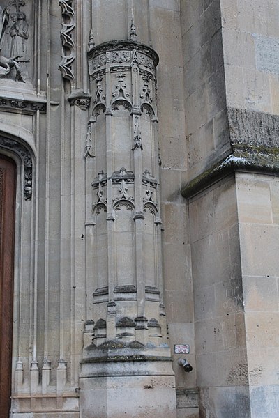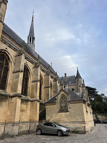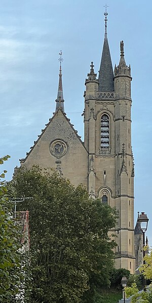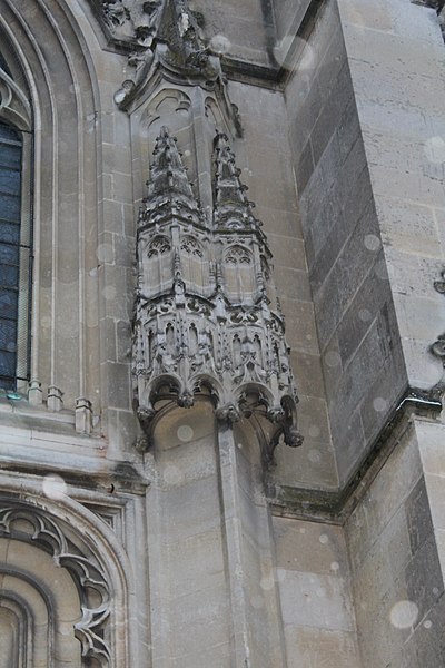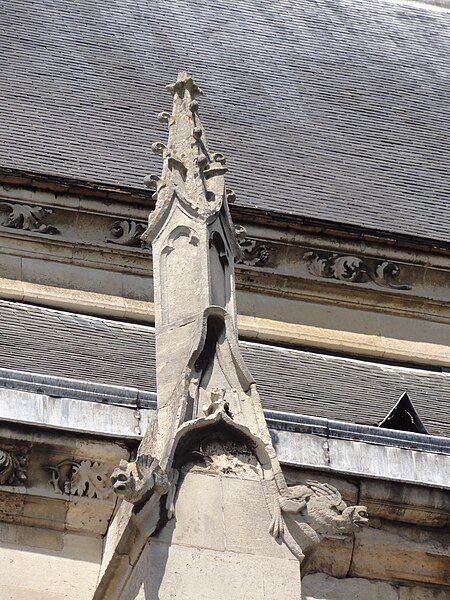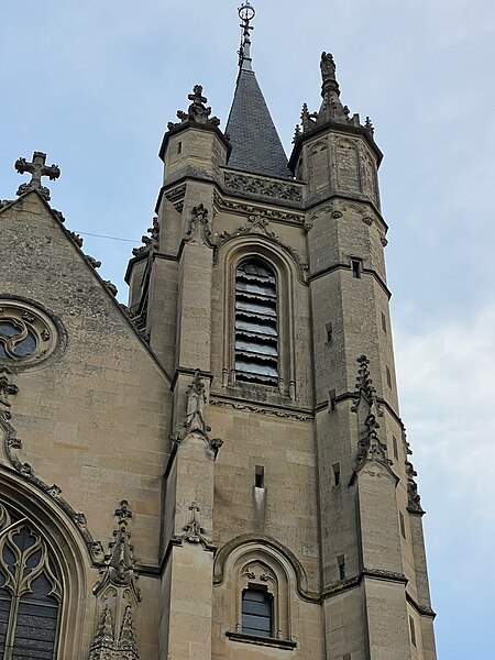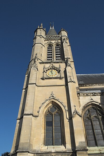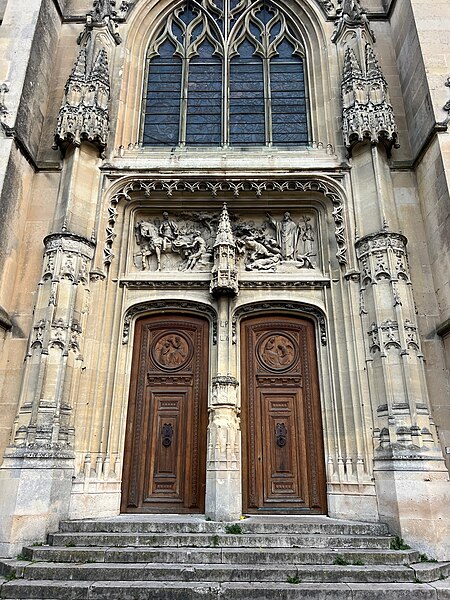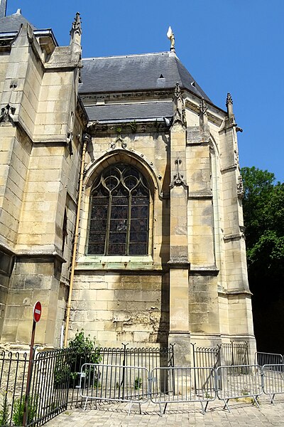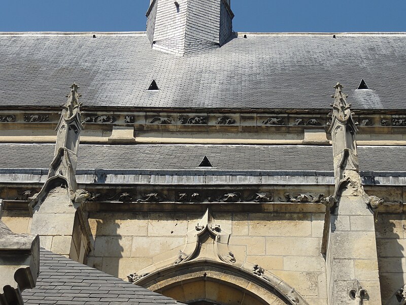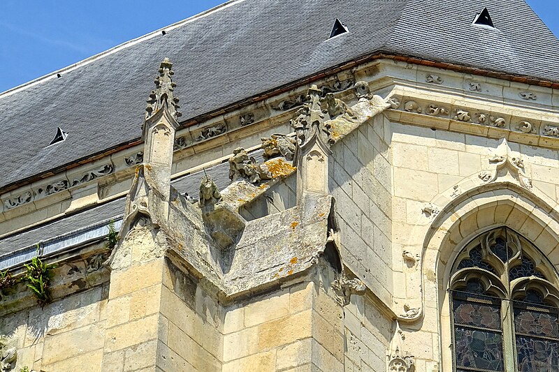 À l'extérieur, la nef aveugle cache ses murs gouttereaux derrière les toits des bas-côtés ; le petit clocher-lanternon octogonal de 1524 est coiffé d'une flèche d'ardoise et l'appareil est en pierre de taille. Les fenêtres des bas-côtés sont à lancettes avec remplages flamboyants variés, l'abside se distingue par des baies hautes et soignées et des niches à statues aux angles ; l'ornementation privilégie frises sculptées, contreforts amortis par chaperons et pinacles. Le portail septentrional conserve ses vantaux en bois taillé d'origine et un réseau flamboyant complexe orné du blason des Montmorency, tandis que la façade occidentale et le clocher néogothique reprennent et adaptent des motifs des campagnes de construction antérieures, le tympan du portail occidental portant un bas-relief d'Hippolyte Lefebvre illustrant des épisodes de la vie de Martin de Tours.