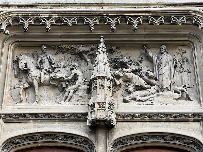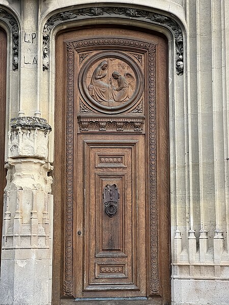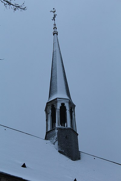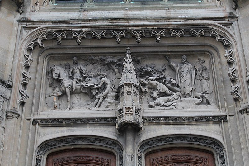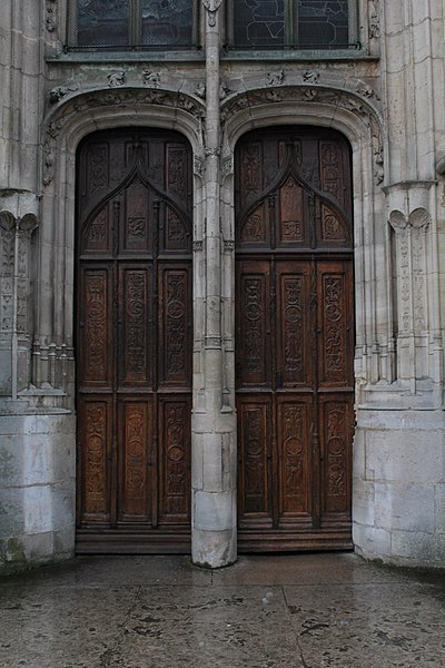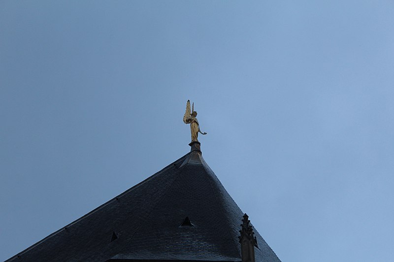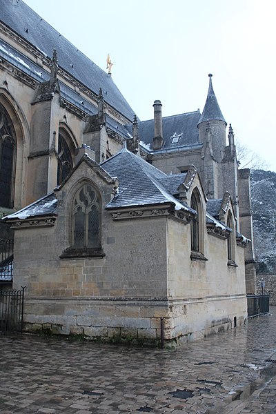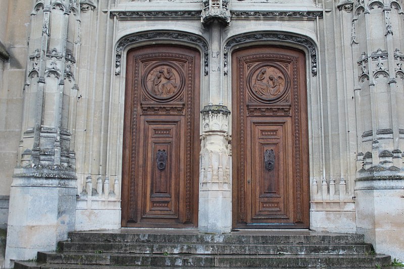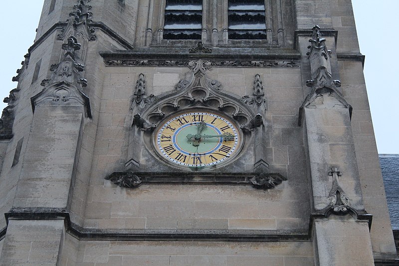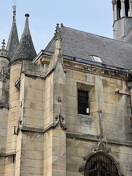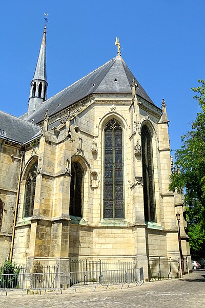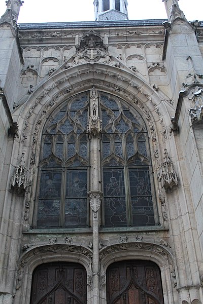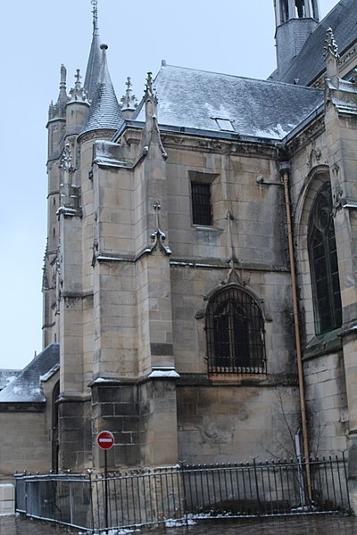 À l'extérieur, la nef aveugle cache ses murs gouttereaux derrière les toits des bas-côtés ; le petit clocher-lanternon octogonal de 1524 est coiffé d'une flèche d'ardoise et l'appareil est en pierre de taille. Les fenêtres des bas-côtés sont à lancettes avec remplages flamboyants variés, l'abside se distingue par des baies hautes et soignées et des niches à statues aux angles ; l'ornementation privilégie frises sculptées, contreforts amortis par chaperons et pinacles. Le portail septentrional conserve ses vantaux en bois taillé d'origine et un réseau flamboyant complexe orné du blason des Montmorency, tandis que la façade occidentale et le clocher néogothique reprennent et adaptent des motifs des campagnes de construction antérieures, le tympan du portail occidental portant un bas-relief d'Hippolyte Lefebvre illustrant des épisodes de la vie de Martin de Tours.
