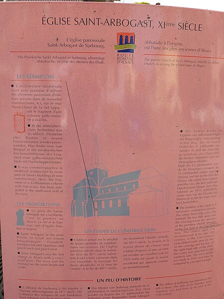 L'ancienne collégiale Saint-Martin-et-Saint-Arbogast de Surbourg, dans le Bas-Rhin (France), a été construite entre 1050 et 1060. Vers la fin du XIIe siècle, l'abside a été reconstruite; la sacristie a été ajoutée au XVe siècle et la nef a été prolongée en 1935. Elle est classée au titre des monuments historiques depuis 1874. Le portail principal et une porte latérale conservent des linteaux romans. L'intérieur offre des vues de la nef vers le chœur et vers la tribune d'orgue; les stalles du chœur et la porte de la sacristie datent du XVIIIe siècle. Les différentes campagnes de construction et de restauration témoignent d'interventions successives du XIe au XXe siècle.