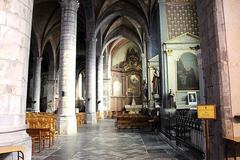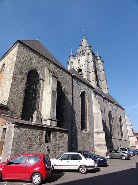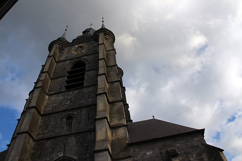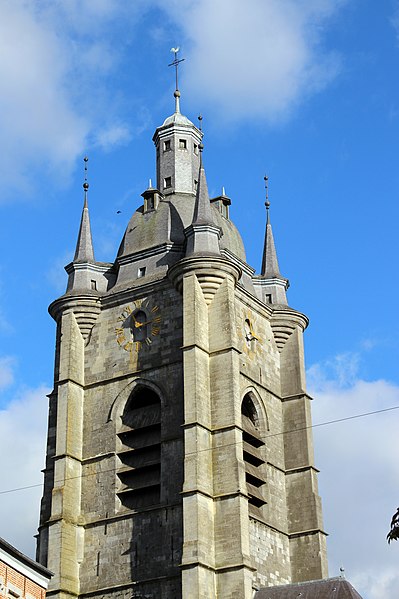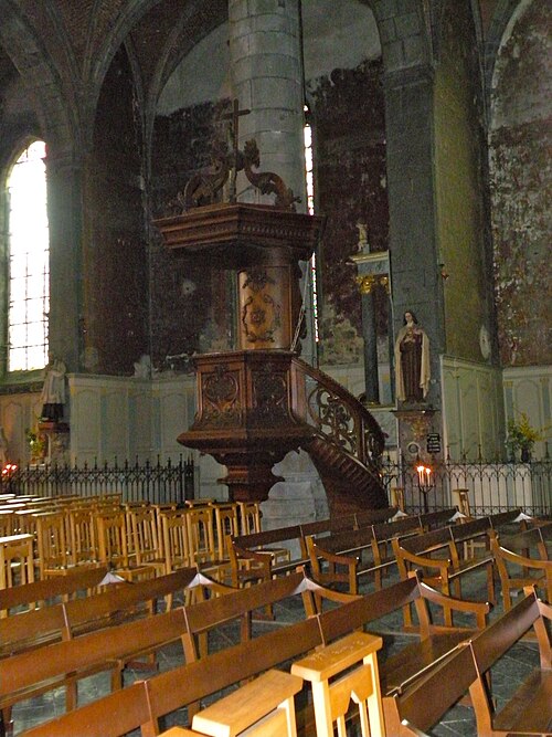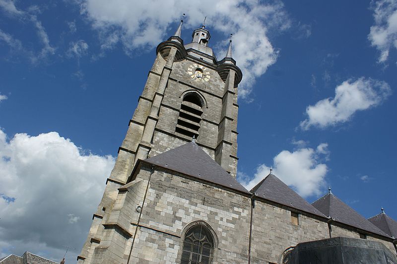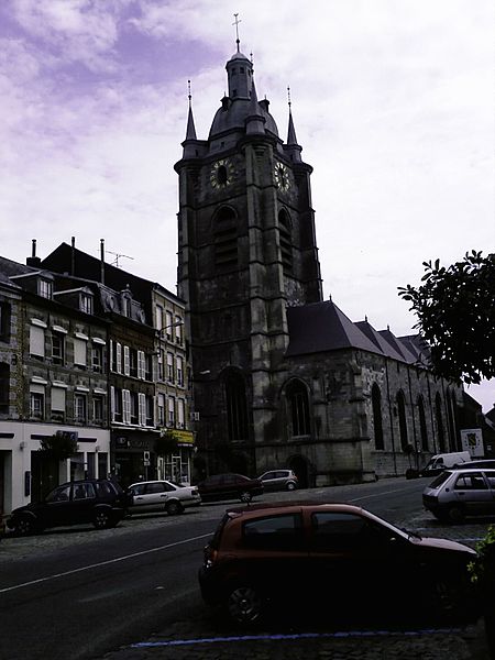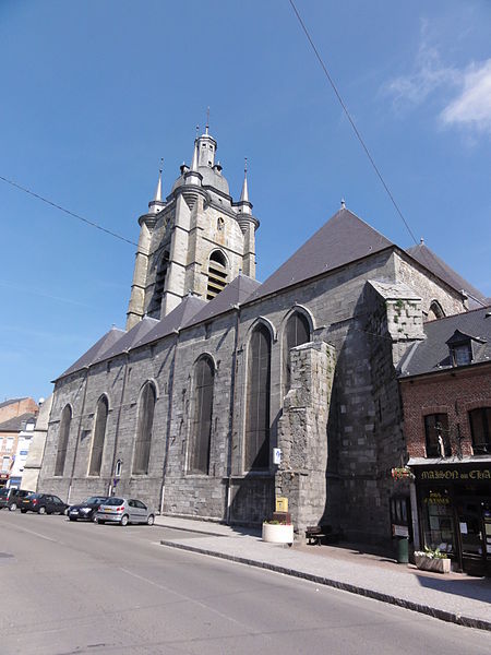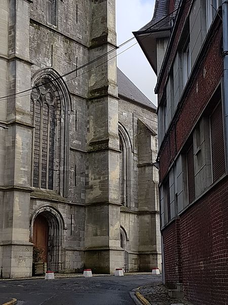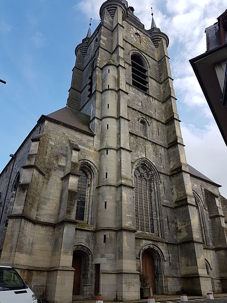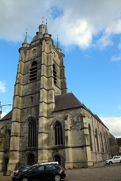 La collégiale Saint-Nicolas d'Avesnes-sur-Helpe se situe dans la commune d'Avesnes-sur-Helpe, dans le département du Nord. L'édifice, qui a connu plusieurs transformations au fil du temps, est classé au titre des monuments historiques depuis le 16 février 1913. Le 5 avril 2021, un incendie a causé d'importants dégâts à l'intérieur de la collégiale ; une enquête a été ouverte et le retable de l'autel sud a été détruit. Le chœur remonte au XIIIe siècle ; ses colonnes furent tronquées à environ trois mètres de hauteur en 1534 pour permettre l'installation des stalles des chanoines. Une grande partie de la nef a été reconstruite en pierres de Lez-Fontaine après un incendie en 1514, grâce aux libéralités de Louis d'Albret. En entrant par le portail principal, deux piliers imposants d'environ six mètres de circonférence supportent la tour. Le carillon est installé dans cette tour, qui a toujours eu un caractère communal : le beffroi de l'hôtel de ville, détruit en 1477 lors de la prise de la ville par Louis XI, fut remplacé au XVIe siècle par une seule tour servant à la fois l'église et la commune, et qui subsiste. La cloche dite « la Charlotte », donnée en 1514 par Charles Quint, a été fondue par Simon Wagheven. En partant du portail, à gauche, la quatrième chapelle Sainte-Anne présente un retable aux premiers signes de l'art baroque et est surmontée d'une statue de Sainte-Anne datée du XVe siècle ; la grande chapelle dédiée à la Vierge conserve des boiseries exécutées vers 1740 et des toiles de Louis-Joseph Watteau représentant l'Annonciation, la Visitation et, au centre, l'Assomption. À droite se succèdent la chapelle Saint-Antoine, la grande chapelle Saint-Nicolas et la chapelle Notre-Dame-des-..., pour laquelle une légende rapporte que la Vierge, entourée d'un essaim d'abeilles, aurait repoussé les Français lors d'une invasion en 1498. Le blason de Gilles Albert Denis, doyen de la collégiale, est d'azur au lion d'argent surmonté de trois abeilles d'or en chef. Le chapitre royal de Saint-Nicolas porte un écu complexe figurant un saint Nicolas pontifical dans une niche, une cuve avec trois enfants, et un écusson losangé brochant, accompagné de plusieurs quartiers héraldiques détaillés. Parmi les doyens de la collégiale se succèdent notamment Gilles Albert Denis (décédé en 1699), M. C. Hannoye (décédé en 1897), M. Hécart (1897-1903), M. Deligny (1903-1908), M. Daubresse (1908-1914), M. Gir (décédé en 1924), M. A. Inglart (1924-1935), M. Elie Deloge (1936-1939), le chanoine J. Bouché (décédé en 1963), le chanoine R. de la Motte Saint Pierre (1963-1970) et l'abbé J. Rousseaux (1970-1974). Jeanne de Lalaing (†1467) est inhumée dans la collégiale auprès de son mari Olivier de Blois (†1433). Parmi les éléments signalés en iconographie figurent une vue intérieure de 1903, le chœur, la pierre tombale d'Olivier de Blois, l'orgue et le triptyque de l'Assomption avec l'Annonciation à gauche et la Visitation à droite. Pour approfondir, on peut se reporter à la notice d'Adolphe-L. Bourgeois intitulée Notice sur le chapitre de Saint-Nicolas d'Avesnes (Avesnes : Dubois-Viroux, 1856).