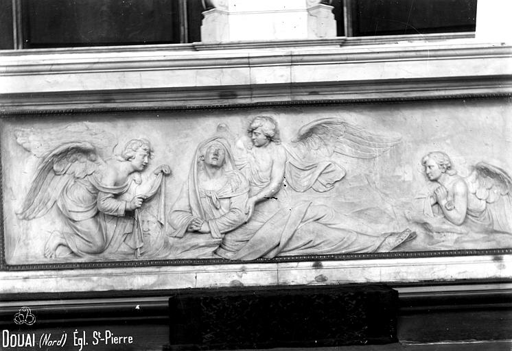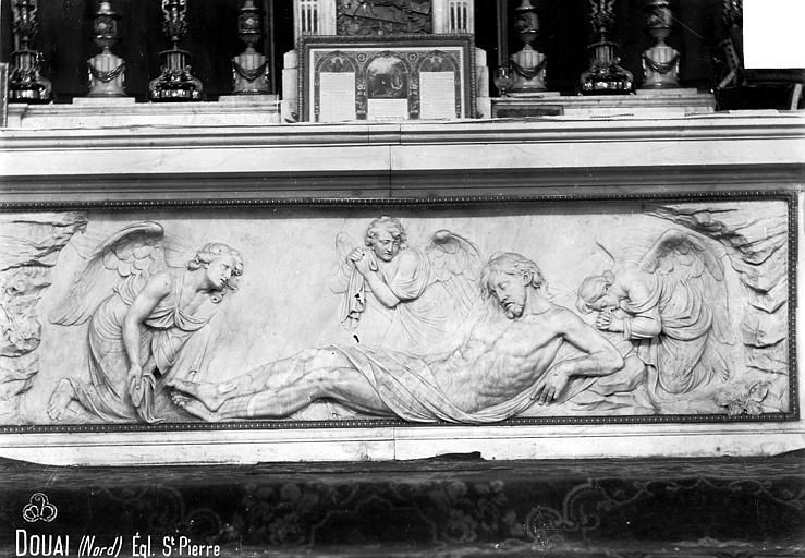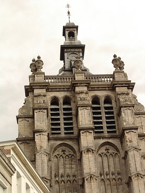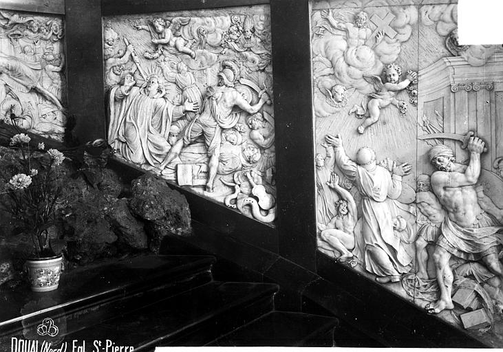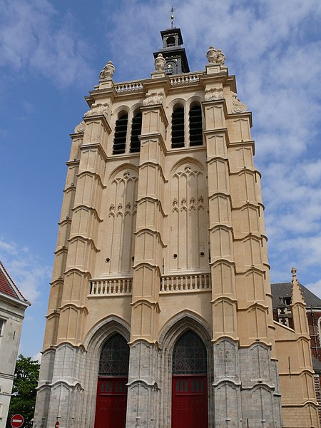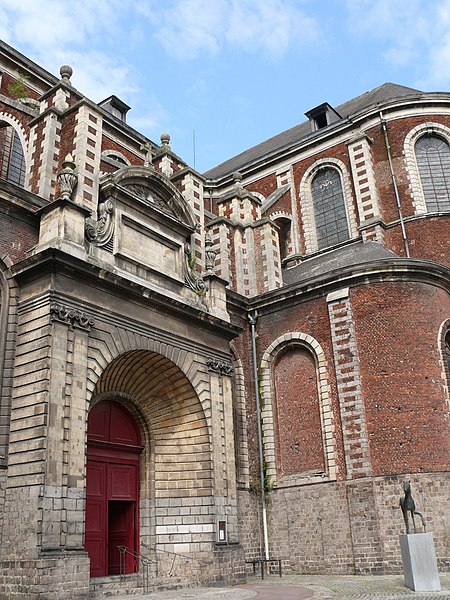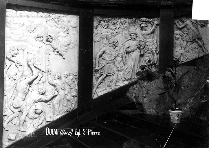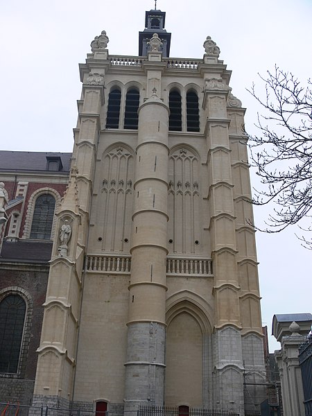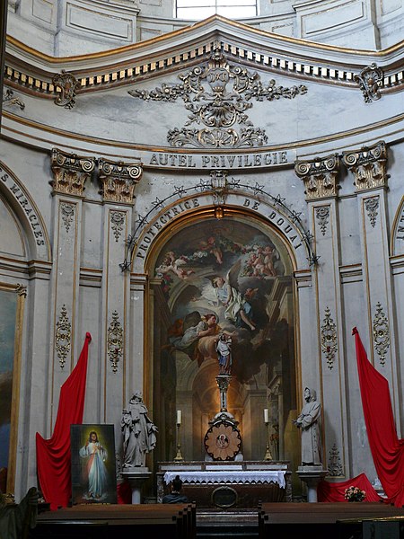 La collégiale Saint-Pierre de Douai, située dans le Nord de la France, est l’une des rares églises de la ville aux côtés de la collégiale Saint-Amé. Elle s’étend sur 112 mètres, ce qui en fait la plus longue au nord de Paris, et elle est classée au titre des monuments historiques depuis le 21 février 1974. À l’origine église paroissiale, elle fut élevée en collégiale probablement en 1113 par le comte de Flandre Baudouin VII ; elle exerçait la juridiction sur l’ensemble des paroisses de la rive droite de la Scarpe. Jean Rayne, échevin de la ville victime d’une erreur judiciaire en 1364, fut inhumé dans la chapelle Sainte‑Croix par arrêté du conseil du roi. Le clocher a été rebâti entre 1513 et 1687, mêlant styles gothique et classique, et son couronnement a été refait en 1904–1905. Le vaste édifice actuel date de 1735–1750 après que l’église précédente, menaçant ruine, fut interdite au culte et démolie en 1734. La reconstruction aurait été commandée vers 1740 par des membres du Parlement sous l’impulsion de son président Charles‑Joseph de Pollinchove ; l’architecte municipal était Antoine‑Joseph Lefebvre, bien que certaines sources attribuent les plans à Brissy de Bruxelles. L’église, en croix latine, comprend trois nefs, un transept aux extrémités arrondies et une chapelle axiale coiffée d’un dôme du XVIIIe siècle. Remarquable par son harmonie et son classicisme mêlé d’éléments gothiques flamands, l’édifice renferme de nombreux tableaux de l’école française du XVIIIe siècle, un retable du début du XVIIe siècle, des sculptures en marbre des XVIIe et XVIIIe siècles, ainsi que du mobilier (chaire, autels, grille) daté du XVIIIe siècle ; sous l’autel de la coupole repose une chasse en argent doré du XIIIe siècle. Le bâtiment actuel mesure 112 mètres de longueur sur 42 mètres de largeur et la hauteur des voûtes atteint 25 mètres. La tour carrée, édifiée de 1512 à 1686, porte sur un pilier la date de 1518, n’a jamais reçu la flèche prévue et a résisté aux sièges de 1710 et 1712. Lors de la Révolution, les six cloches furent déposées et la collégiale devint le Temple de la Raison ; dégradée au XIXe siècle, sa partie supérieure fut restaurée en 1903–1904 avec balustrade classique, clochetons et vases Médicis. En 1917 l’occupation entraîna un nouvel enlèvement des cloches, dont trois furent refondues dans les années 1920 par les établissements Wauthy de Sin‑le‑Noble. La tribune supporte l’orgue monumental : l’instrument principal, construit originellement pour l’abbaye d’Anchin en 1732 et transféré en 1792, connut de nombreuses restaurations, fut pillé en 1917 puis enrichi en 1922 par un orgue Cavaillé‑Coll/Mutin conçu entre 1910 et 1914 ; cet instrument de style symphonique français possède quatre claviers, 69 jeux et environ 4 400 tuyaux, est classé aux Monuments historiques depuis 2002 et ses titulaires actuels sont Marc Carlier, Denis Tchorek et Henri Vitté. Il fonctionne avec une transmission mécanique complétée de machines Barker, sommiers à registres et divers dispositifs pneumatiques et mécaniques de combinaisons. L’orgue de chœur, construit en 1856 par Merklin avec un buffet en chêne des établissements Buisine, restauré en 1952 par Jean Pascal, compte onze jeux, un clavier de 54 notes, un pédalier de 30 notes et environ 570 tuyaux. À gauche de l’entrée, sous la tour, un mémorial et un reliquaire rappellent que Douai offrit pendant 125 ans refuge aux catholiques anglais, avec une mention de saint John Southworth. Un monument commémoratif évoque aussi la fondation de l’université de Douai, autorisée en 1559 selon une bulle papale (attribuée par d’autres sources à Philippe II), ouverte en 1562 avec cinq facultés et dotée d’un réseau de collèges et de séminaires qui lui valut une large renommée. Le transept gauche abrite un autel de marbre et des chandeliers provenant de l’abbaye de Marchiennes, une toile attribuée à Lagrenée et trois mausolées, dont celui de Charles‑Joseph de Pollinchove sculpté par Christophe‑Gabriel Allegrain. La chapelle Notre‑Dame des Miracles, commencée en 1523, s’ouvre sur le dôme depuis un déambulatoire; elle conserve une madone du XVIe siècle, des guirlandes de Nicolas Brenet (1768), six tableaux et des œuvres modernes comme le chemin de croix de Jean‑Paul Blanc. La chapelle Saint‑Laurent présente un buste de saint Roch et une Résurrection de Lazare d’Abraham Janssens. Le maître‑autel, de style Louis XV, est du XVIIIe siècle et est flanqué de statues en plâtre de Théophile Bra représentant saint Pierre et saint Paul. Le transept droit reçoit un calvaire provenant de l’abbaye de Flines, six panneaux de marbre blanc de l’abbaye de Saint‑Amand dus à Schleiff, ainsi que des œuvres et bas‑reliefs venus des abbayes d’Anchin et de Marchiennes. Une relique attribuée à l’apôtre Jacques — une arcade sourcilière donnée au Moyen Âge — fut retrouvée dans l’église Saint‑Jacques de Douai et doit être exposée dans le narthex de la collégiale dans un reliquaire initialement dédié à saint Roch. L’hostie du miracle eucharistique de Douai, reliée à une vision de 1254 survenue à la collégiale Saint‑Amé et décrite par Thomas de Cantimpré, est conservée dans la collégiale Saint‑Pierre. Une importante campagne de réfection de la toiture en ardoises sur 3 000 m2 et de la zinguerie a été engagée en 2009; les travaux, réalisés en six phases sur dix ans pour un coût estimé à 5 millions d’euros, ont été inaugurés le 22 juin 2019 en présence de Marc Drouet, directeur régional des affaires culturelles des Hauts‑de‑France.