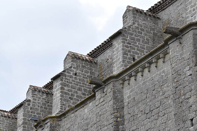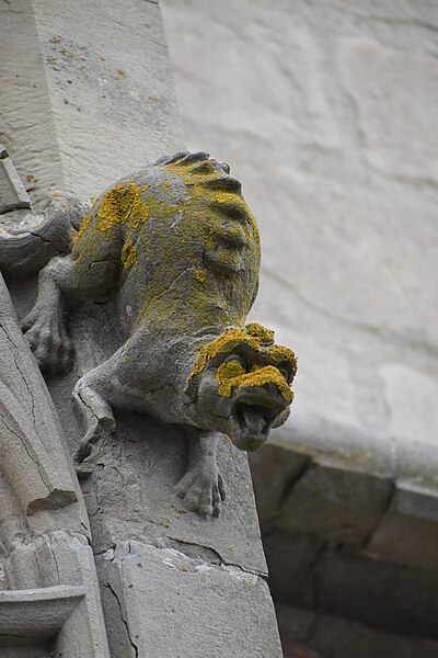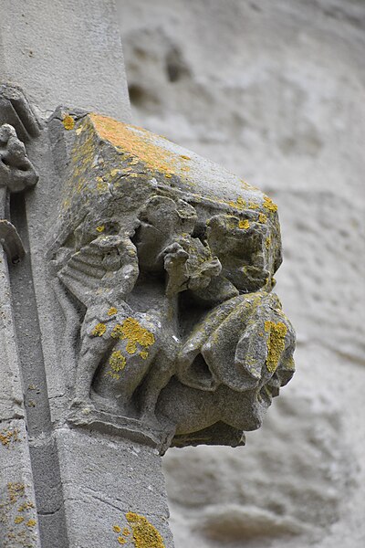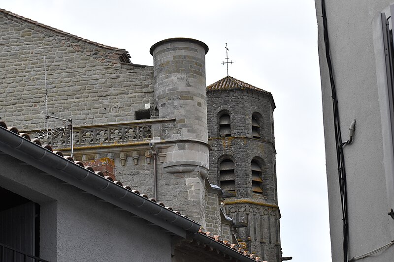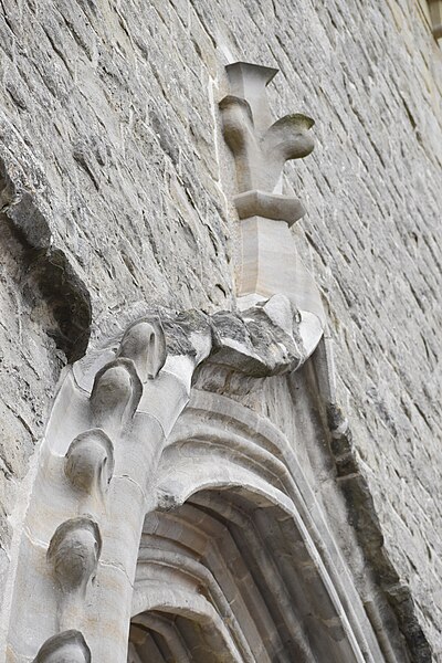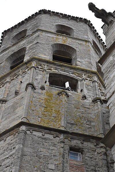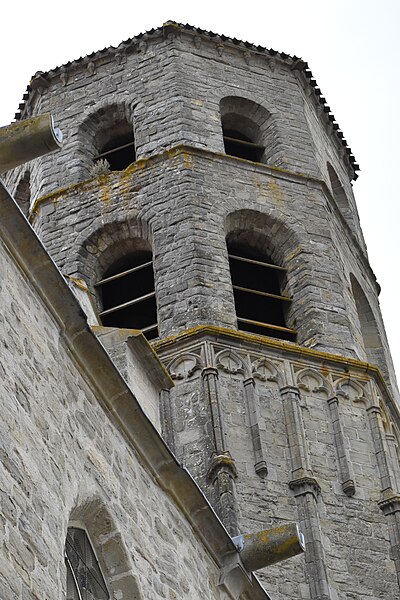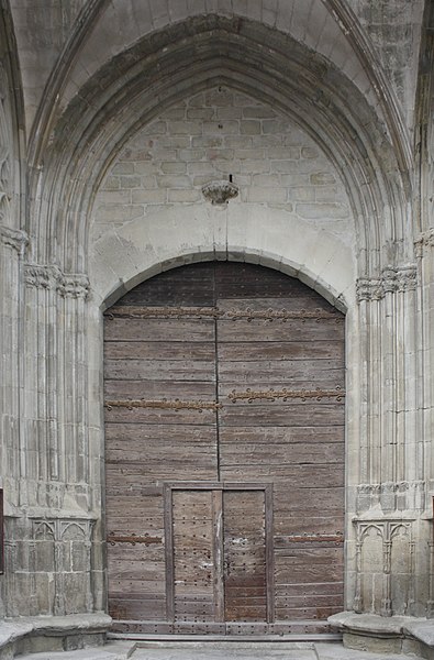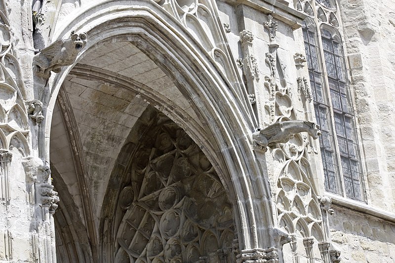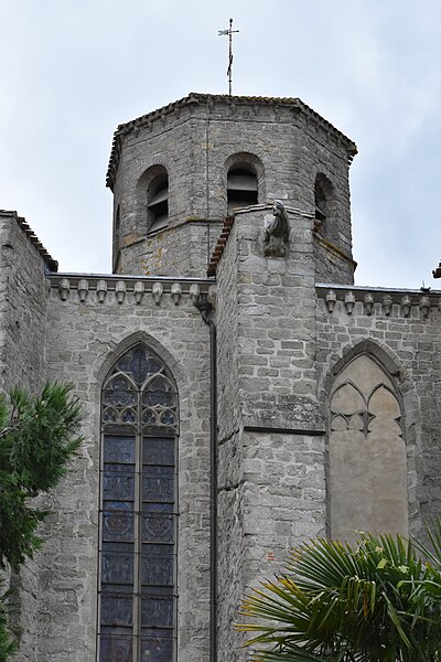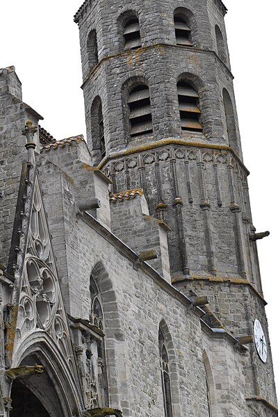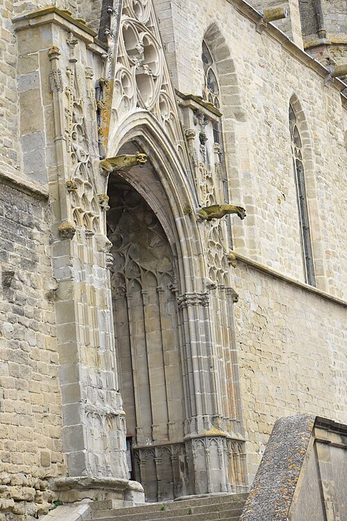 La façade méridionale présente en son centre un porche richement sculpté, précédé d'un large escalier à deux degrés, dont le gâble masque en partie une rosace percée au-dessus de la porte. À l'est s'élève une haute tour octogonale coiffant le clocher et ornée d'arcatures aveugles, tandis qu'à l'ouest une tourelle circulaire surmonte un encorbellement d'angle ; de part et d'autre du portail d'entrée s'ouvrent six hautes fenêtres, trois de chaque côté, qui éclairent les chapelles latérales. Le portail secondaire de la façade occidentale est assez détérioré et, au nord de cette même façade, une tourelle octogonale fait pendant au clocher ; le chevet polygonal est en partie masqué par la sacristie de 1763.