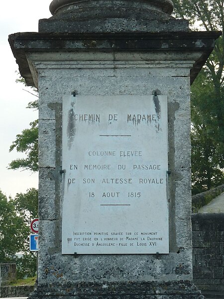 La colonne de la duchesse d'Angoulême, située à Angoulême (Charente), est une colonne ionique au chapiteau décoré d'oves, surmontée d'une sphère en pierre ; sa base repose sur un cube de pierre mouluré. Le dessin de la colonne fut fourni par le père de Paul Abadie. Elle a été élevée en 1816, pendant la Seconde Restauration, pour commémorer l'entrée de Marie-Thérèse, fille aînée de Louis XVI et épouse du duc d'Angoulême, dans la capitale du duché. Le passage célébré a eu lieu le 18 août 1815, après un report imputé au débarquement de Napoléon et aux Cent-Jours ; d'autres sources mentionnent le 25 septembre. Le duc d'Angoulême, fils du comte d'Artois et futur Charles X, était déjà passé à Angoulême en 1814, la ville ayant aussi vu le passage de Napoléon en 1809. La colonne occupe un lacet de l'avenue Wilson, en dessous du rempart de Beaulieu et du Jardin vert, à mi-pente. L'avenue, autrefois appelée chemin de la Rotonde et surnommée chemin de la Folie avant 1815, prit ensuite le nom de Chemin de Madame en l'honneur du passage ; elle porte aujourd'hui le nom d'avenue du président Wilson depuis le début du XXe siècle. La colonne est inscrite au titre des monuments historiques depuis le 29 novembre 1948.