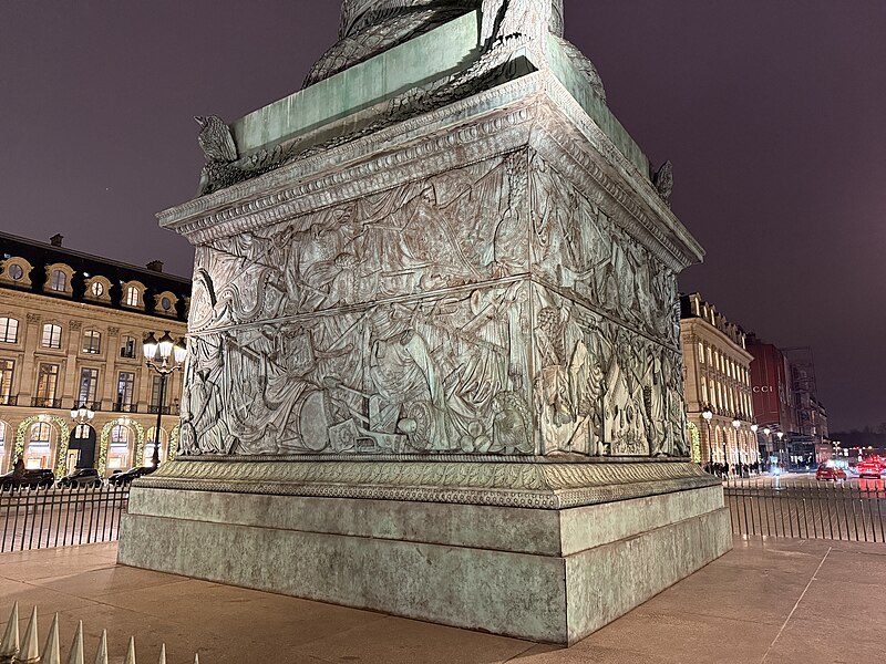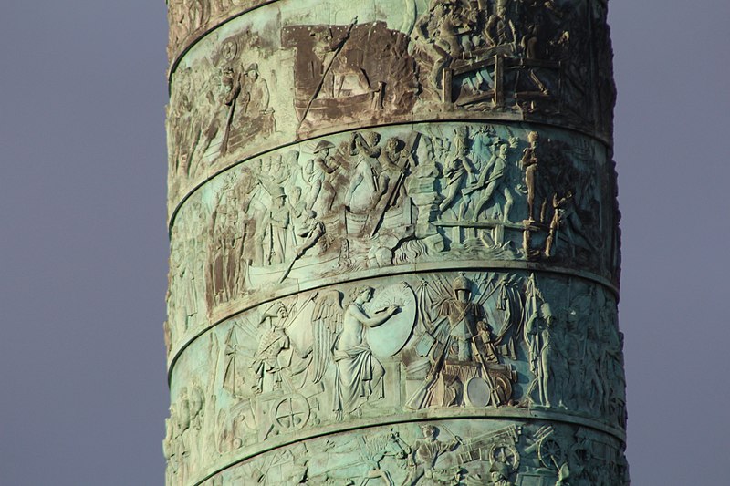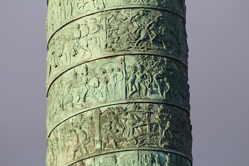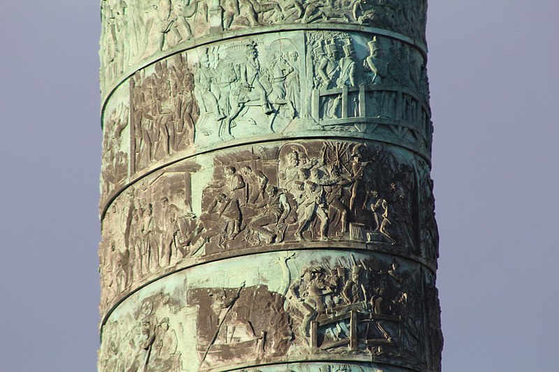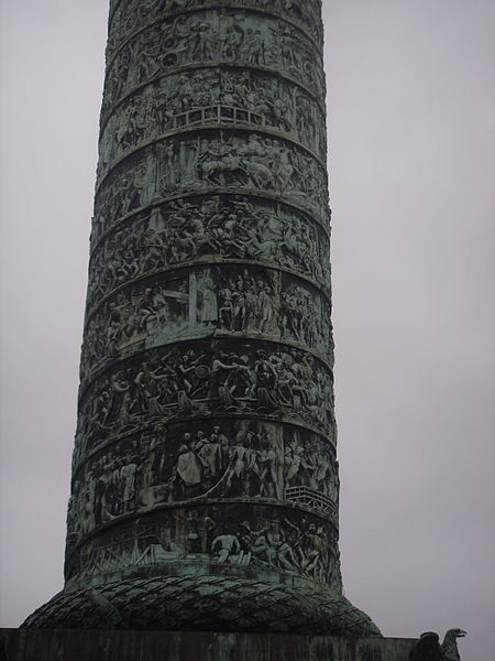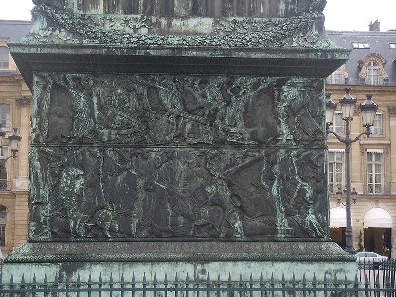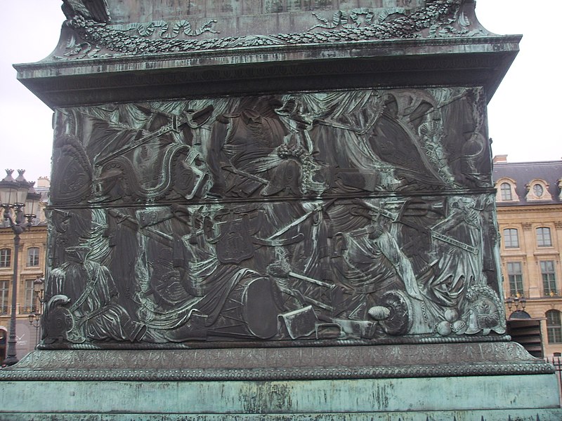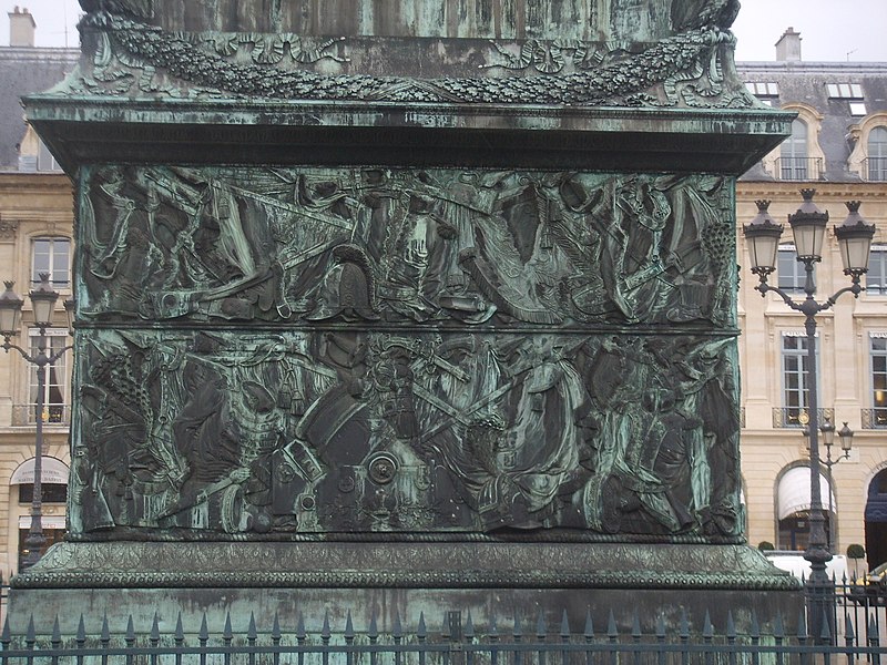 Les dessins des frises furent commandés en 1806 à Pierre-Nolasque Bergeret, François Mazois et Benjamin Zix ; Dominique Vivant Denon distribua la réalisation des sculptures à trente et un artistes, parmi lesquels Lorenzo Bartolini, Pierre-Nicolas Beauvallet, François-Joseph Bosio, Claude Michel dit Clodion, Antoine Denis Chaudet et François Rude. La base est en granite porphyroïde provenant de la carrière d'Algajola en Corse et porte une inscription dédicatoire, rédigée à la manière antique, qui consacre la colonne à la gloire de la Grande Armée et rappelle l'emploi de l'airain conquis sur l'ennemi pendant la guerre d'Allemagne de 1805.