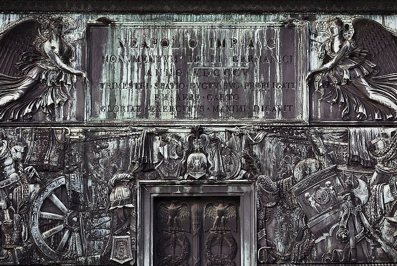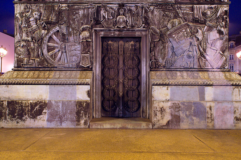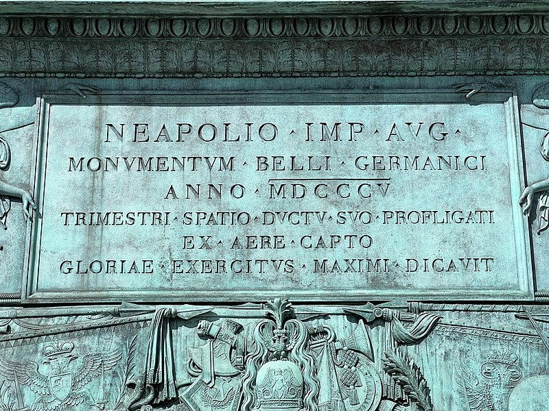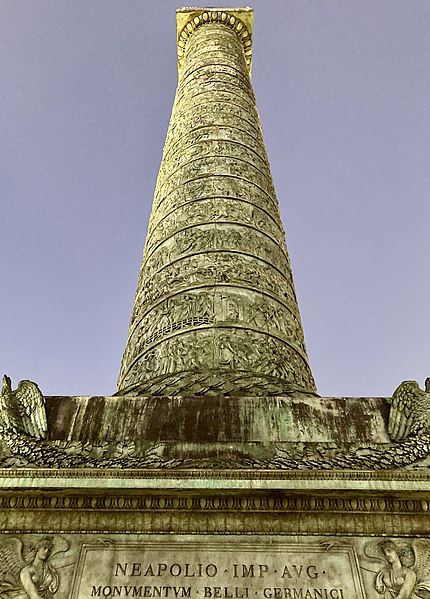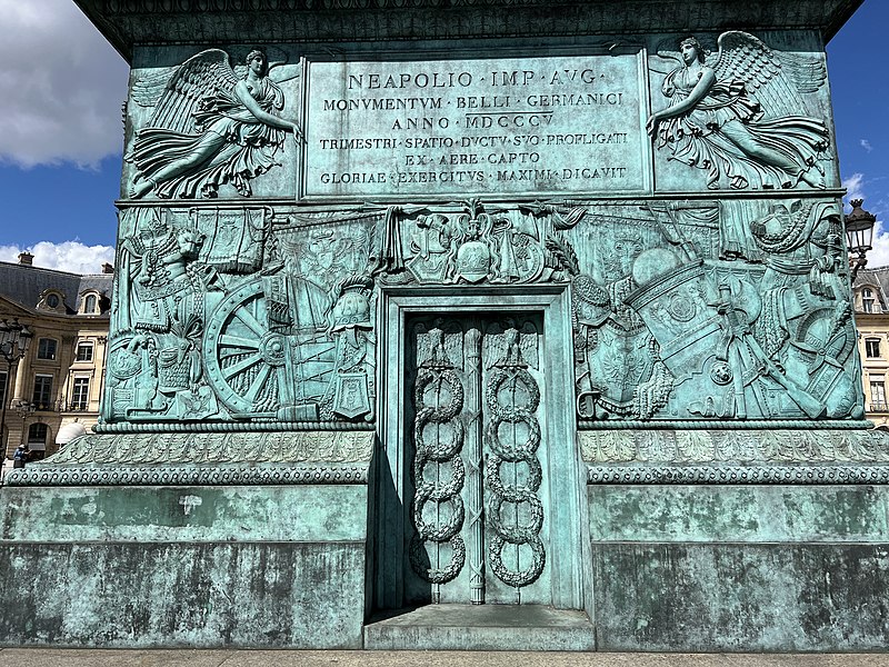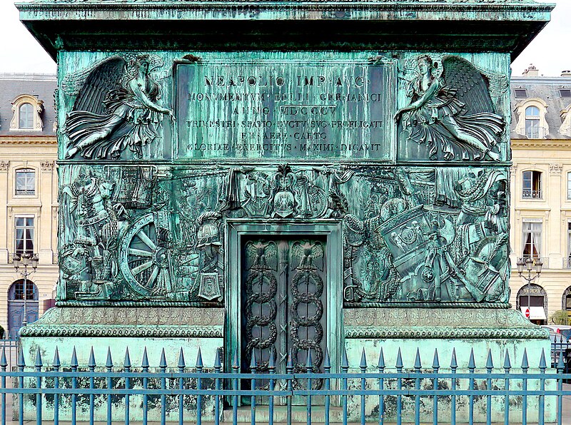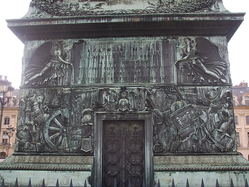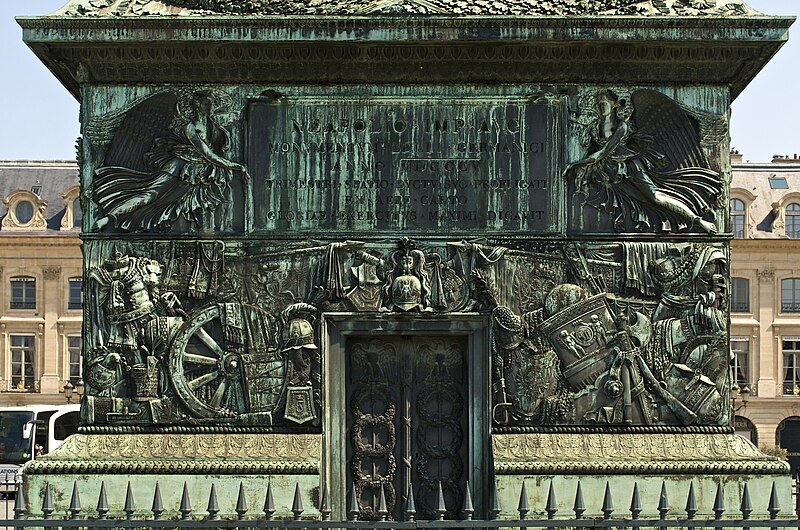 Les dessins des frises furent commandés en 1806 à Pierre-Nolasque Bergeret, François Mazois et Benjamin Zix ; Dominique Vivant Denon distribua la réalisation des sculptures à trente et un artistes, parmi lesquels Lorenzo Bartolini, Pierre-Nicolas Beauvallet, François-Joseph Bosio, Claude Michel dit Clodion, Antoine Denis Chaudet et François Rude. La base est en granite porphyroïde provenant de la carrière d'Algajola en Corse et porte une inscription dédicatoire, rédigée à la manière antique, qui consacre la colonne à la gloire de la Grande Armée et rappelle l'emploi de l'airain conquis sur l'ennemi pendant la guerre d'Allemagne de 1805.