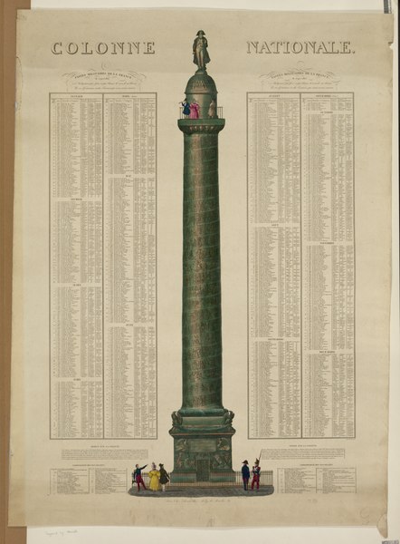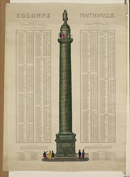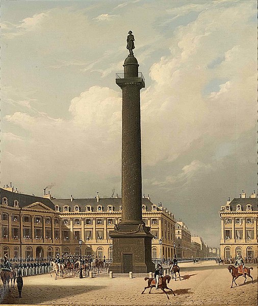 Après la destruction de la statue équestre de Louis XIV, une effigie en plâtre occupa la place entre 1793 et 1800 ; en 1800 la construction d'une colonne fut décidée et, après Austerlitz, les architectes Lepère et Gondouin furent chargés d'édifier le monument. Lors de la Commune de Paris, un décret de démolition aboutit à l'abattage de la colonne le 16 mai 1871 ; les plaques de bronze furent récupérées, le globe de la victoire original disparut et l'événement fut largement documenté par des photographies. Après la chute de la Commune, le président Mac Mahon ordonna la reconstruction ; les travaux, confiés à l'architecte Alfred-Nicolas Normand et à l'entreprise Gaget Gauthier et Cie, furent entrepris en 1873 et achevés en 1875, Courbet ayant été sommé d'en régler le coût selon un échéancier.
