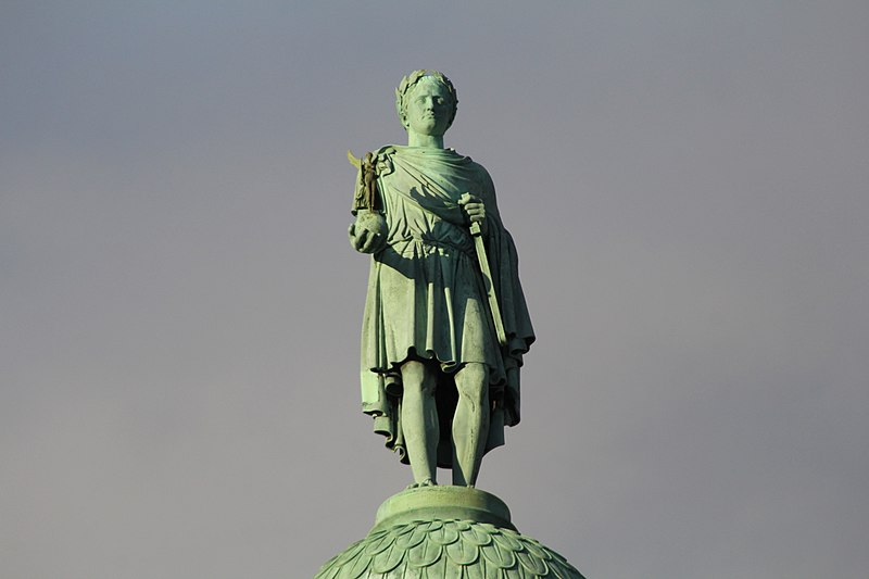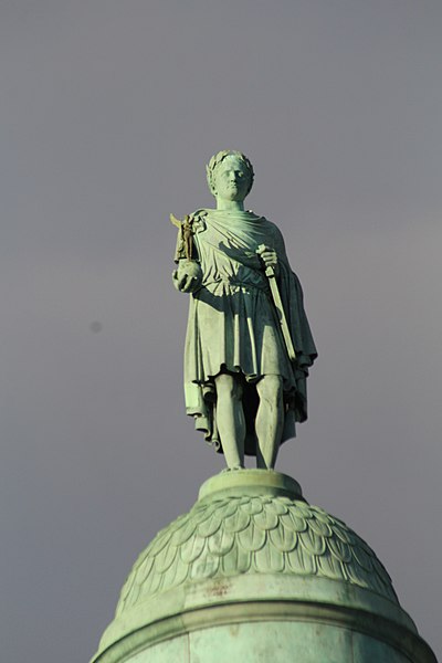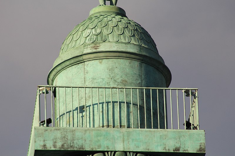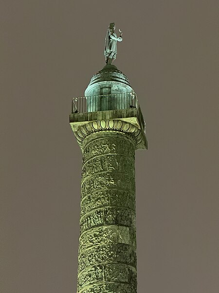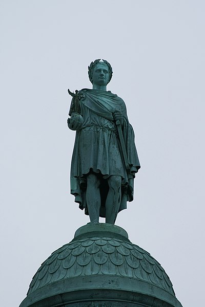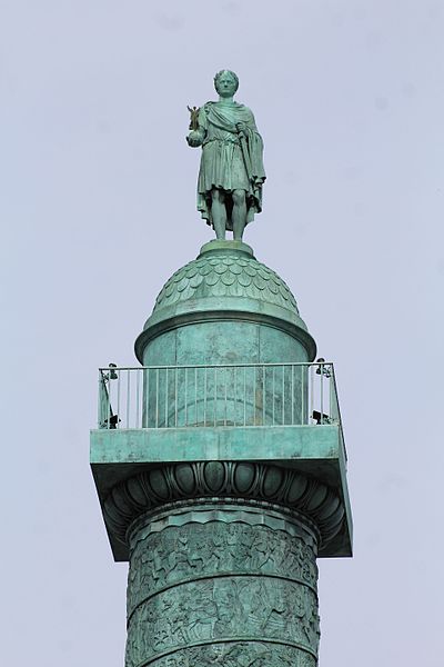 La statue sommitale actuelle, réalisée par Auguste Dumont au Second Empire, représente Napoléon en empereur romain, drapé et tenant l'épée et le globe de la victoire ; c'est la troisième effigie installée au sommet. La première, en César par Antoine Denis Chaudet, fut coulée en 1808 et placée en 1810, puis descendue en 1814 et fondue en 1818; seul le globe fut conservé. Sous la monarchie de Juillet, Charles-Émile Seurre plaça en 1833 une statue en « petit caporal », qui se trouve depuis 1911 dans la cour d'honneur des Invalides. Napoléon III fit ensuite remplacer cette effigie par une copie de la statue de Chaudet réalisée par Dumont, inaugurée en 1863, restaurée et réinstallée en 1875 ; c'est cette statue qui demeure aujourd'hui.