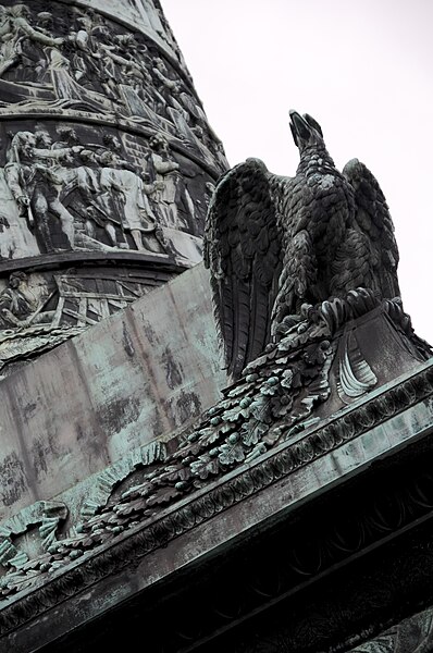 Haute de 44,3 mètres et d'environ 3,60 mètres de diamètre moyen, la colonne repose sur un piédestal et est surmontée d'une statue de Napoléon Ier. Inspirée de la colonne Trajane à Rome, son fût est constitué de 98 tambours de pierre recouverts d'un parement de bronze et percé en son centre d'un escalier intérieur de 180 marches, large de 93 cm, qui mène à une plate-forme sous la statue. Le parement a été coulé avec le bronze provenant de canons pris aux armées autrichienne et russe, un chiffre longtemps exagéré par la propagande. Le décor en bas-reliefs, réalisé à la manière antique, s'enroule en spirale continue sur 22 révolutions : il s'étire sur 280 mètres, comprend 425 plaques de bronze formant 76 bas-reliefs et illustre la campagne de 1805, depuis le camp de Boulogne jusqu'à la paix de Presbourg.