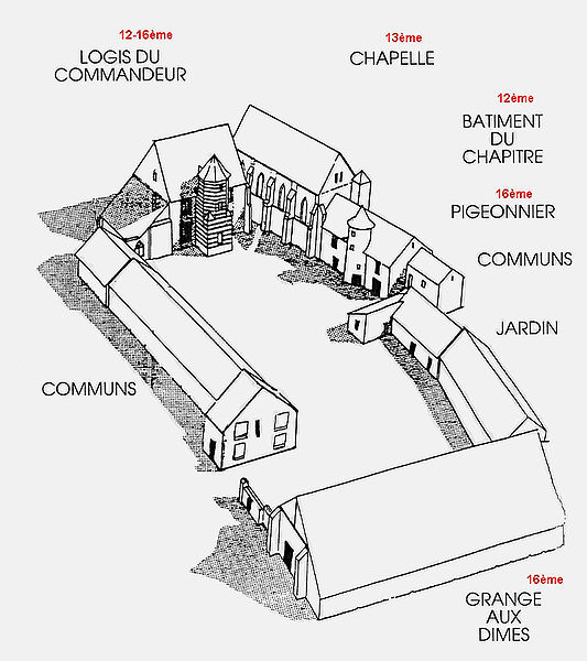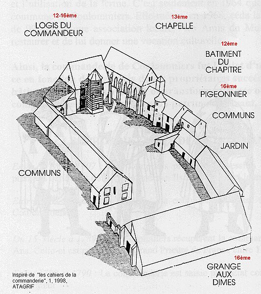 L'ensemble architectural s'organise autour d'une grande cour rectangulaire d'environ 100 × 50 mètres, avec une basse‑cour bordée de granges et une cour d'honneur groupant les bâtiments principaux. Parmi les constructions, la grange aux dîmes, d'origine templière, servait de vaste grenier pour les récoltes ; elle présente des maçonneries en pierre des champs renforcées par des contreforts en grès et une charpente en chêne remaniée par les Hospitaliers. D'autres bâtiments, anciens logements ou ateliers, remplacent des caves médiévales et abritent aujourd'hui des usages contemporains.