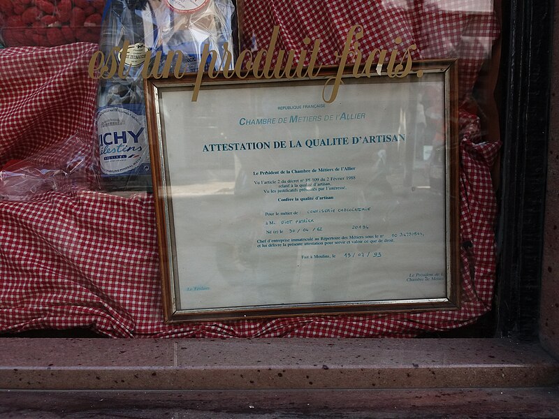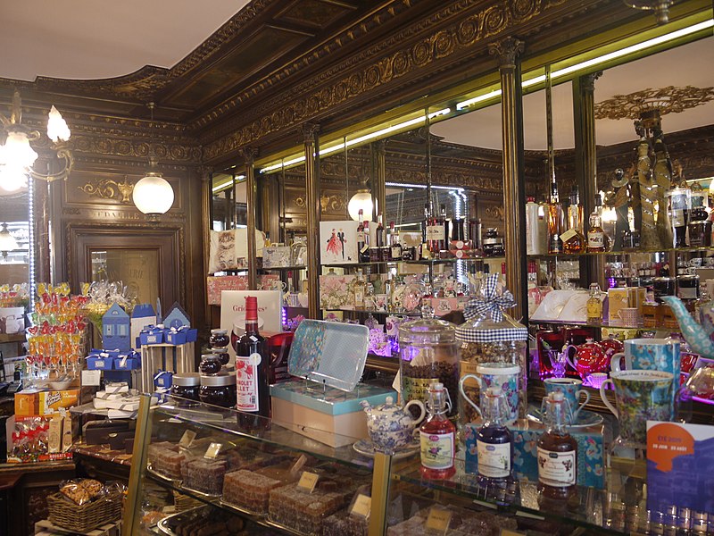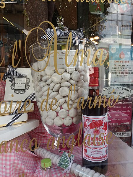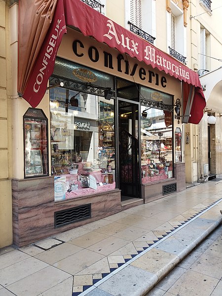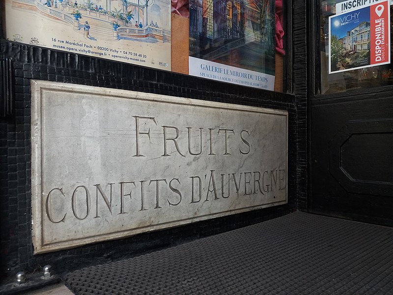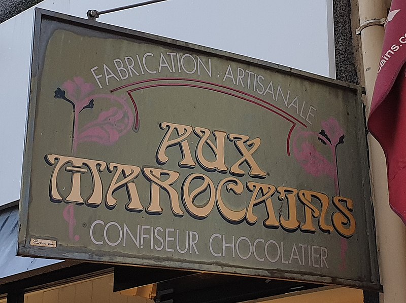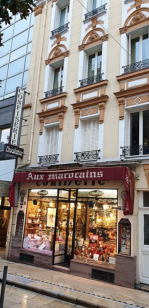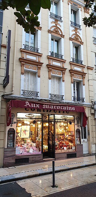 La confiserie Aux Marocains se trouve au 33, rue Georges-Clemenceau à Vichy (Allier, Auvergne-Rhône-Alpes). Créée en 1860, elle est toujours en activité. Son nom provient du bonbon « Le Marocain », variante du Négus de Nevers, créé au début du XXe siècle et encore fabriqué sur place. C'est l'une des rares boutiques de la station thermale subsistant depuis la période prospère du Second Empire, aux côtés notamment de la pharmacie du Parc. L'immeuble a été construit par Amable Bureau ; il y installa sa confiserie au 181, rue de Nîmes (aujourd'hui 33, rue Georges-Clemenceau), près des Quatre-Chemins, pour célébrer la naissance de sa fille en 1868. À sa mort, la direction passa à sa fille et à son époux, Antoine Prunière, qui rebaptisa l'établissement « Confiserie générale » et fit probablement aménager l'intérieur de style Second Empire, comme l'atteste l'inscription « Confiserie générale A P » sur le verre dépoli des portes. En 1902, la confiserie fut vendue à Henri Martin, confiseur de Nevers, qui introduisit la recette du Négus et adapta la spécialité en un caramel moelleux au café ou au chocolat entouré de sucre glacé, nommé « Le Marocain » en référence à la clientèle nord-africaine fréquentant la station. Reprise en 1929 par le chocolatier suisse Alfred Luthy, la boutique vit sa devanture refaite dans un style Art déco ; Luthy déposa la marque « Le Marocain » en 1933. Lors de la libération de Vichy, un dégât des eaux causé par le salon de coiffure situé à l'étage détruisit le plafond couleur vert d'eau et ses ornements en forme de libellules. La façade, la boutique avec sa devanture et le décor intérieur, notamment les trois comptoirs à présentoir, ont été inscrits à l'inventaire supplémentaire des monuments historiques par arrêté du 10 septembre 1990. Depuis 1992, les confiseurs Valérie et Patrick Diot sont propriétaires de la boutique. La documentation disponible comprend des photographies de l'immeuble avec la boutique au rez-de-chaussée, de la façade des années 1930, du dessus de porte et de l'intérieur.