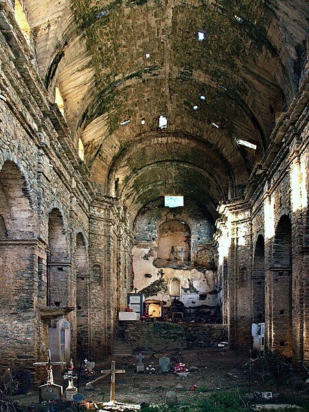L'église primitive consistait en une nef unique avec un chœur profond et des autels latéraux ornés de stucs. Lorsqu'elle fut en ruine, une seconde église fut édifiée ; sa façade principale, scandée de pilastres sur deux niveaux, est couronnée d'un fronton triangulaire.