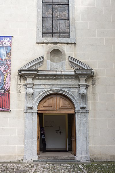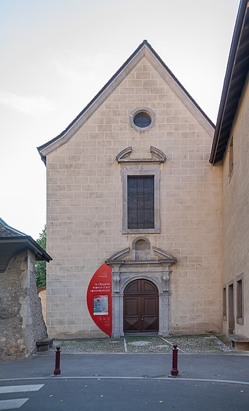 L’église, située au nord‑ouest en bordure de la cour des provisions, est un édifice à nef unique de 22,6 m de long sur 8 m de large, comprenant une nef en trois travées, un chœur de plan carré voûté en arêtes, deux petites chapelles formant les bras du transept et une crypte. À l’ouest, le bâtiment des sœurs tourières, situé entre la rue des Granges et la cour des provisions, faisait office d’interface avec l’extérieur et de limite de la clôture ; il abritait deux « tours », dispositifs cylindriques en bois permettant de faire passer des objets à travers une cloison sans contact direct, ainsi que des parloirs. L’aile ouest du cloître, accolée au sud du chœur, contenait au rez‑de‑chaussée le chœur des religieuses, communicant avec l’église par une grande baie grillagée, et accueillait à l’étage l’infirmerie de la communauté jusqu’au XIXe siècle ; au début du XXIe siècle, l’Académie chablaisienne occupait ses combles. L’aile sud, qui abritait au XVIIe siècle les cellules des religieuses, présentait des inscriptions murales peintes sous forme de sentences tirées de la Bible ou de Thomas d’Aquin ; huit de ces peintures étaient conservées in situ avant les travaux du XXIe siècle.