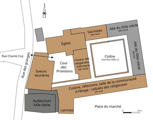 Le site se trouve depuis le centre ancien dans l’axe de la rue Chante‑Coq, bordé par la place du marché au sud et par la rue des Granges à l’ouest ; à l’origine il était implanté extra‑muros, en vis‑à‑vis d’une porte de la ville. Le couvent couvre environ 2 900 m2 et s’organise autour de deux cours intérieures : à l’ouest la cour des provisions et à l’est le cloître. Les bâtiments comportent rez‑de‑chaussée et deux étages, certains avec un niveau de cave, desservis par quatre escaliers ; leur orientation générale est est‑nord‑est / ouest‑sud‑ouest, à l’exception du bâtiment occidental aligné sur la rue des Granges. Une petite place au sud‑ouest a été remplacée par l’auditorium de la médiathèque à la fin des années 2010.