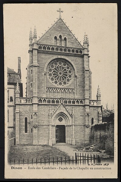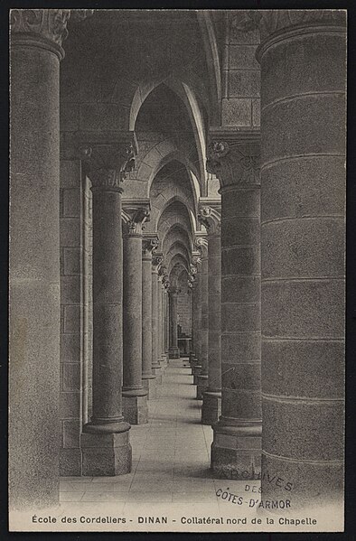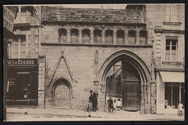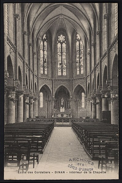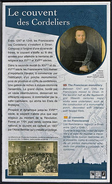 Le couvent des Cordeliers, situé à Dinan dans les Côtes-d'Armor, est un monument religieux datant du XIIIe siècle, bâti par Henri d'Avaugour, seigneur de Dinan. Les Franciscains s'y installent entre 1247 et 1249. En 1278, Henri d'Avaugour prit l'habit et fut enterré dans l'établissement, qui fut édifié sur les ruines d'un château de la famille d'Avaugour à la suite d'un vœu formulé en Terre sainte ; son fils Alain II d'Avaugour poursuivit les travaux. La communauté passa d'une dizaine de frères à une trentaine aux XVe et XVIe siècles. Placé sous le patronage de Notre-Dame des Vertus, le couvent fut construit en 1251. Au XIVe siècle, Charles de Blois fit de nombreux dons qui permirent l'édification de nouvelles salles, de cloîtres et l'acquisition de peintures et tapisseries ; l'une de ces peintures donna lieu à un miracle rapporté, rappelé aujourd'hui par un vitrail de la chapelle. Dans la seconde moitié du XIVe siècle et au XVe siècle, des travaux importants élevèrent un porche monumental orné de pilastres et coiffé de cordelières, couronné d'une galerie de niches à statues. Le grand cloître, bordé d'un vaste déambulatoire, desservait les salles capitulaires qui ont accueilli les États de Bretagne. Prospère jusqu'au XVIIIe siècle, le couvent ne comptait plus que sept religieux au moment de la Révolution ; il fut fermé en 1791 puis vendu comme bien national. Après la Révolution, l'abbé Berthier s'installa dans l'ancien monastère pour y reprendre la tradition du collège ecclésiastique en 1804 et en racheta les bâtiments en 1807. Depuis 1804, l'édifice abrite un établissement d'enseignement privé catholique regroupant un collège et un lycée, aujourd'hui nommé collège-lycée privé catholique des Cordeliers. En 1904, le supérieur abbé Le Fer de la Motte fit bénir une nouvelle chapelle, puis l'application de la loi de séparation de l'Église et de l'État en 1907 entraîna l'expulsion. Le rachat des bâtiments sous le supériorat du chanoine Meinser intervint en 1933, suivi de grands travaux de restauration en 1934-1935. Au XXe siècle furent construits le bâtiment Saint-Joseph en 1956 et le bâtiment Notre-Dame en 1961, et d'importantes rénovations eurent lieu en 1989 (internat, cuisines, CDI, laboratoires, mise aux normes, création d'un laboratoire de langues et d'un espace multimédia). Le mobilier liturgique en argent comprend sept calices, deux croix, quatre chandeliers, un bénitier avec son goupillon, un encensoir avec sa navette, deux ostensoirs, deux ciboires, deux burettes avec leurs plateaux, une lampe de petite taille et un reliquaire. Parmi les anciens élèves figurent le corsaire et armateur Robert Surcouf ; l'écrivain et homme politique François-René de Chateaubriand (élève du collège des Laurents devenu collège des Cordeliers) ; le prélat Eugène Le Fer de La Motte ; l'écrivain Charles Poirier dit Jean Cordelier ; le réalisateur Jean Grémillon ; l'homme politique Constant Monjaret ; le résistant Michel le Prévost ; le Dr Yves Cotrel, inventeur de l'instrumentation Cotrel-Dubousset ; Olivier Gabet, conservateur général du patrimoine ; et Hervé Berville, député puis secrétaire d'État à la mer. Le portail du couvent est classé monument historique depuis 1930.