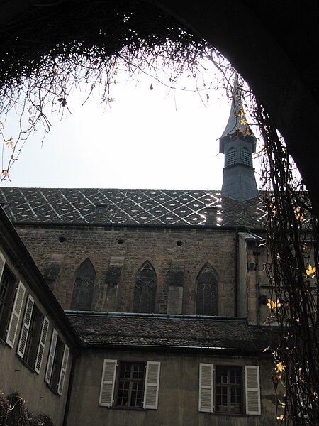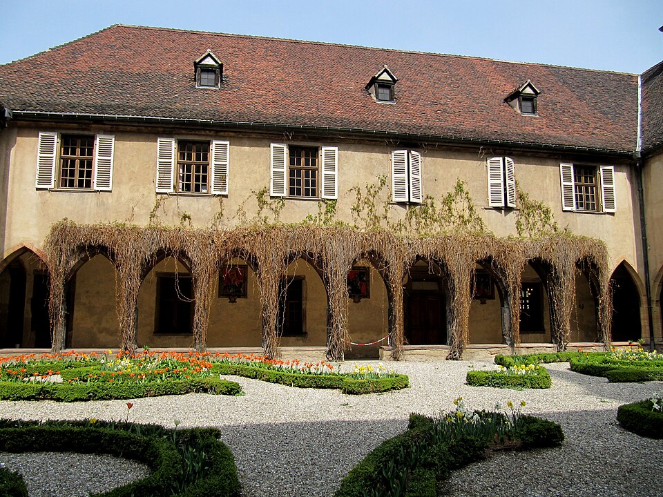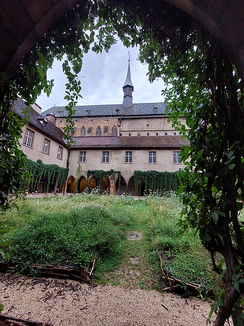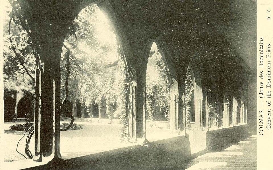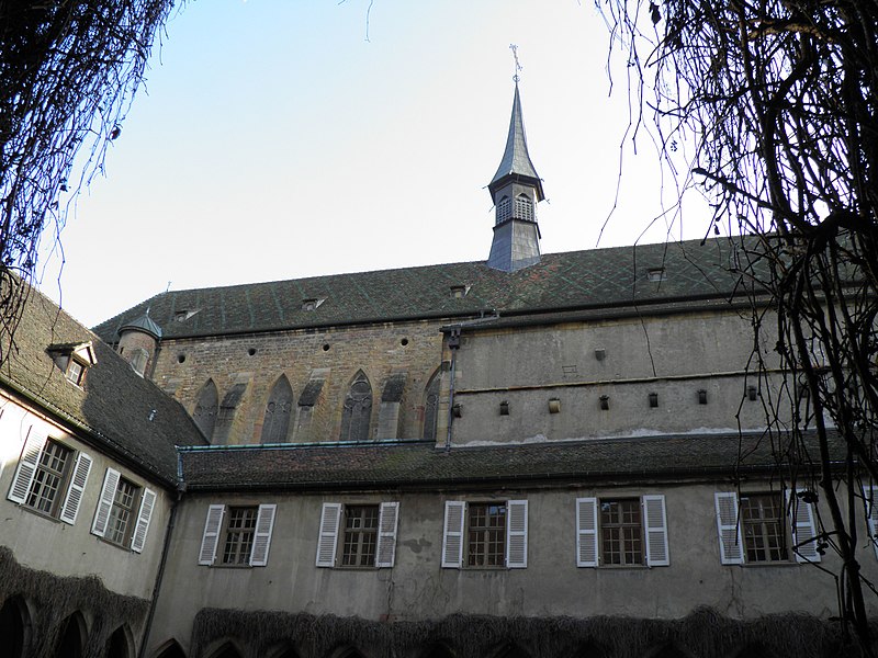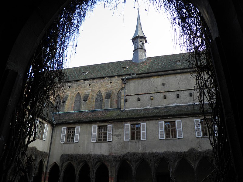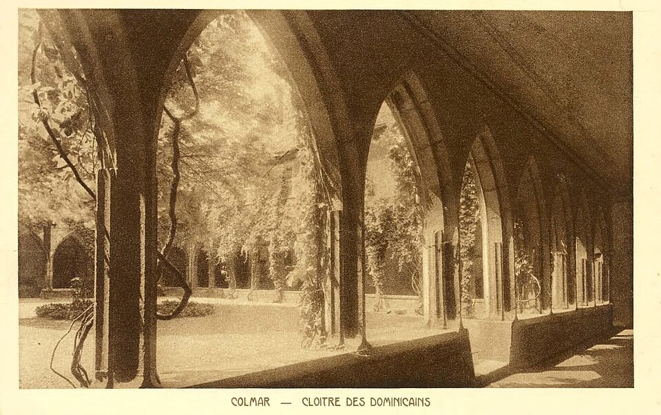 Le couvent des Dominicains de Colmar, également appelé église des Dominicains, se situe place des Dominicains et 1, place des Martyrs-de-la-Résistance, à Colmar (Haut-Rhin). L'église a été bâtie en 1289 par l'ordre mendiant des Prêcheurs, dit Dominicains, arrivé à Colmar vers 1260. Le chœur a été édifié avant 1300, la nef remonte au début du XIVe siècle et a été achevée en 1346. Pendant la Révolution française, l'édifice fut transformé en magasin d'artillerie ; la ville l'acheta en 1807 pour en faire une halle aux blés, puis il fut rendu au culte en 1898. L'église abrite dans son chœur La Vierge au buisson de roses, retable peint par Martin Schongauer en 1473, ainsi qu'une série de vitraux du XIVe siècle. Le cloître, la partie la plus ancienne, date du XIIIe siècle ; il subit un incendie en 1458 et conserve des peintures murales de la fin du XVe siècle illustrant le cycle de la Passion. Les bâtiments conventuels, élevés vers 1300 et reconstruits au XVIIIe siècle, furent transformés en caserne de gendarmerie de 1795 à 1871, utilisés comme école préparatoire d'instituteurs de 1873 à 1940, puis accueillent depuis 1951 la bibliothèque municipale. Le cloître et l'église sont classés au titre des monuments historiques depuis le 2 novembre 1948. L'église présente un chœur voûté de cinq travées, une abside à cinq pans d'octogone et une nef de six travées ; sa structure repose sur de frêles colonnes sans chapiteaux et un plafond en bois, offrant un intérieur volontairement austère mais lumineux. Les vitraux du début du XIVe siècle représentent des scènes de la vie du Christ. Le cloître se compose d'arcades sans réseau articulées autour d'un rectangle irrégulier. Parmi les éléments remarquables figurent le retable de Schongauer, des fresques du XVe siècle et des stalles de chœur du XVIIe siècle. Des vues photographiques montrent l'église de nuit, le bâtiment depuis le cloître et la Vierge au buisson de roses. Le site associe aujourd'hui valeurs religieuses, patrimoniales et culturelles, la bibliothèque municipale occupant les anciens bâtiments conventuels.
